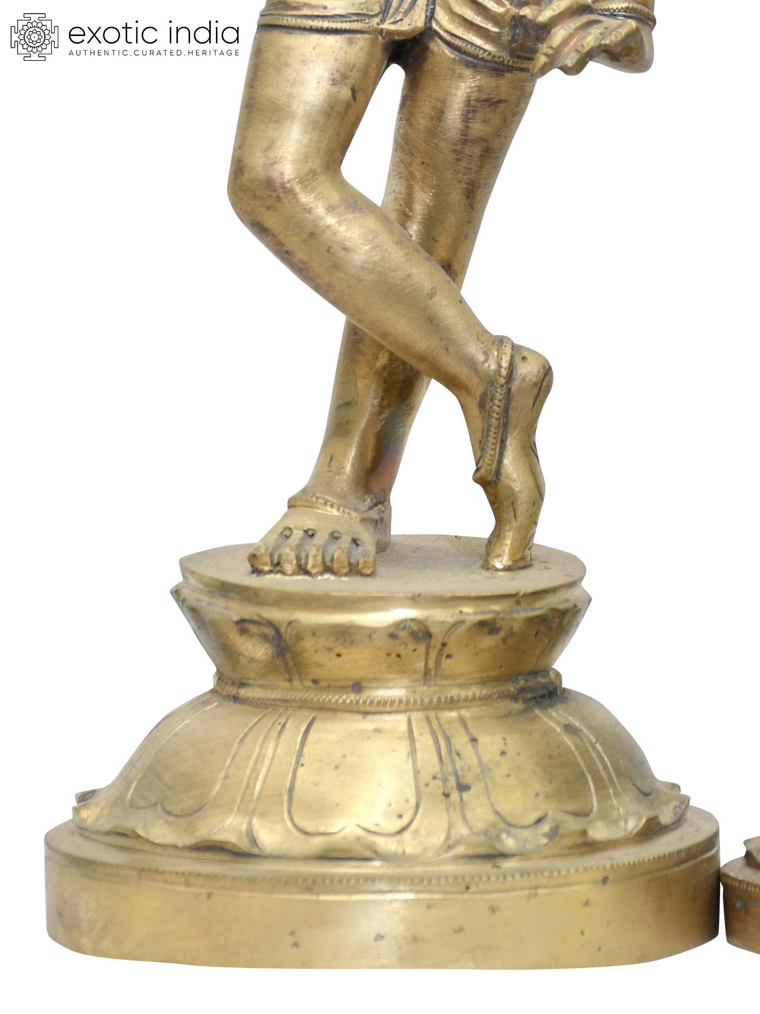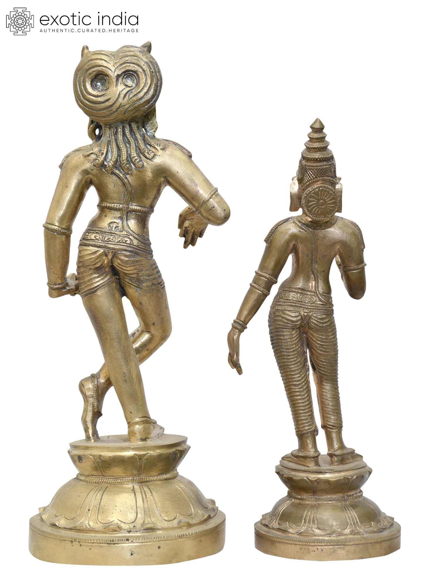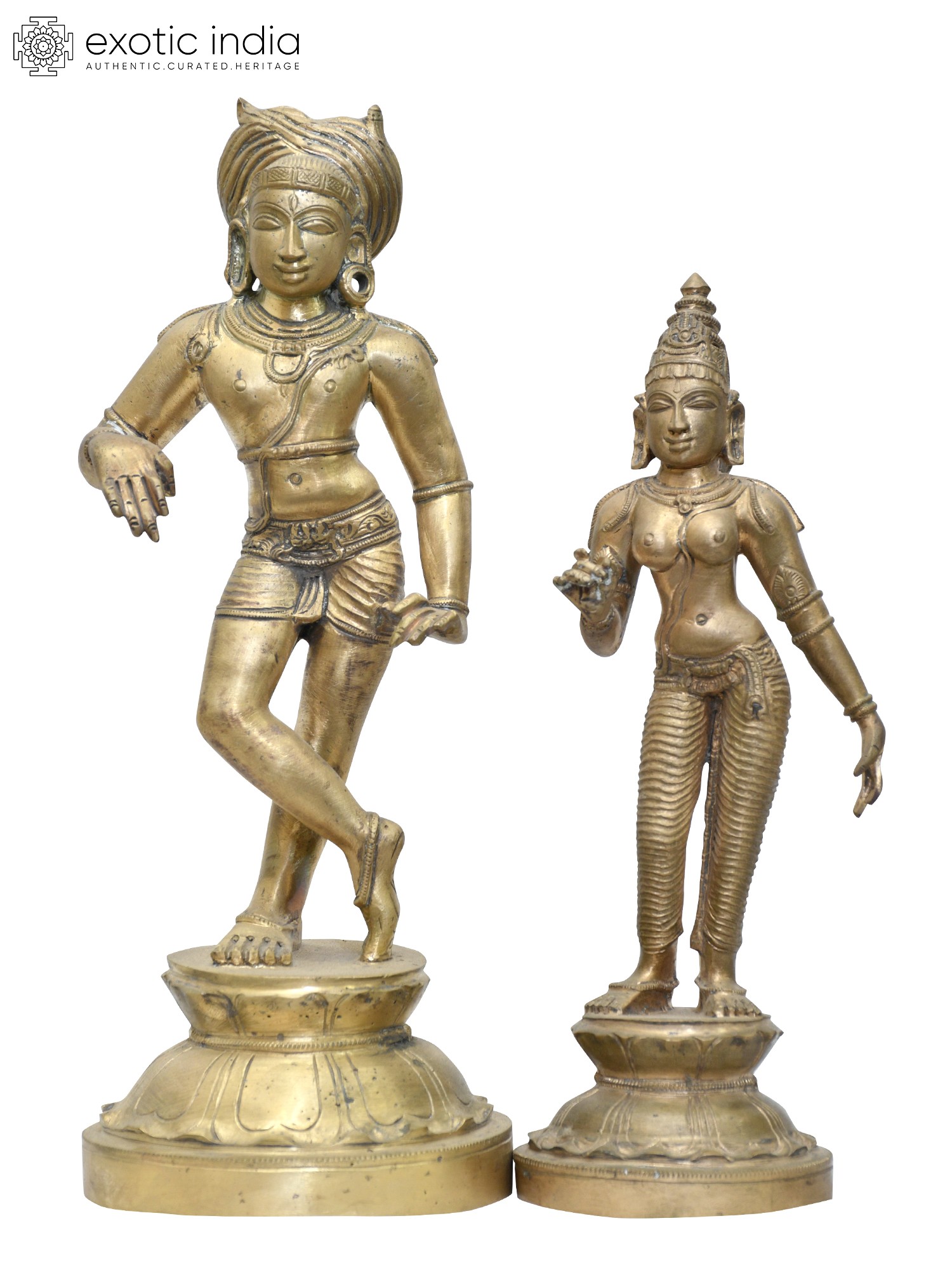 This stunning artwork is a testament to the ancient "Madhuchista Vidhana," or lost-wax casting technique. Skillfully handcrafted in Swamimalai, India, a town renowned for its generations of bronze artisans, each piece is unique. The sculpture is made of "Panchaloha," a traditional alloy of five sacred metals – gold, silver, copper, zinc, and iron. The use of Panchaloha is believed to imbue the sculpture with positive energy and spiritual significance, making it a prized possession for devotees and art enthusiasts alike. The meticulous detailing, from the intricate ornamentation to the graceful postures, reflects the dedication and artistry of the craftsmen who poured their heart and soul into creating this divine representation.