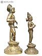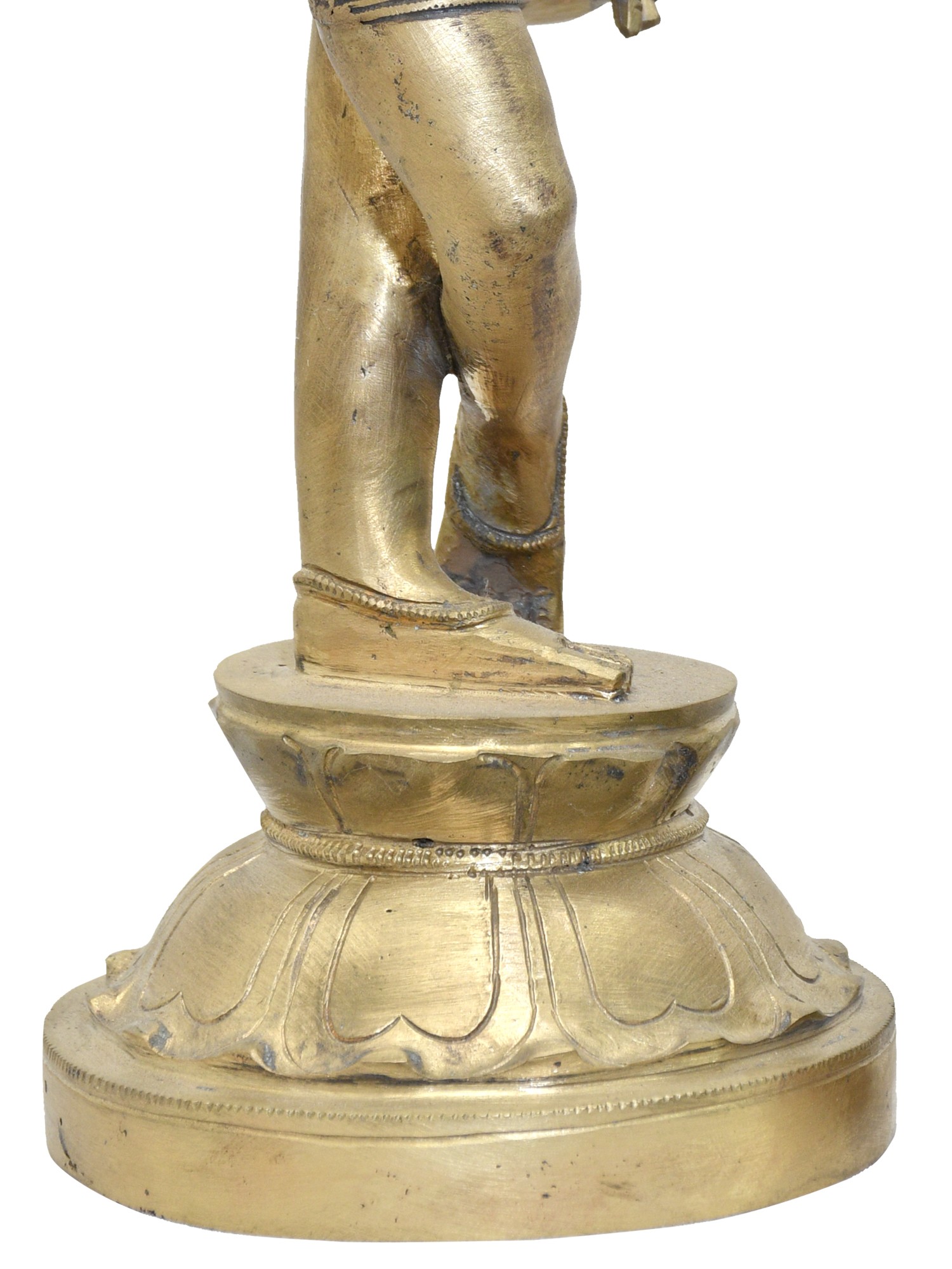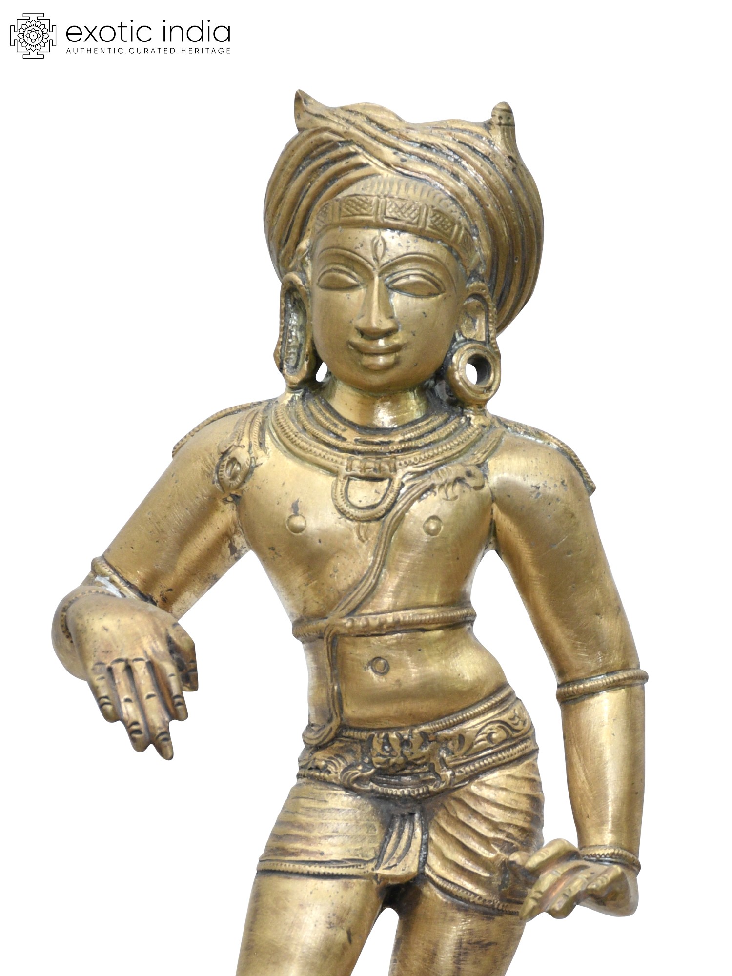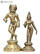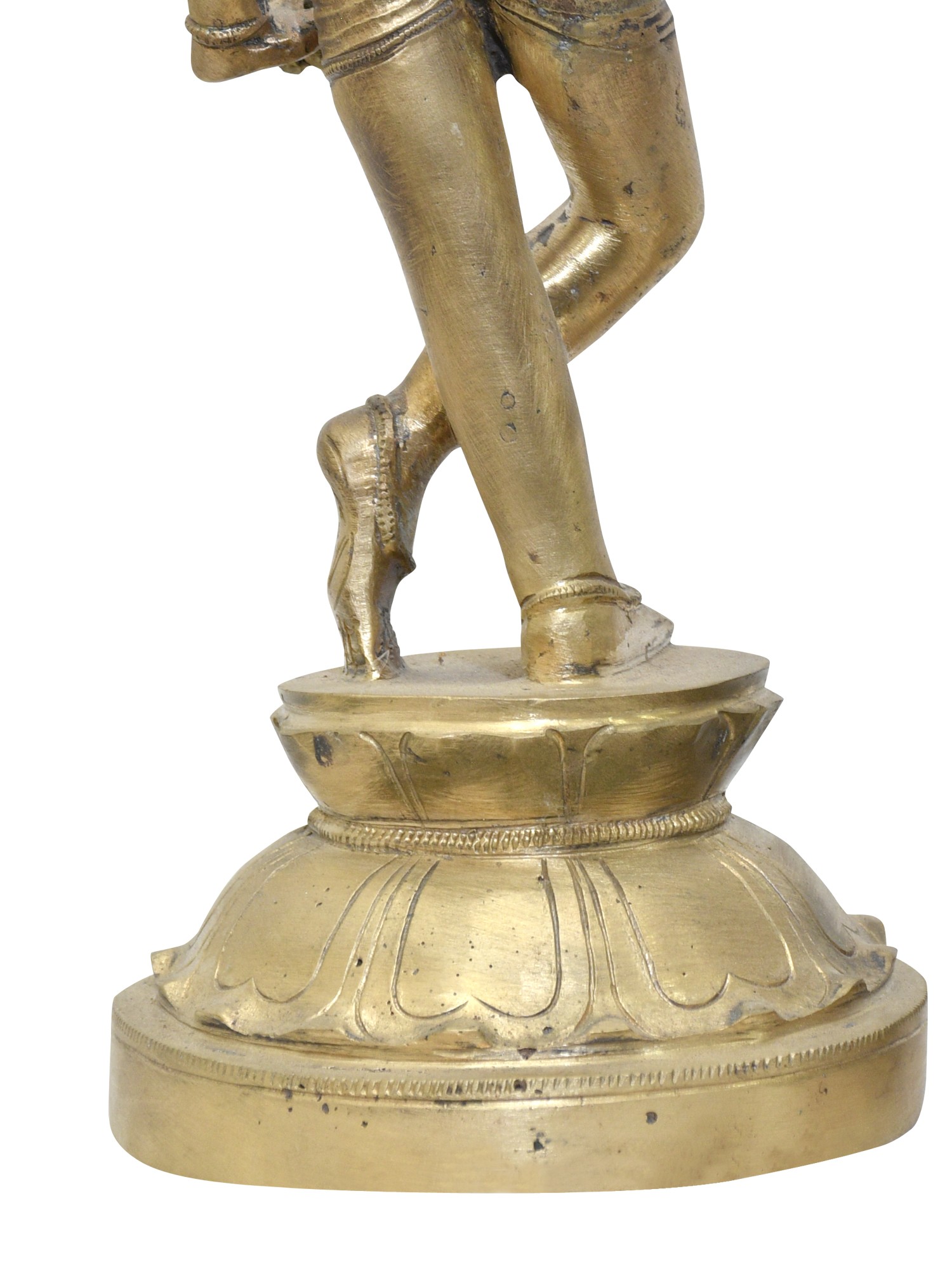 This stunning artwork is a testament to the ancient "Madhuchista Vidhana," or lost-wax casting technique. Skillfully handcrafted in Swamimalai, India, a town renowned for its generations of bronze artisans, each piece is unique. The sculpture is made of "Panchaloha," a traditional alloy of five sacred metals – gold, silver, copper, zinc, and iron. The use of Panchaloha is believed to imbue the sculpture with positive energy and spiritual significance, making it a prized possession for devotees and art enthusiasts alike. The meticulous detailing, from the intricate ornamentation to the graceful postures, reflects the dedication and artistry of the craftsmen who poured their heart and soul into creating this divine representation.