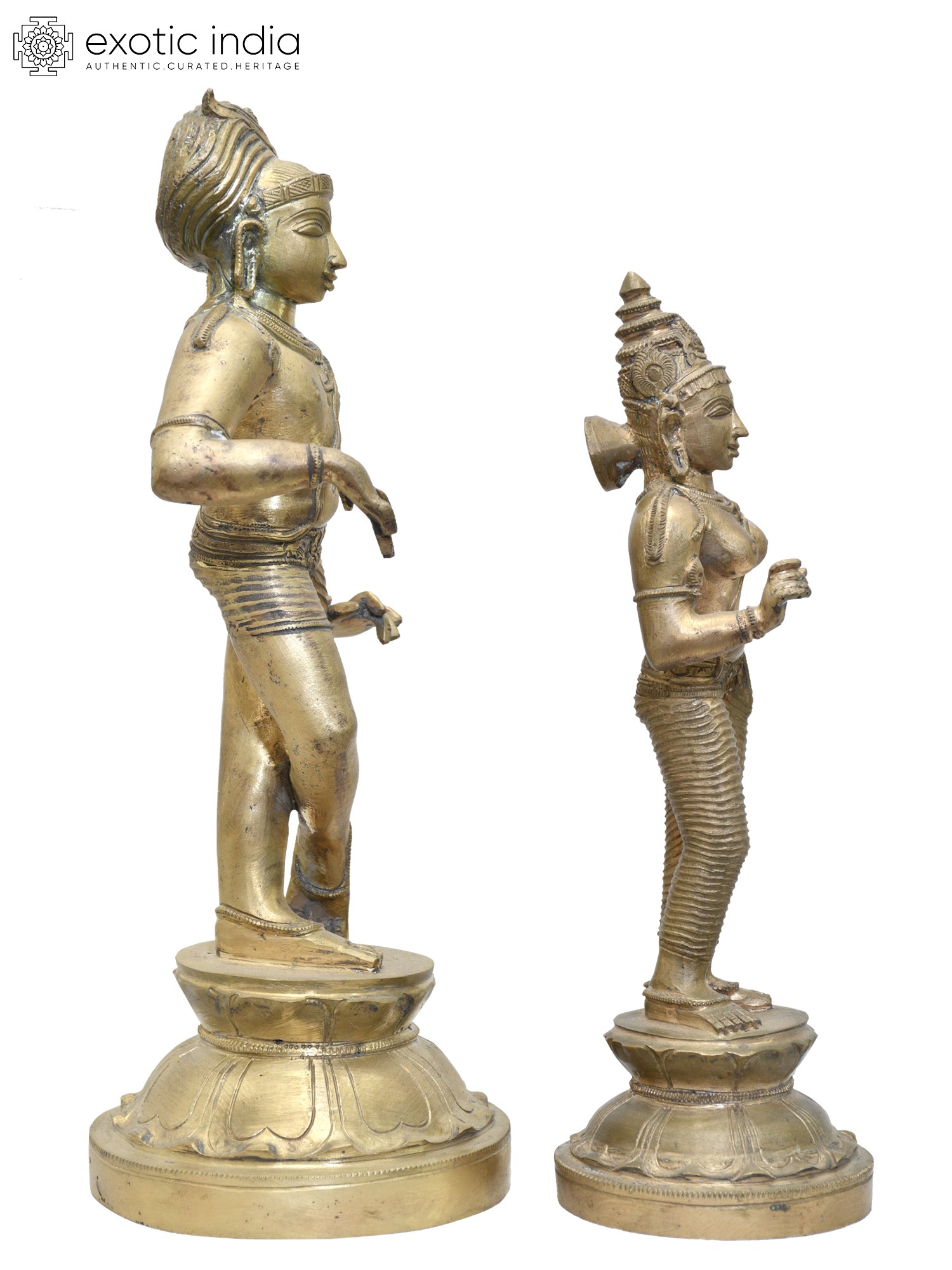 Behold the embodiment of cosmic unity, the divine pair Shiva and Parvati, brought to life in the rich tradition of Swamimalai bronze casting. This exquisite sculpture presents Shiva, the destroyer and transformer, alongside Parvati, the embodiment of Shakti, the divine feminine energy. Their combined presence represents the perfect balance, the source of creation, preservation, and dissolution in the universe. Shiva, often depicted as an ascetic and a dancer, embodies both detachment and boundless energy. Parvati, in her gentle yet powerful form, is the nurturer, the provider, and the source of all love and compassion. Together, they are the ultimate symbol of marital harmony and spiritual partnership.