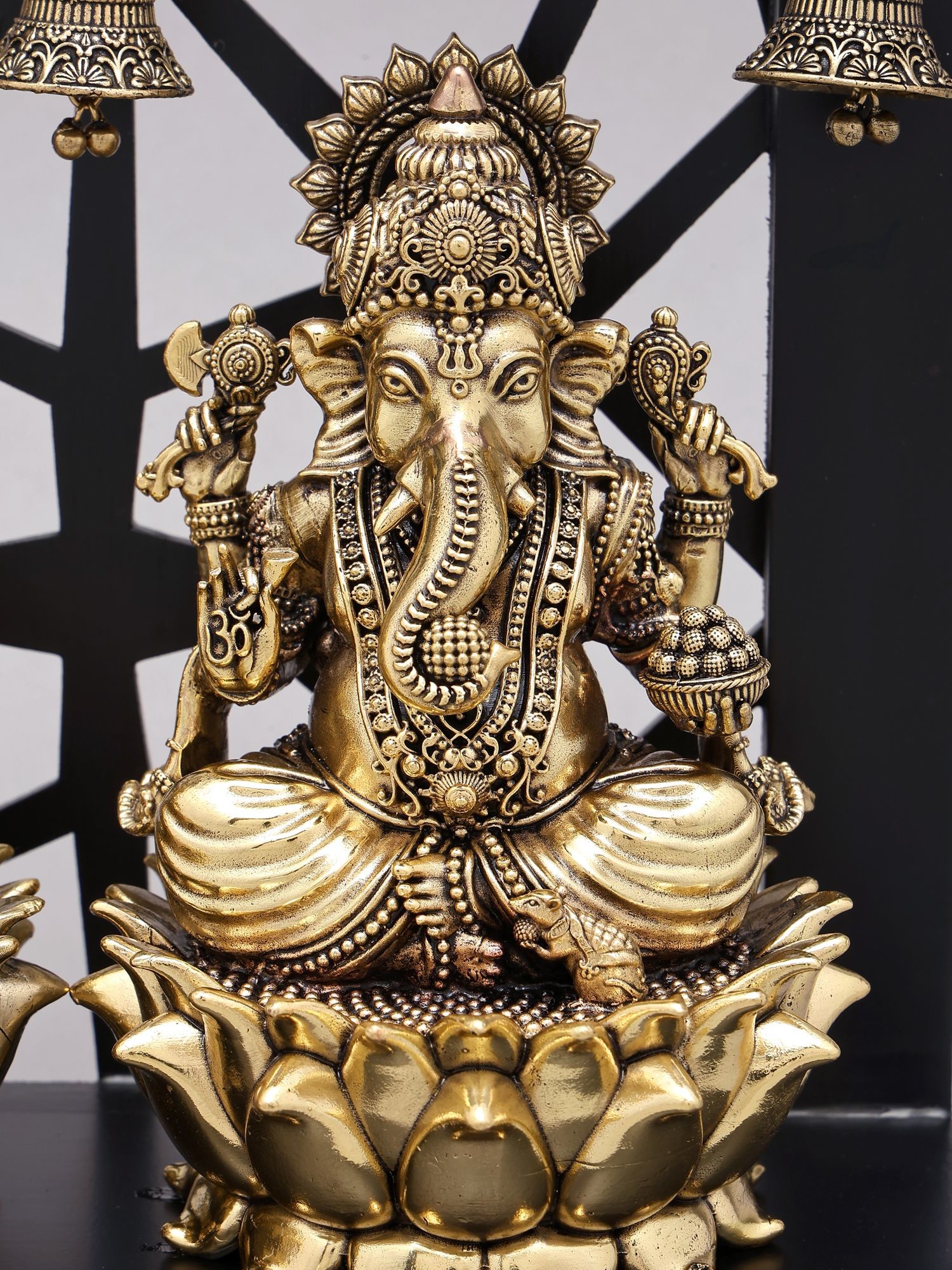 12" Chaturbhuja Lord Ganesha with Lamps and Bells | Brass Statue on Wood Base