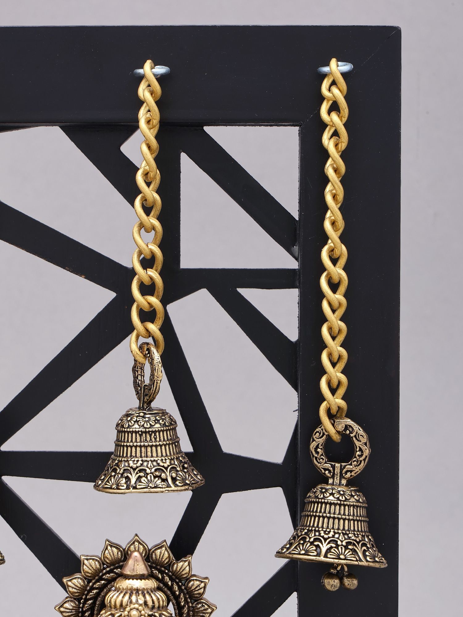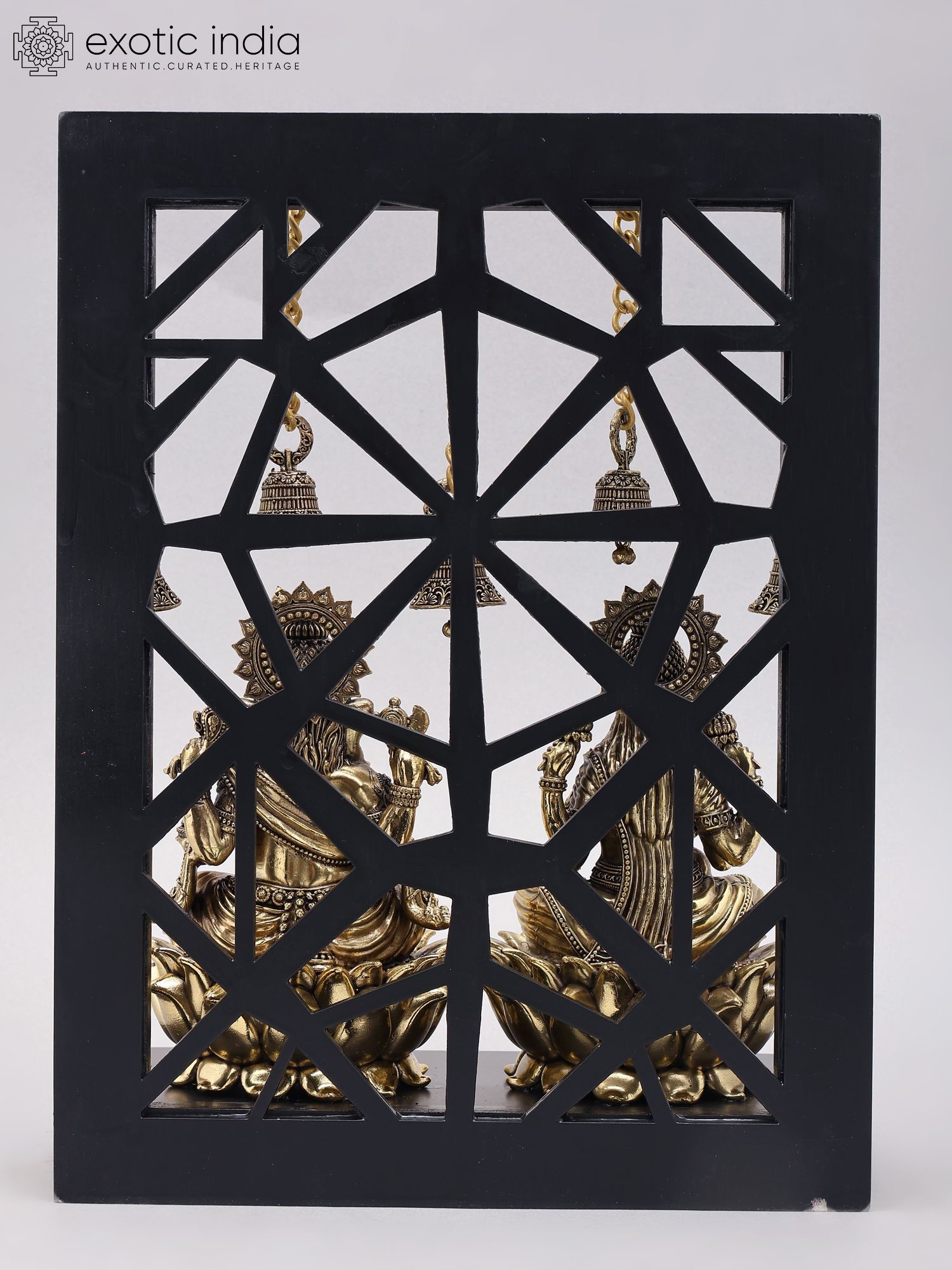 17" Divine Trinity: Lakshmi, Ganesha, Saraswati Brass Sculptures with Bells | Wood Framed Wall Hanging