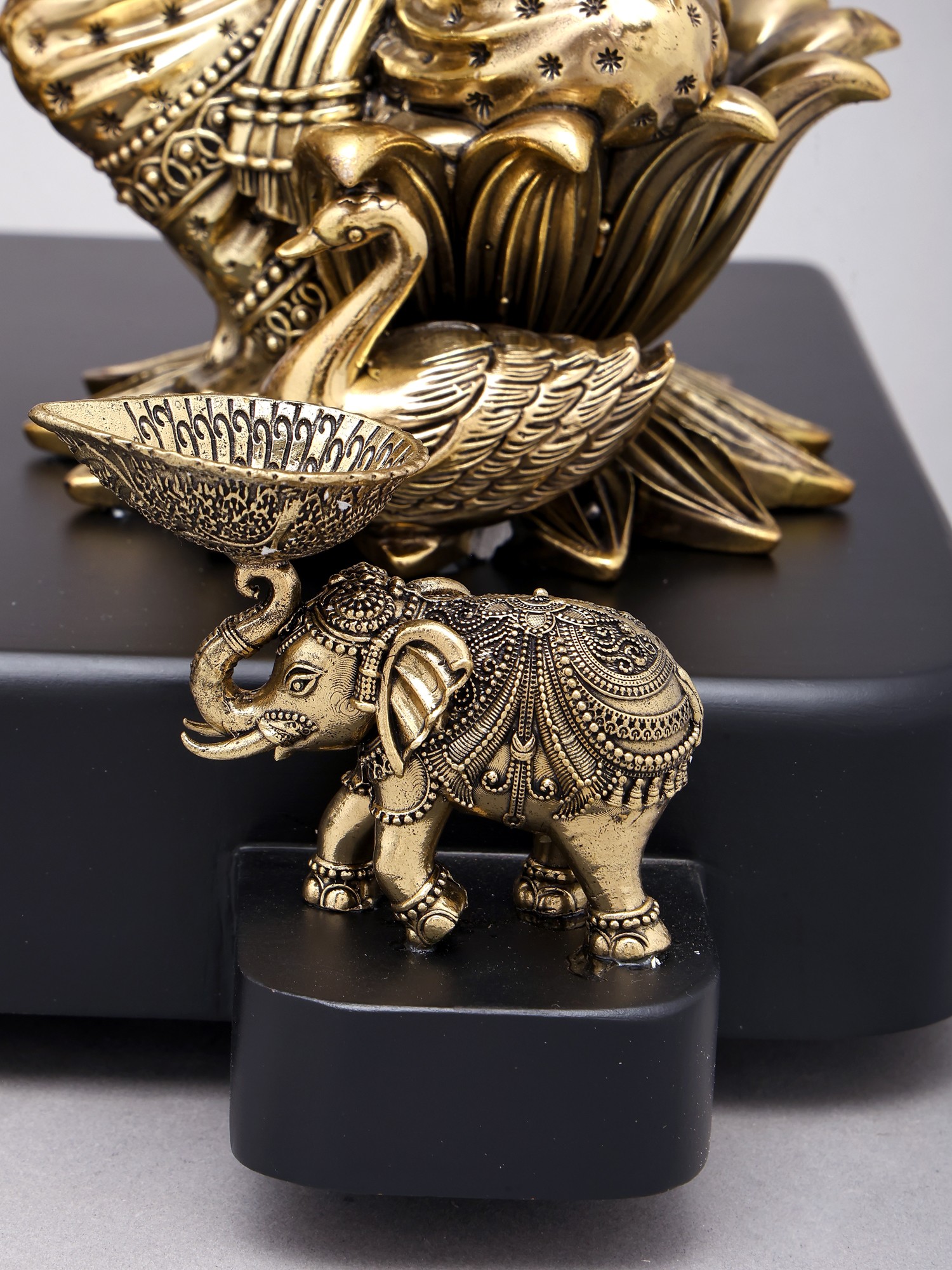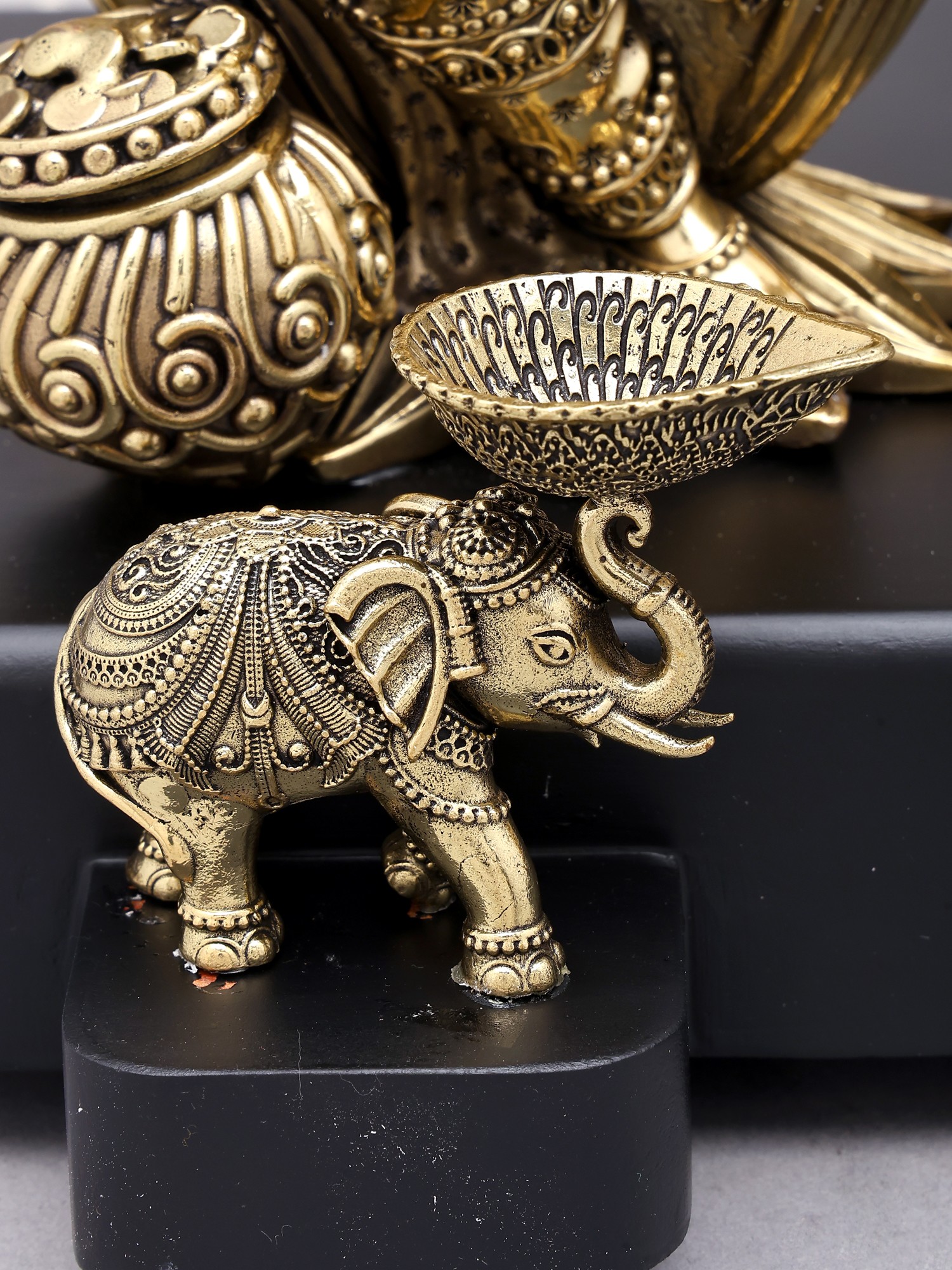 The set includes two small, ornate brass elephants flanking the central deities, symbolizing strength and good fortune.