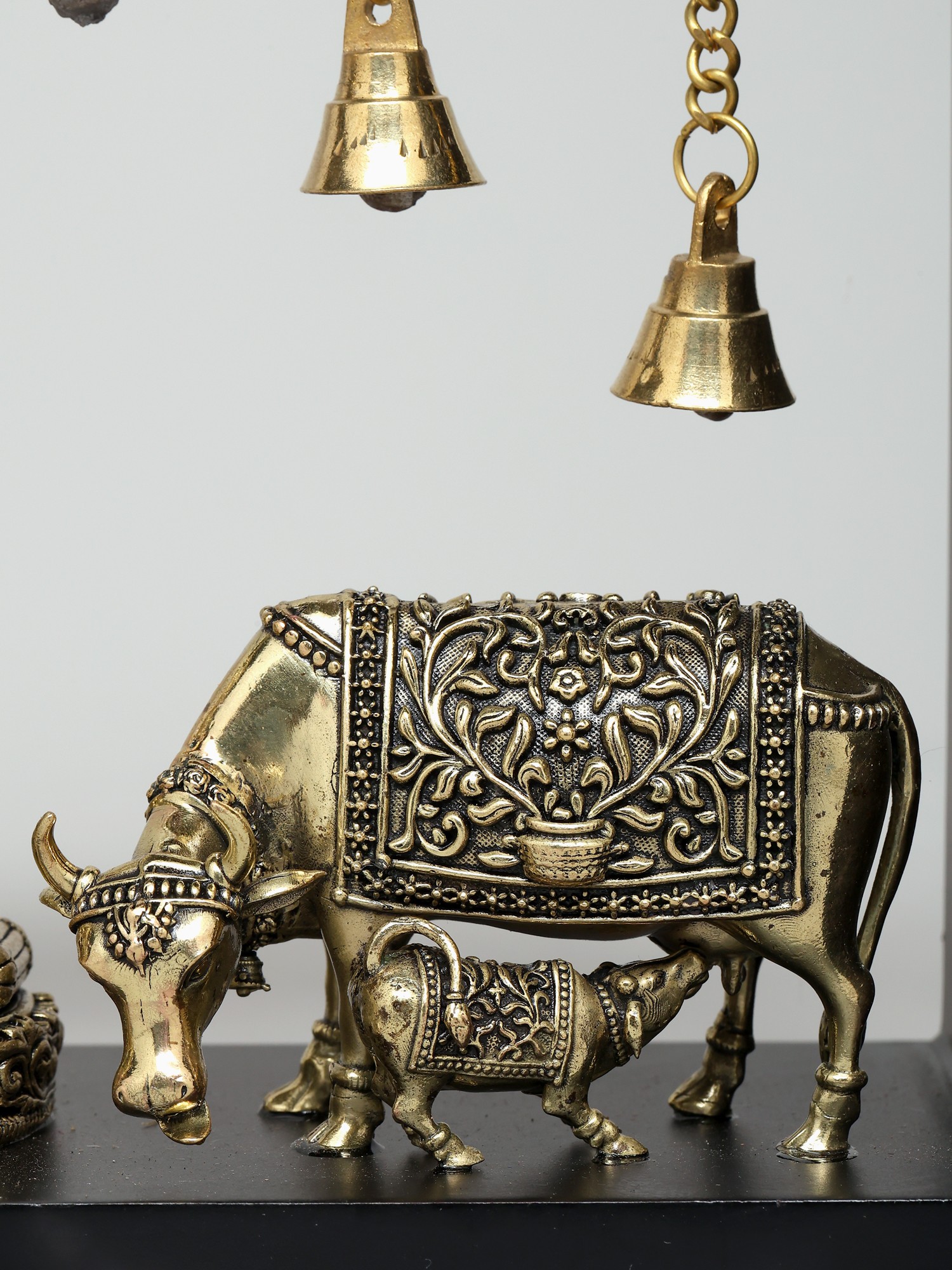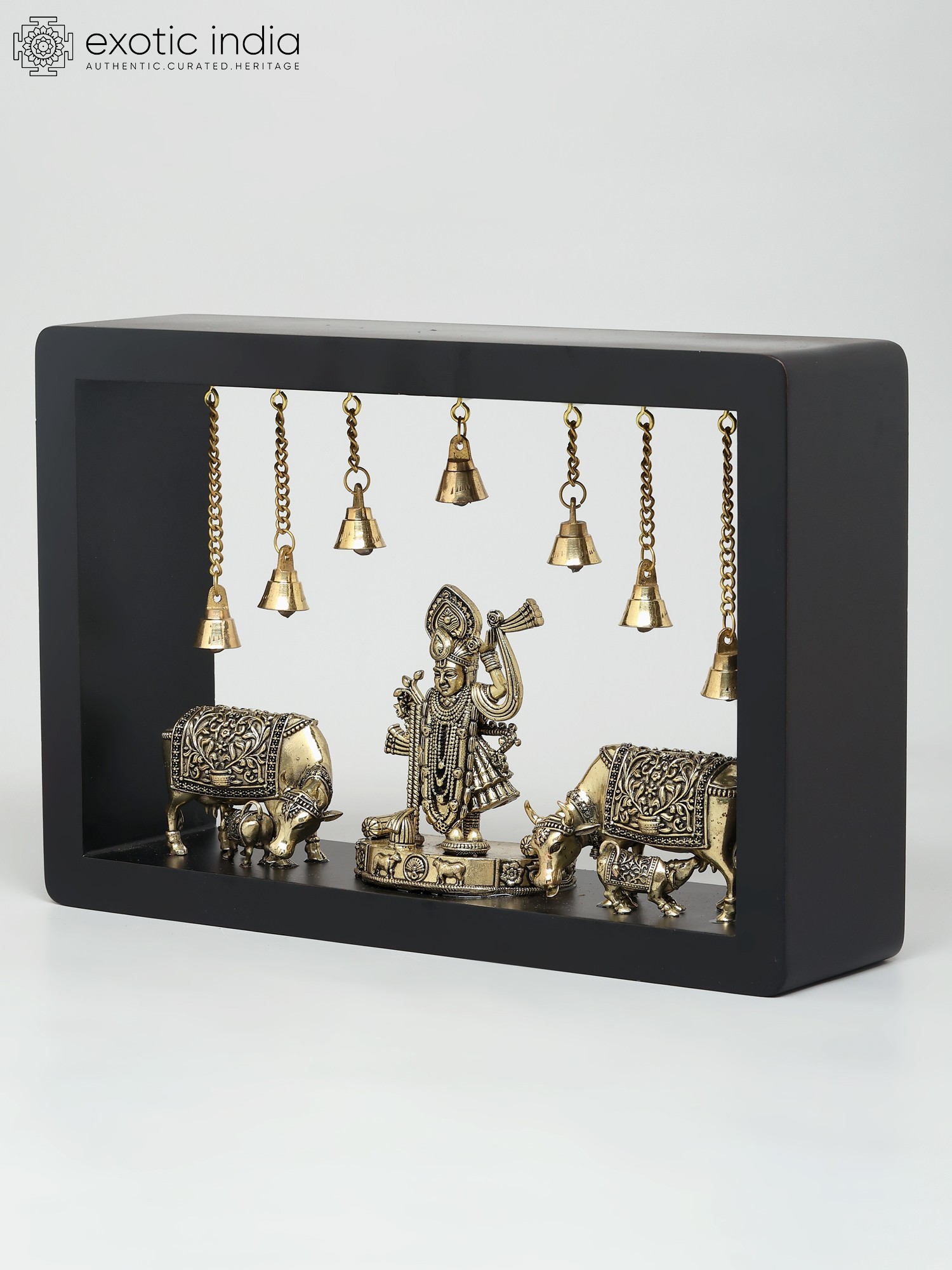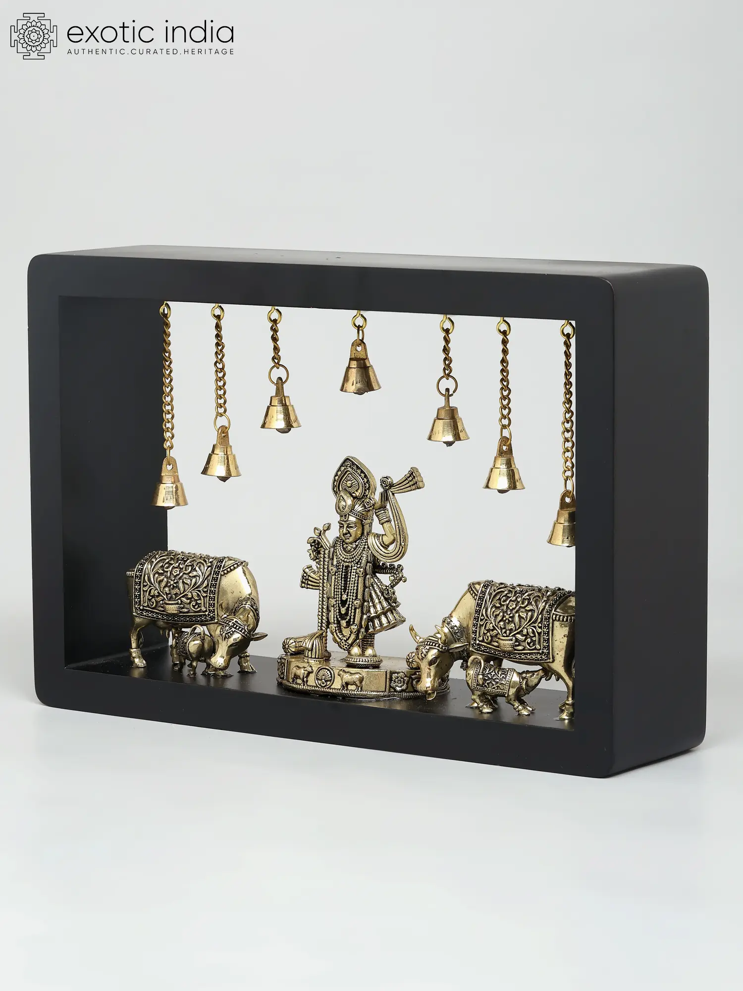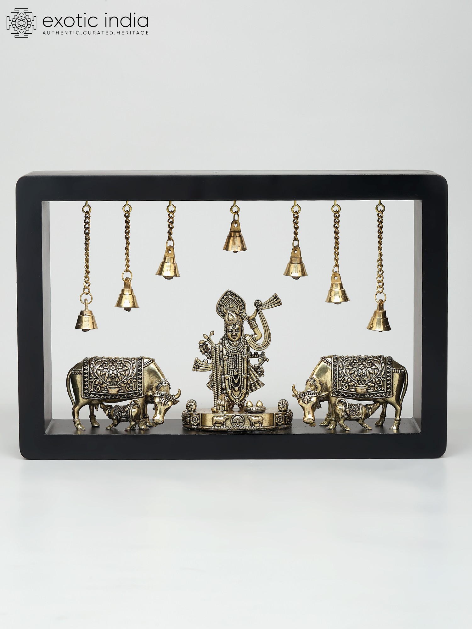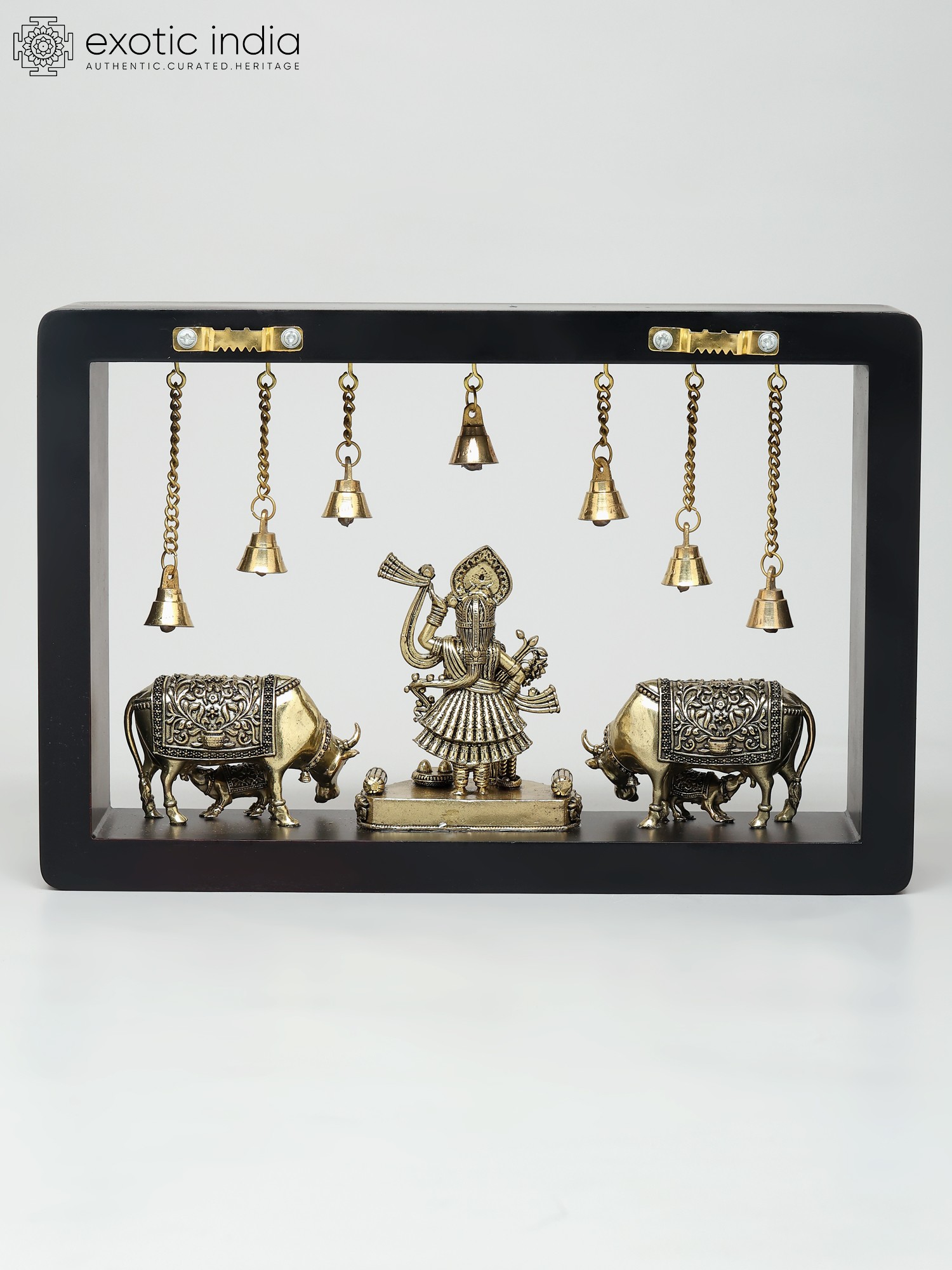 12" Superfine Sitting Lakshmi Ganesha with Dangling Bells | Wood Framed Brass Sculptures | Wall Hanging