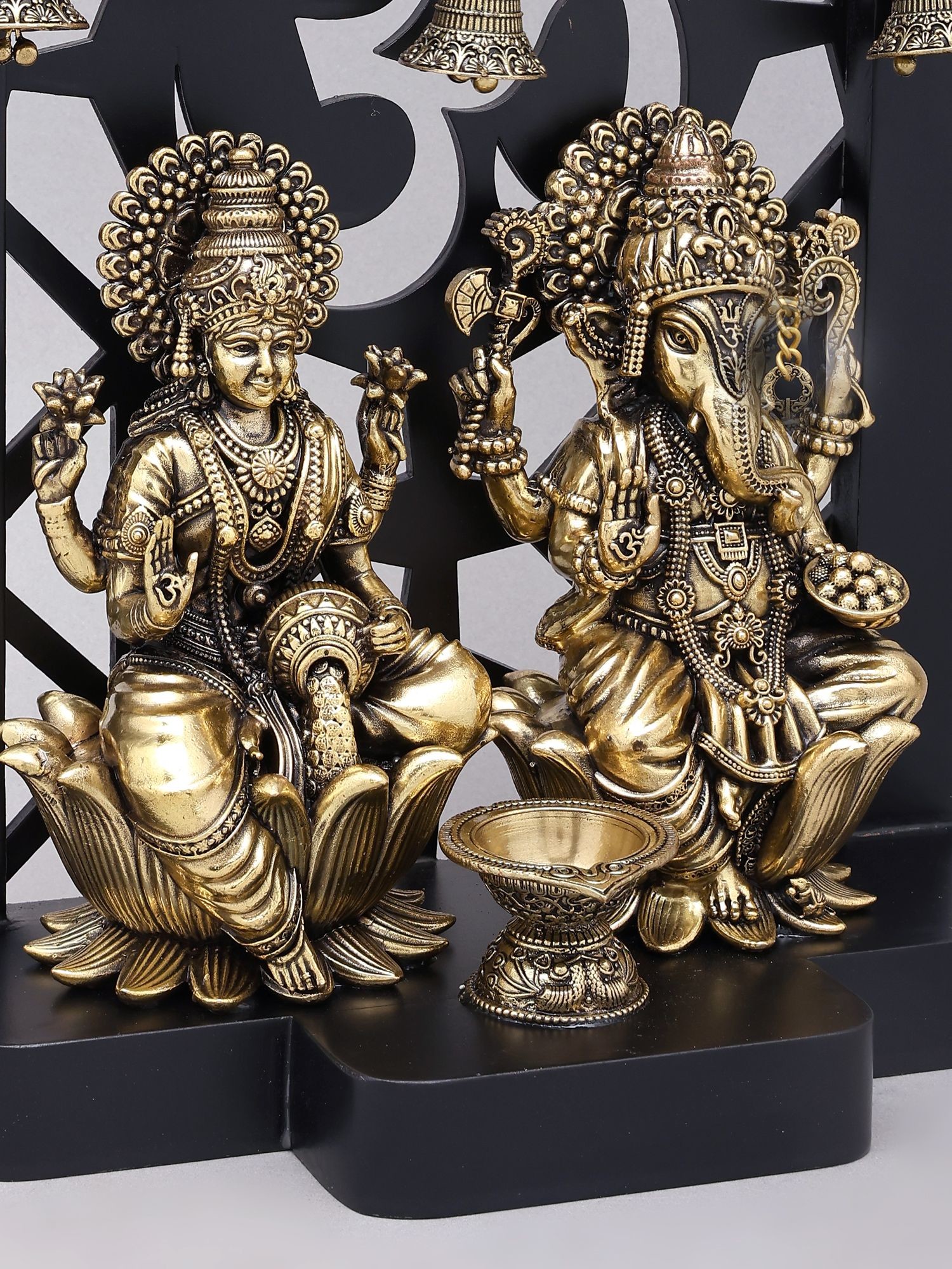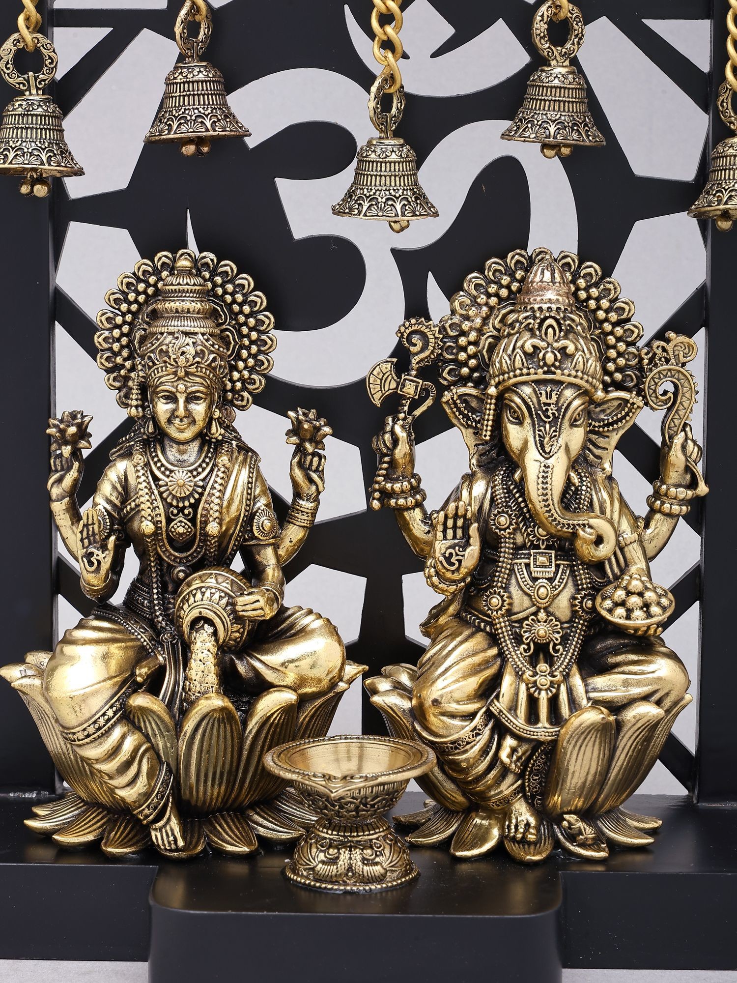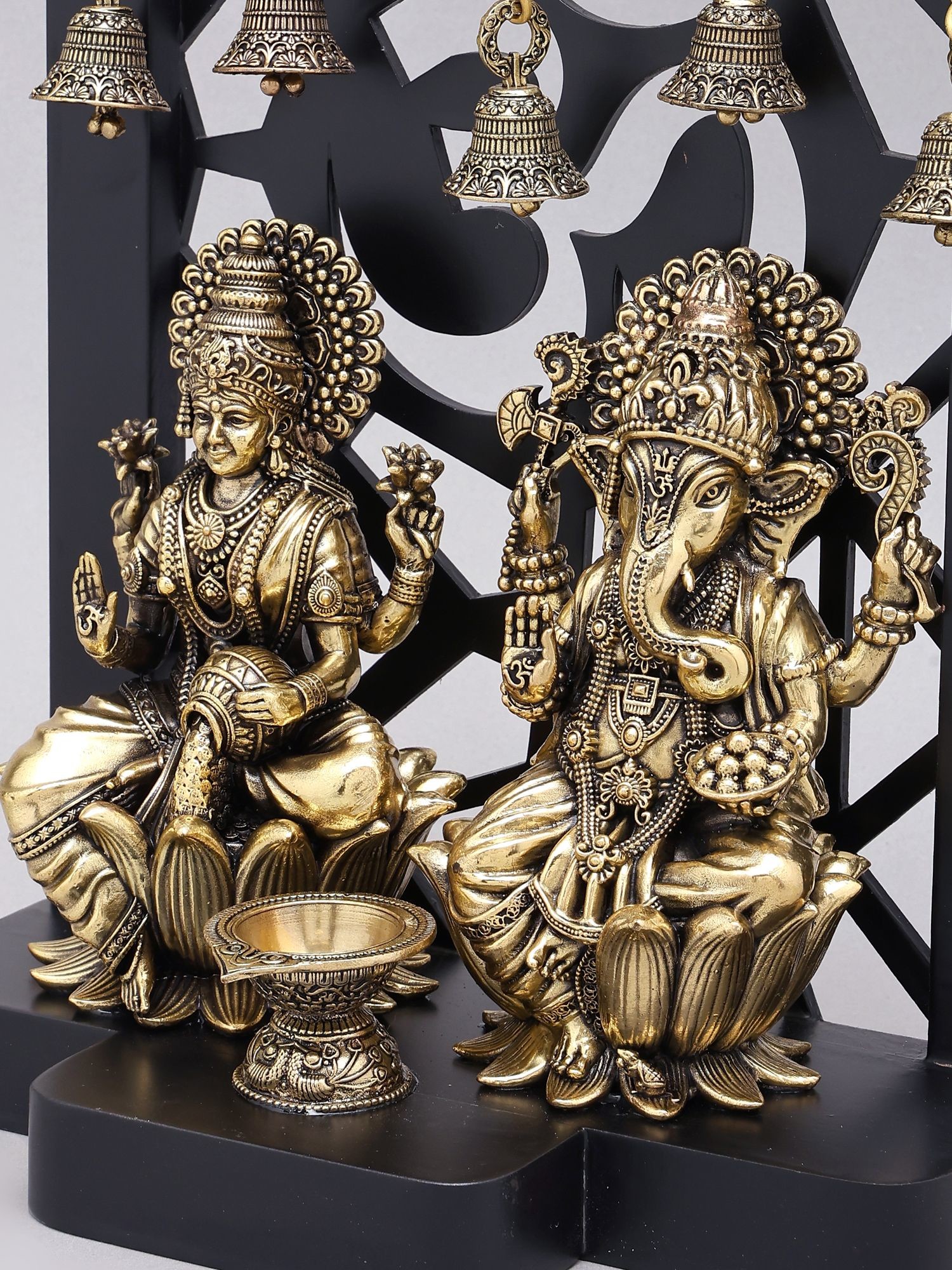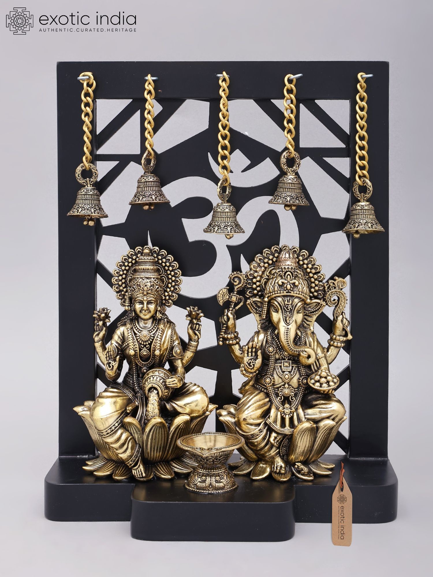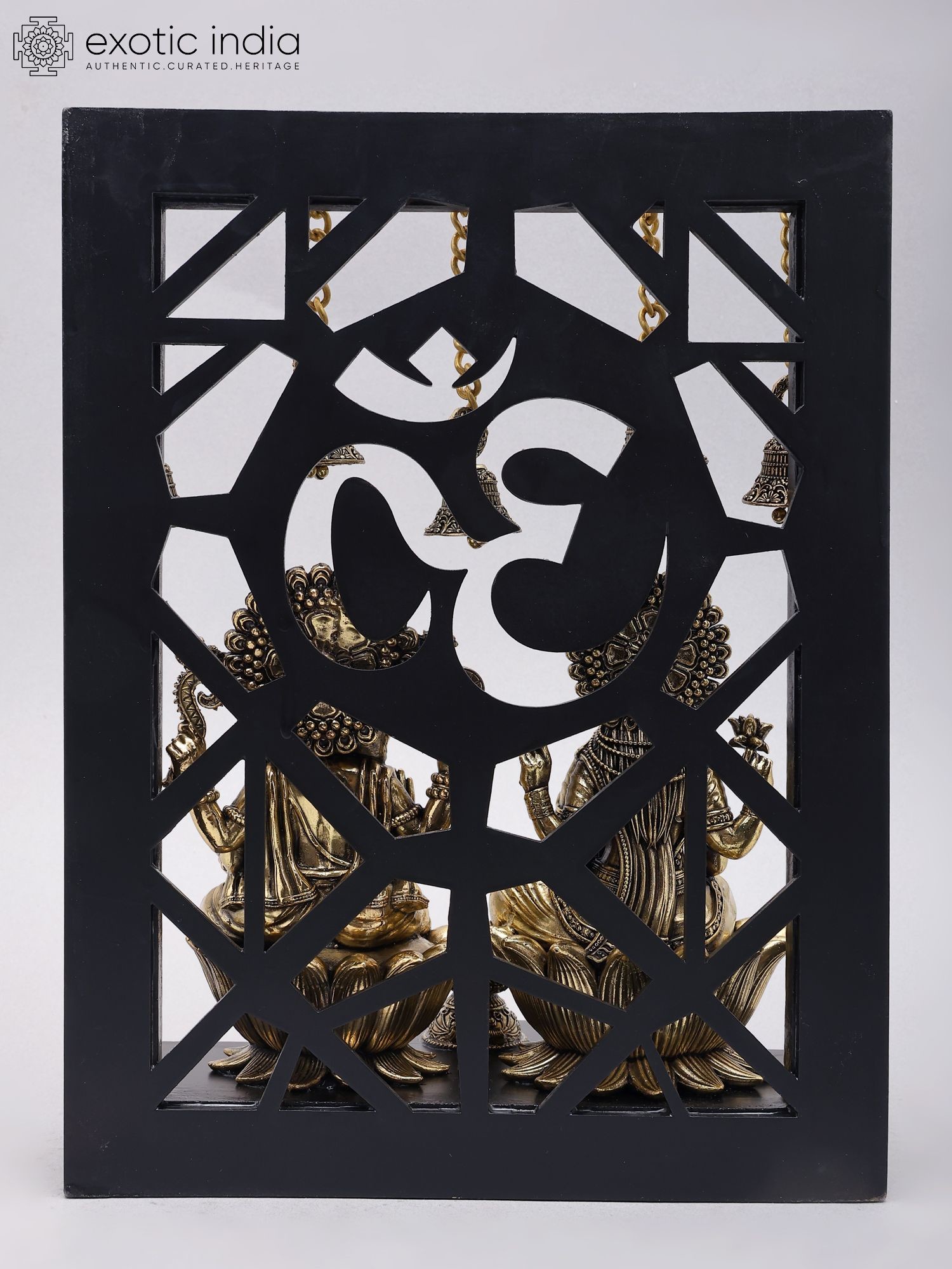 9" Sitting Lakshmi Ganesha Brass Sculpture | Wood Framed Wall Hanging