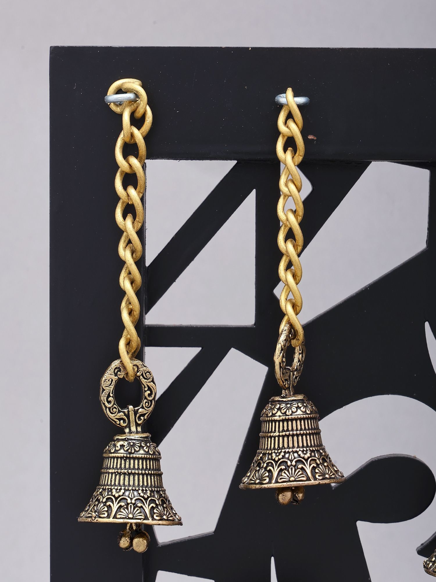 17" Divine Trinity: Lakshmi, Ganesha, Saraswati Brass Sculptures with Bells | Wood Framed Wall Hanging