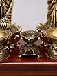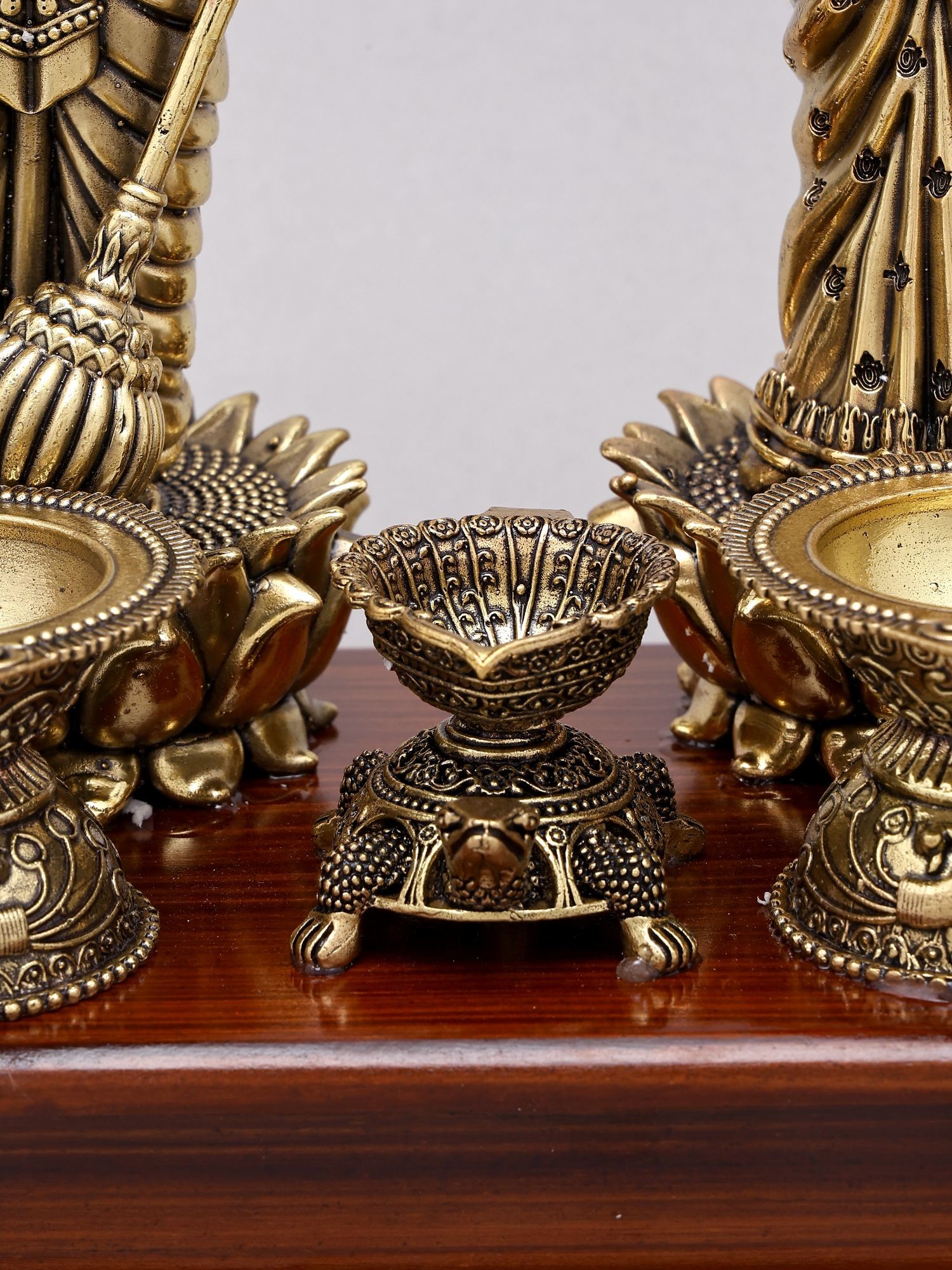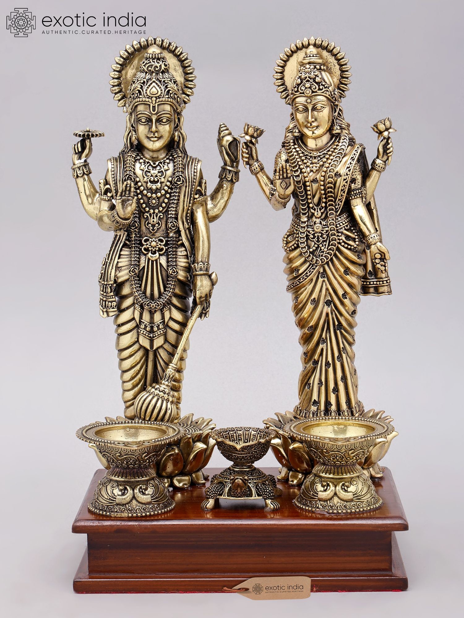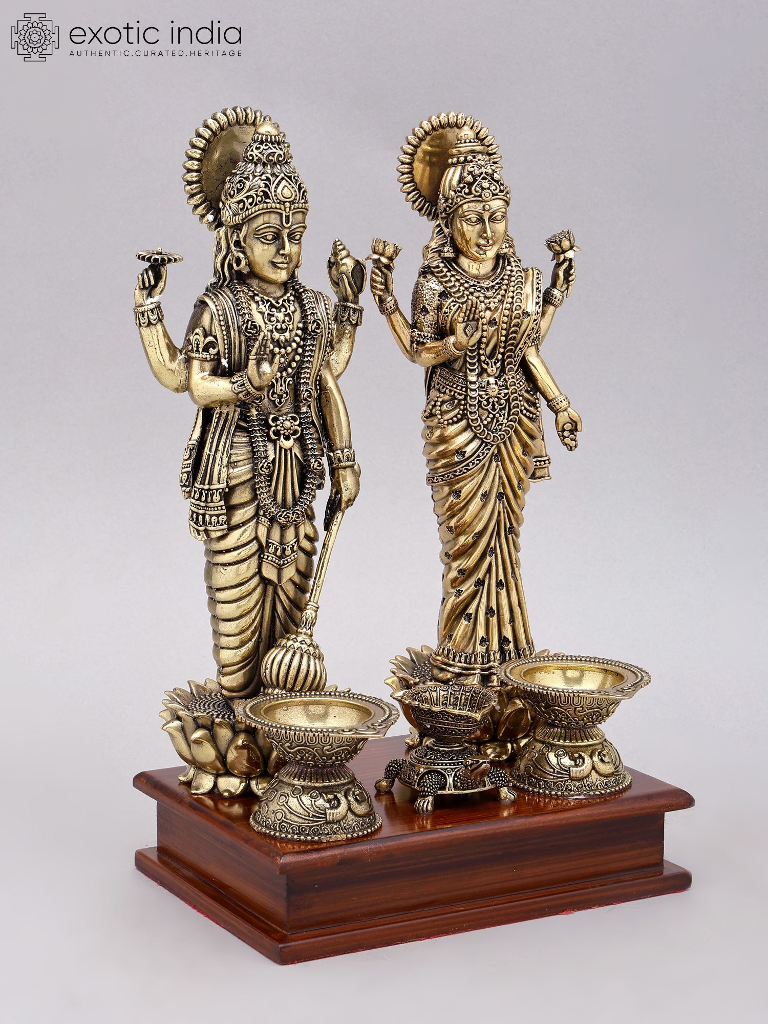 Superfine Brass Vishnu Lakshmi Statue: 14" with Lamps, Bells & Wood Base
