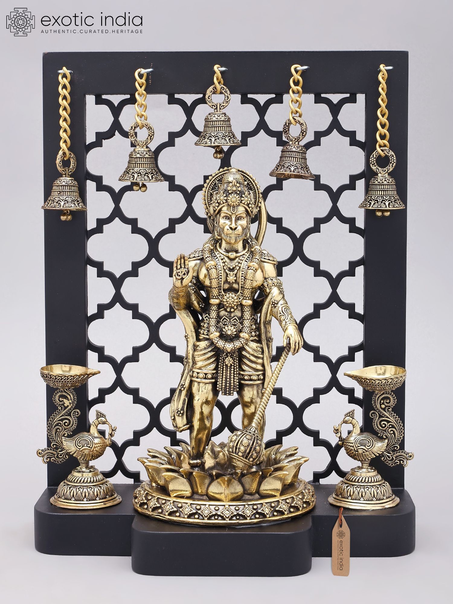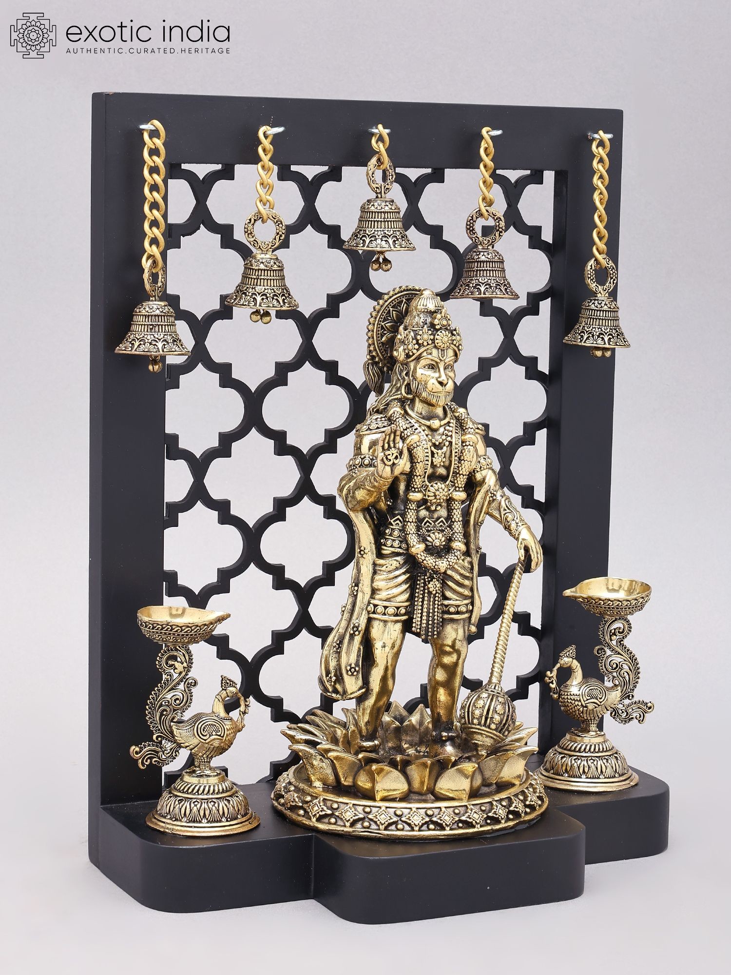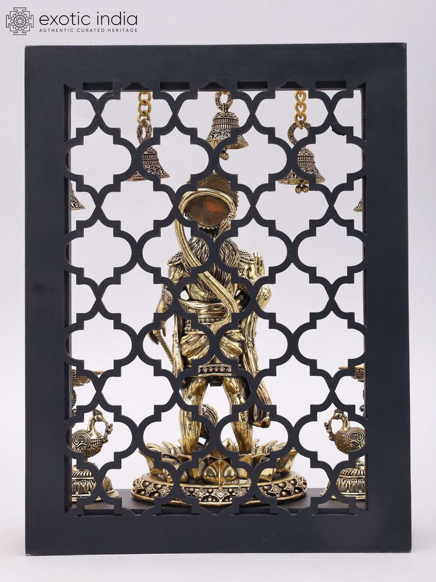 14" Standing Panchamukhi Lord Hanuman with Lamps and Bells | Brass Statue with Wood Frame