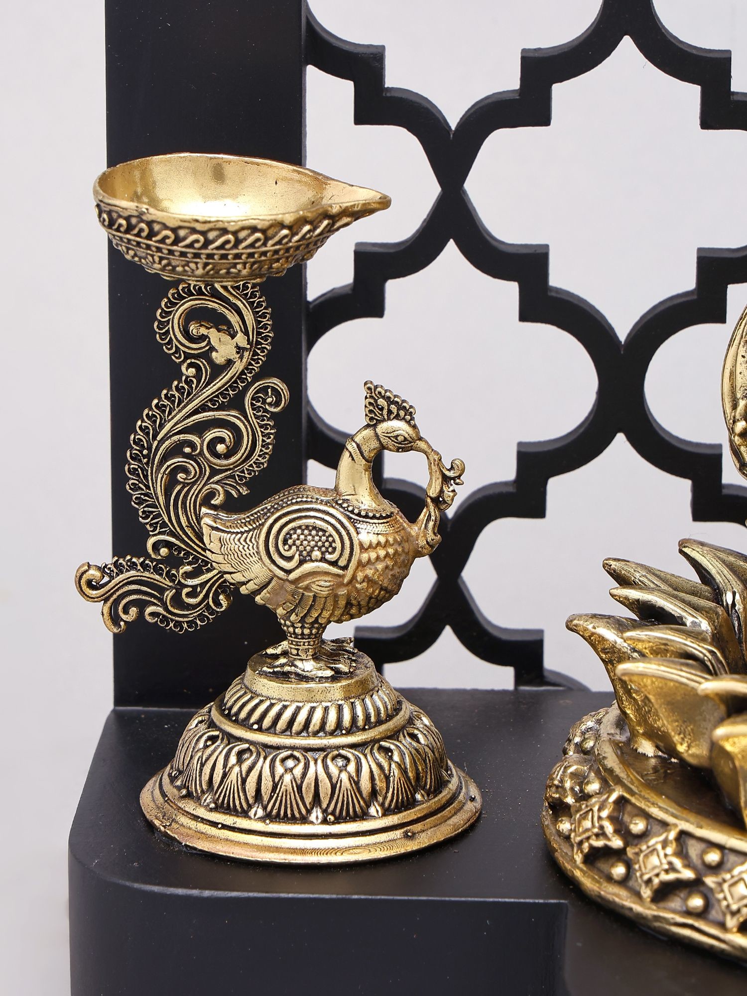 Designer Wood Framed Goddess Druga Statue in Brass with Lamps and Bells