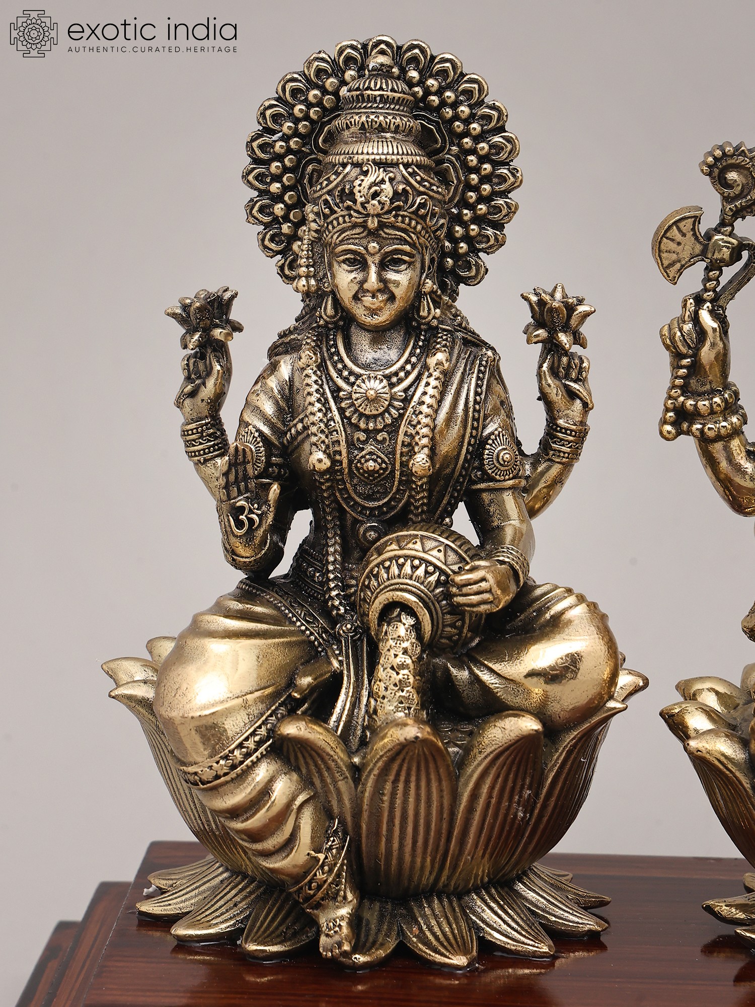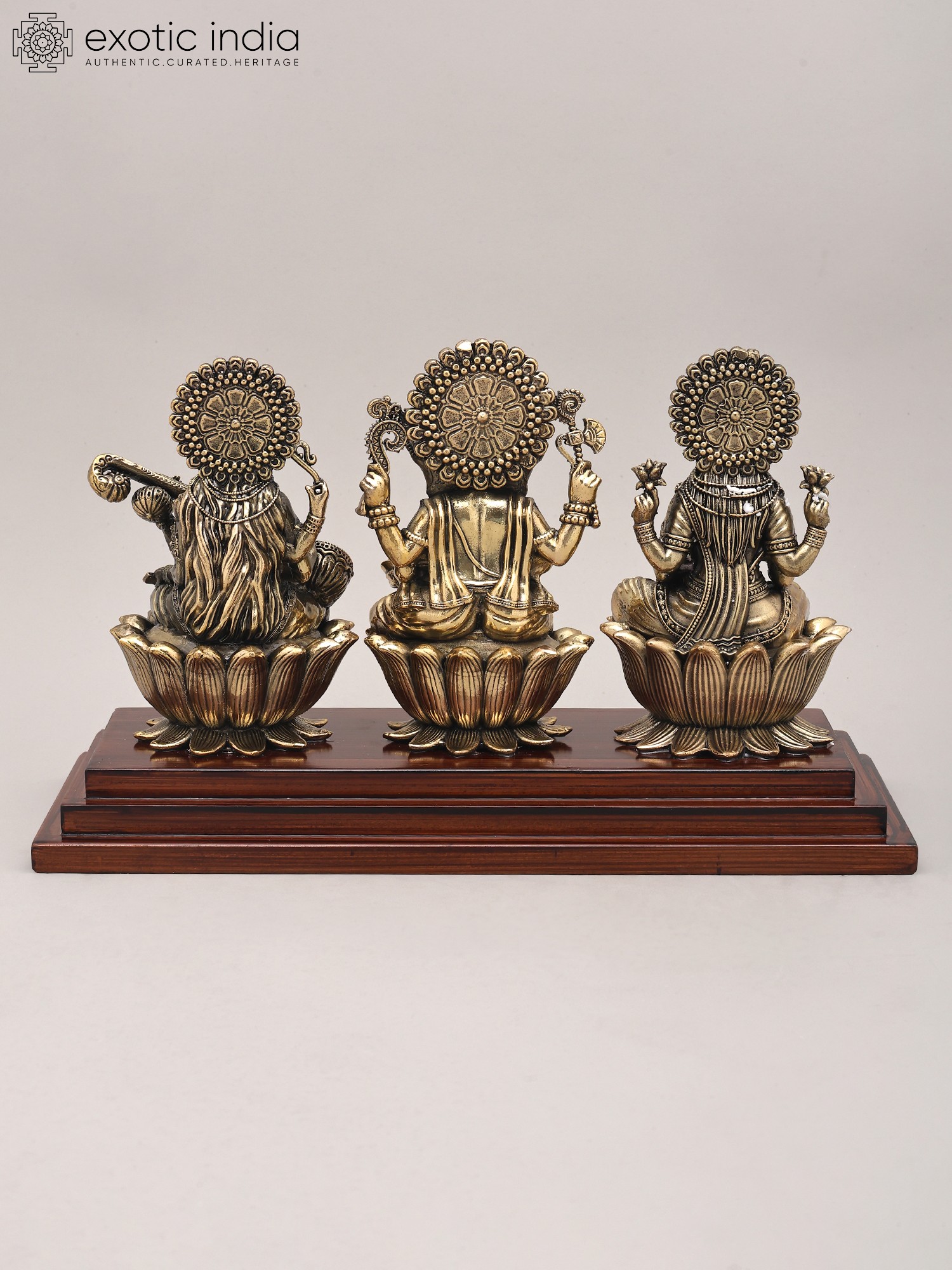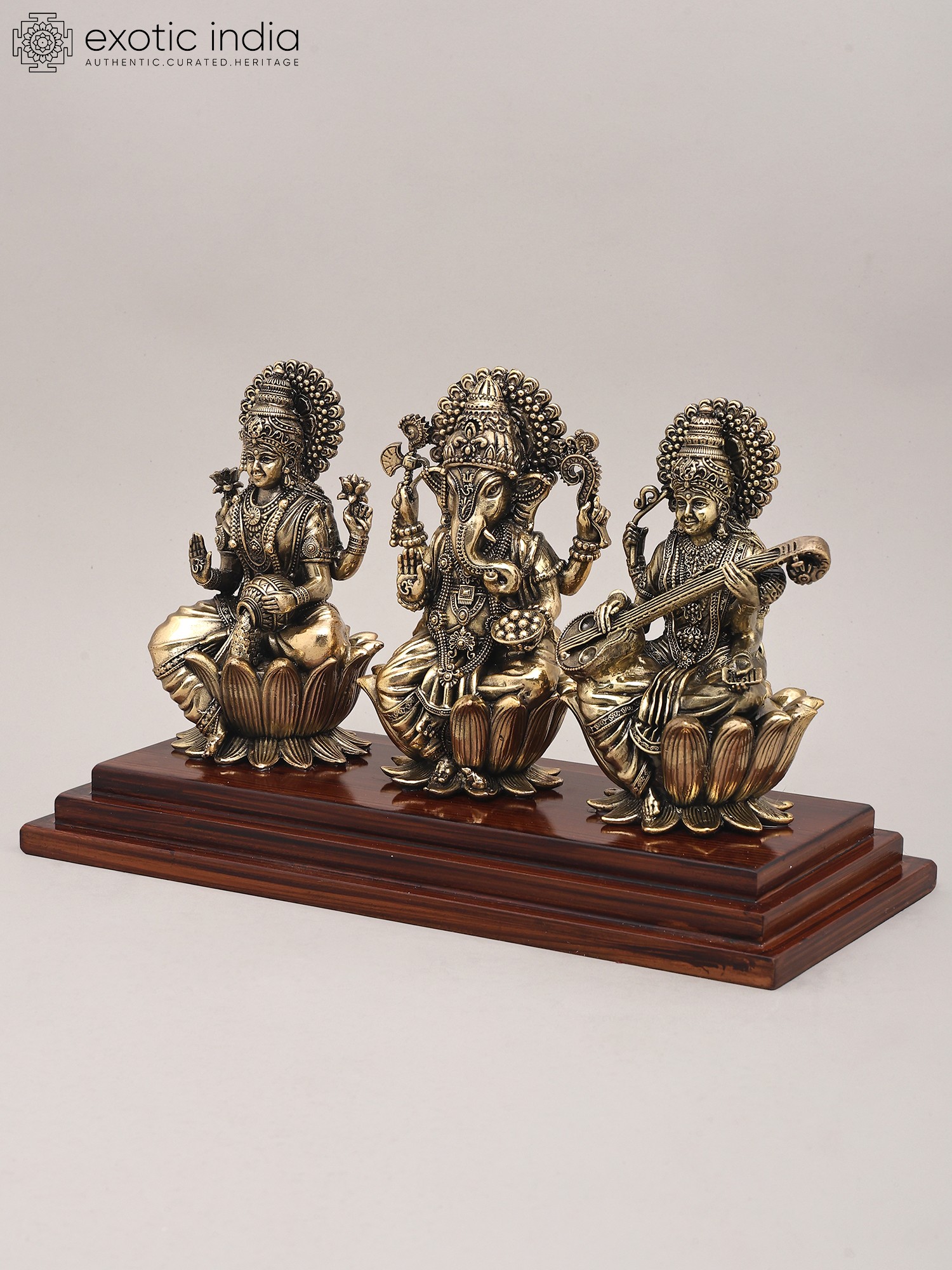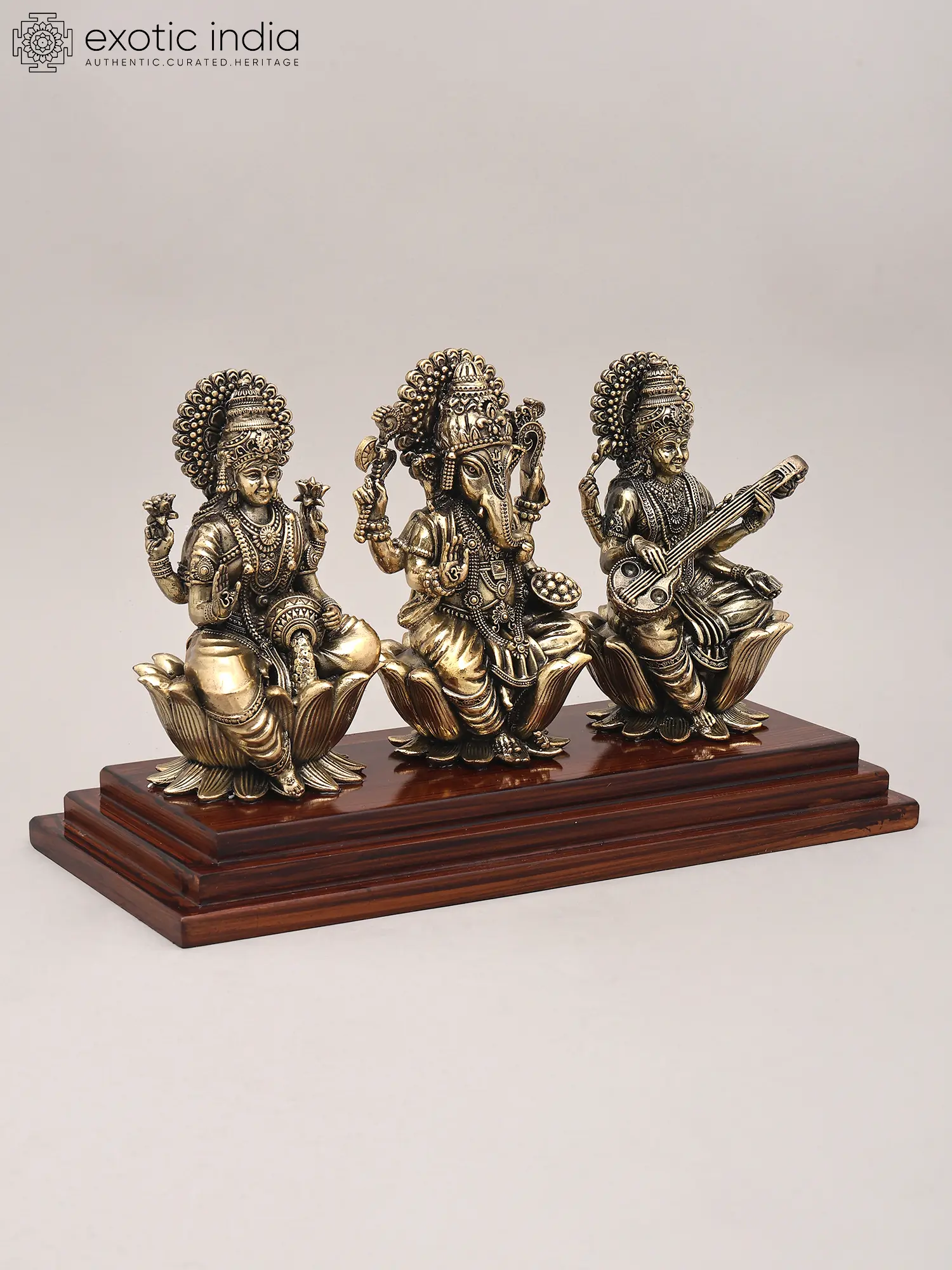 This exquisite brass sculpture presents a divine tableau, uniting three of Hinduism's most revered deities: Goddess Lakshmi, Lord Ganesha, and Goddess Saraswati. Each figure, rendered with exceptional detail and artistry, sits serenely upon a blossoming lotus, a symbol of purity, beauty, and spiritual awakening. The lustrous brass finish, achieved through superfine craftsmanship, imbues the idols with a timeless elegance and a divine aura. The entire composition is elegantly mounted on a polished wooden base, providing a stable and sophisticated foundation that enhances the overall aesthetic appeal. This remarkable piece is not merely a decorative item; it is a conduit of blessings and a visual representation of the core values of abundance, intellect, and auspiciousness. ––––––––––