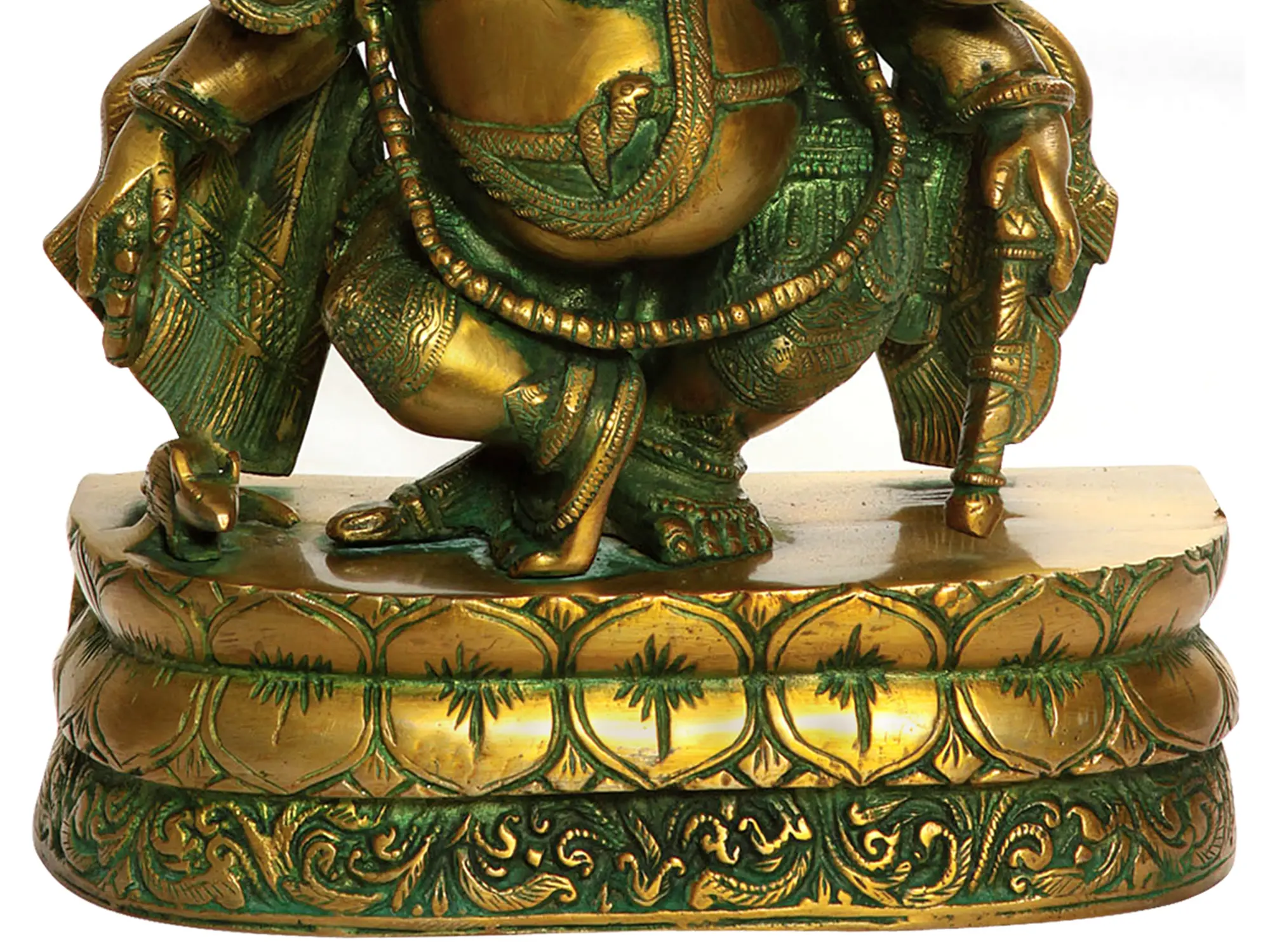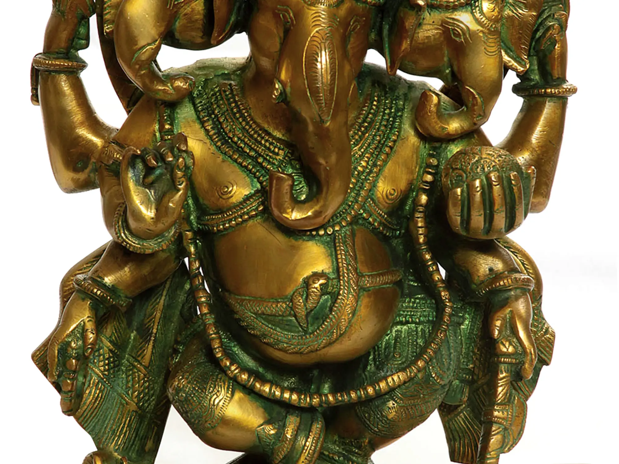 The Three-headed Dancing Ganesha, “Trimukhi Nritya Ganesha”, beckons with celestial allure. In the mesmerising throes of his dance, Ganesha stands in a “Tribhanga posture”, a cascade of joy embodied. Adorned in regal attire, Ganesha's form is an ethereal tapestry, graced with celestial jewels that shimmer like the stars. He clutches his broken tusk, a symbol of life’s imperfections, and a sweet Modak, the confectionary delight of divine wisdom. With three serene visages that embody the past, present, and future, He orchestrates a celestial ballet, entwining the mortal and the divine, while time stands still in admiration of his resplendent grace. Carved in brass, this statue represents Ganesha with his cosmic dance, eternally radiating the joy of creation.