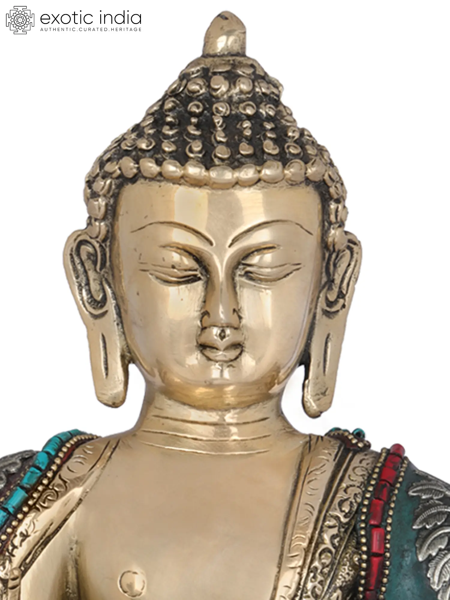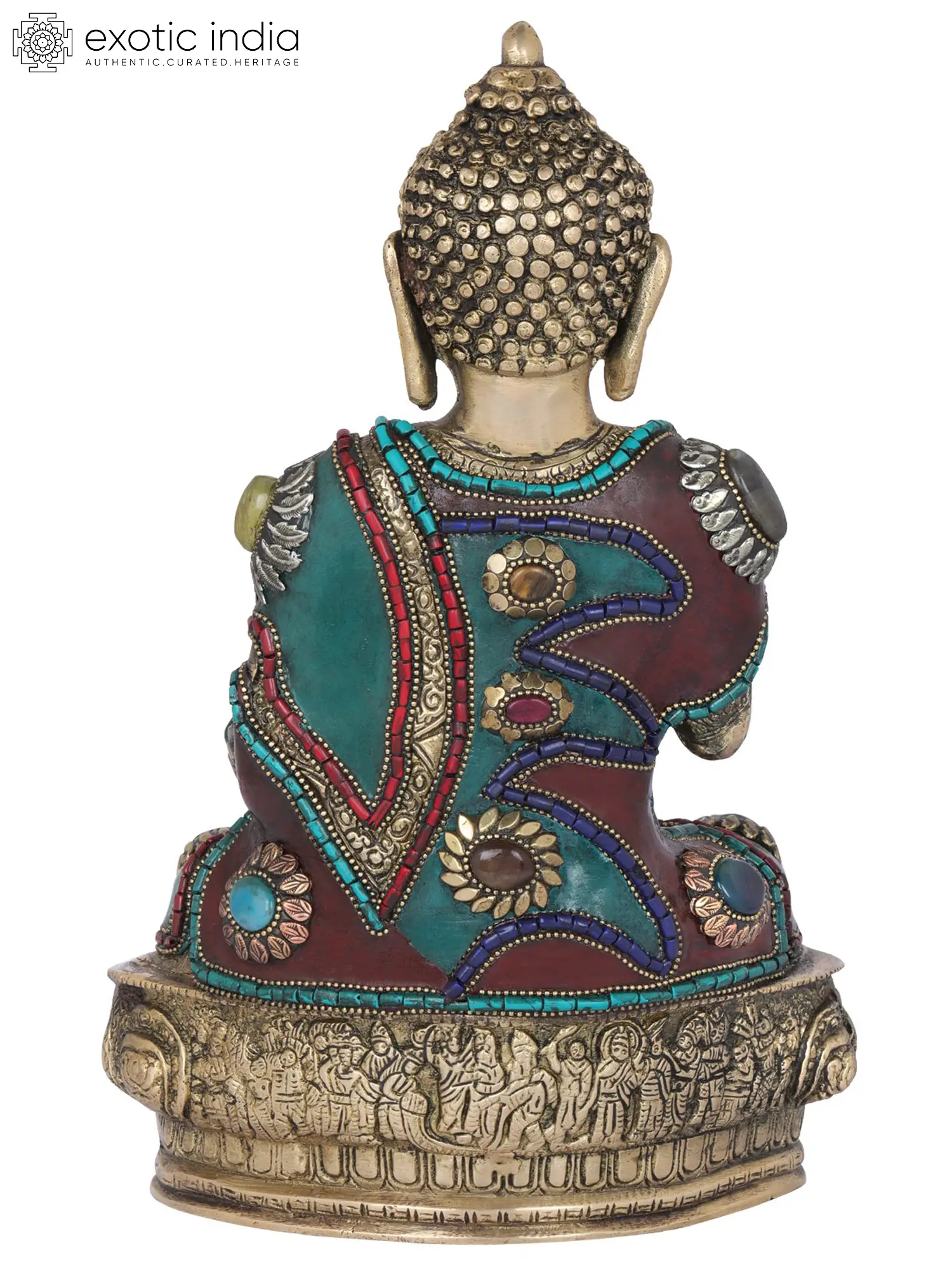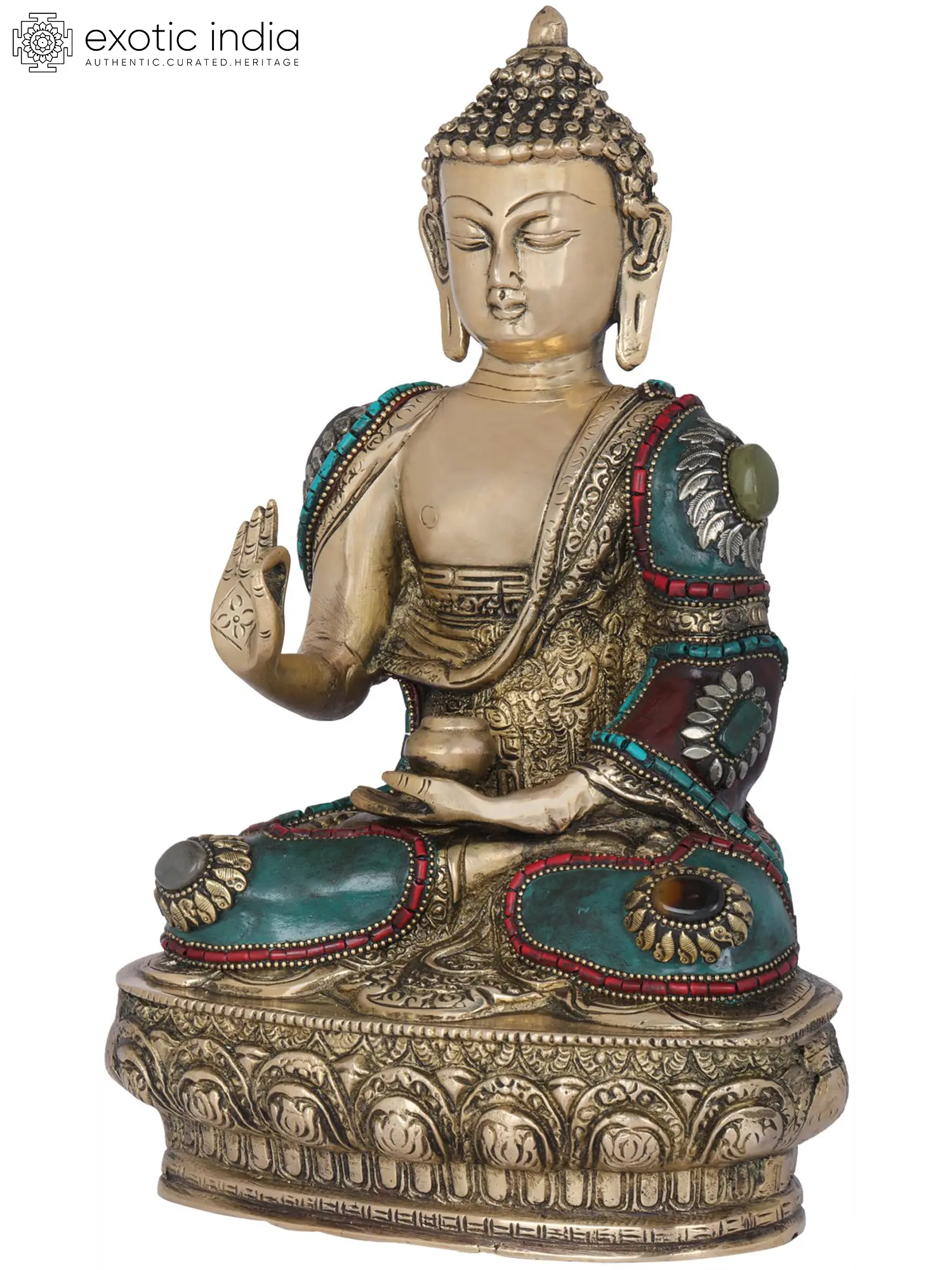 The serene countenance of the Buddha, with eyes gently closed in deep meditation, conveys an aura of tranquility and inner peace. His right hand is raised in the Abhaya Mudra, a gesture of fearlessness and reassurance. This mudra, according to Buddhist lore, was often displayed by the Buddha to dispel fear and offer protection. It signifies that one need not be afraid, for compassion and wisdom are present. The left hand rests in the lap, symbolizing concentration and meditation. This posture, known as the Dhyana Mudra, is often associated with the Buddha's deep samadhi and the achievement of enlightenment. The ornate robes are adorned with vibrant turquoise and red stones, offering a stunning contrast to the warm brass. These gemstones are not merely decorative; they often carry symbolic meanings in Tibetan Buddhism, representing various qualities like wisdom, compassion, or auspiciousness. The intricate patterns and detailing on the robes speak to the richness of Tibetan Buddhist art and its deep connection to spiritual symbolism.