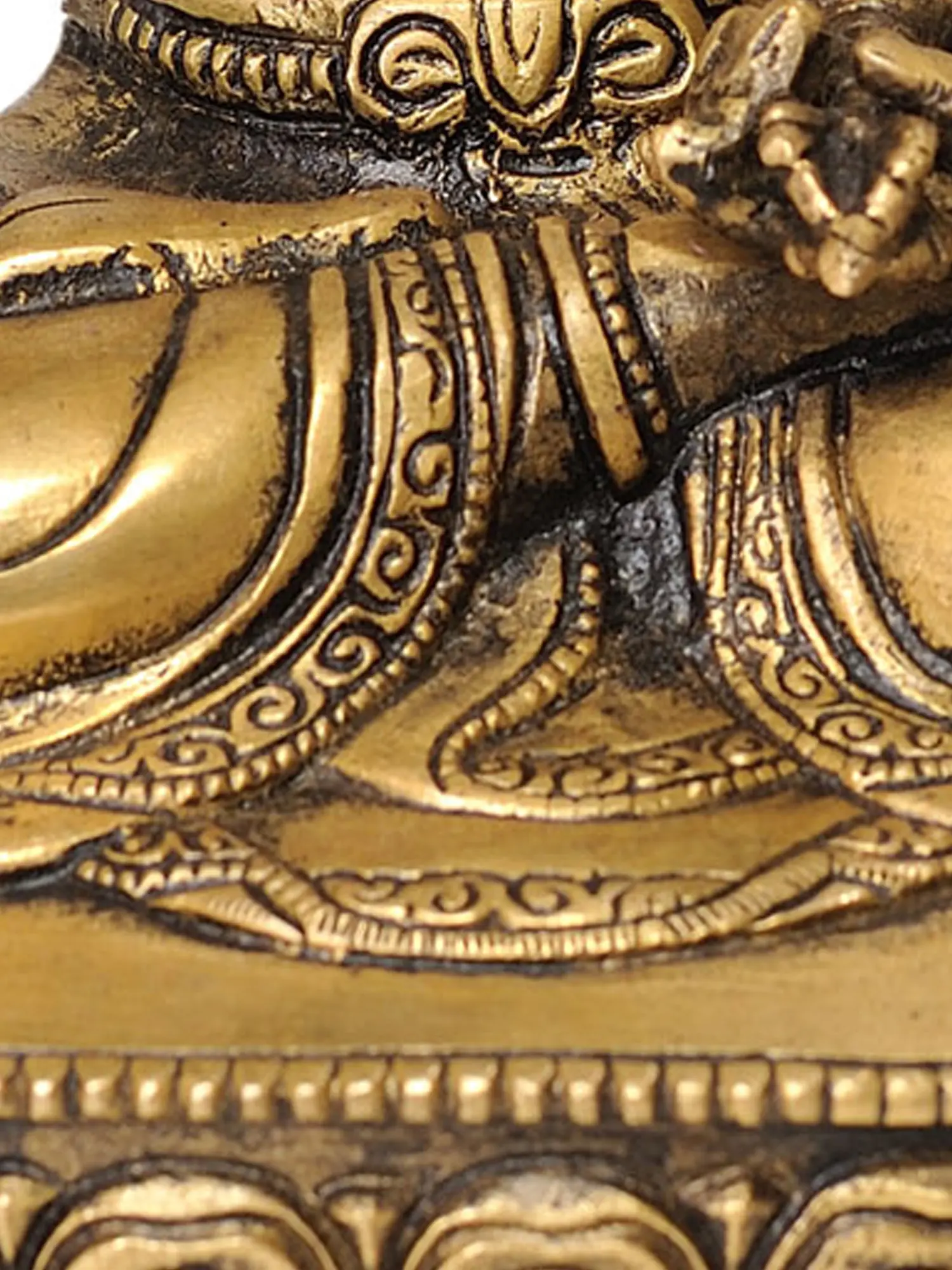 The iconography of Vajrasattva is rich with symbolic meaning. He is typically shown seated in the vajra posture, signifying stability and unshakability. His serene expression conveys profound wisdom and boundless compassion. In one hand, he often holds the vajra (a thunderbolt scepter), representing indestructibility, method, and skillful means. In the other, he may hold a ghanta (a bell), symbolizing wisdom and emptiness. This particular depiction showcases Vajrasattva adorned in regal ornaments, including a crown and intricate jewelry, signifying his status as a celestial prince and his mastery over the highest realms of consciousness. The polished brass lends a luminous quality to the deity, reflecting the brilliance of awakened awareness. The ornate details of his robes and the base further emphasize the divine nature and the sacred context of this representation.
