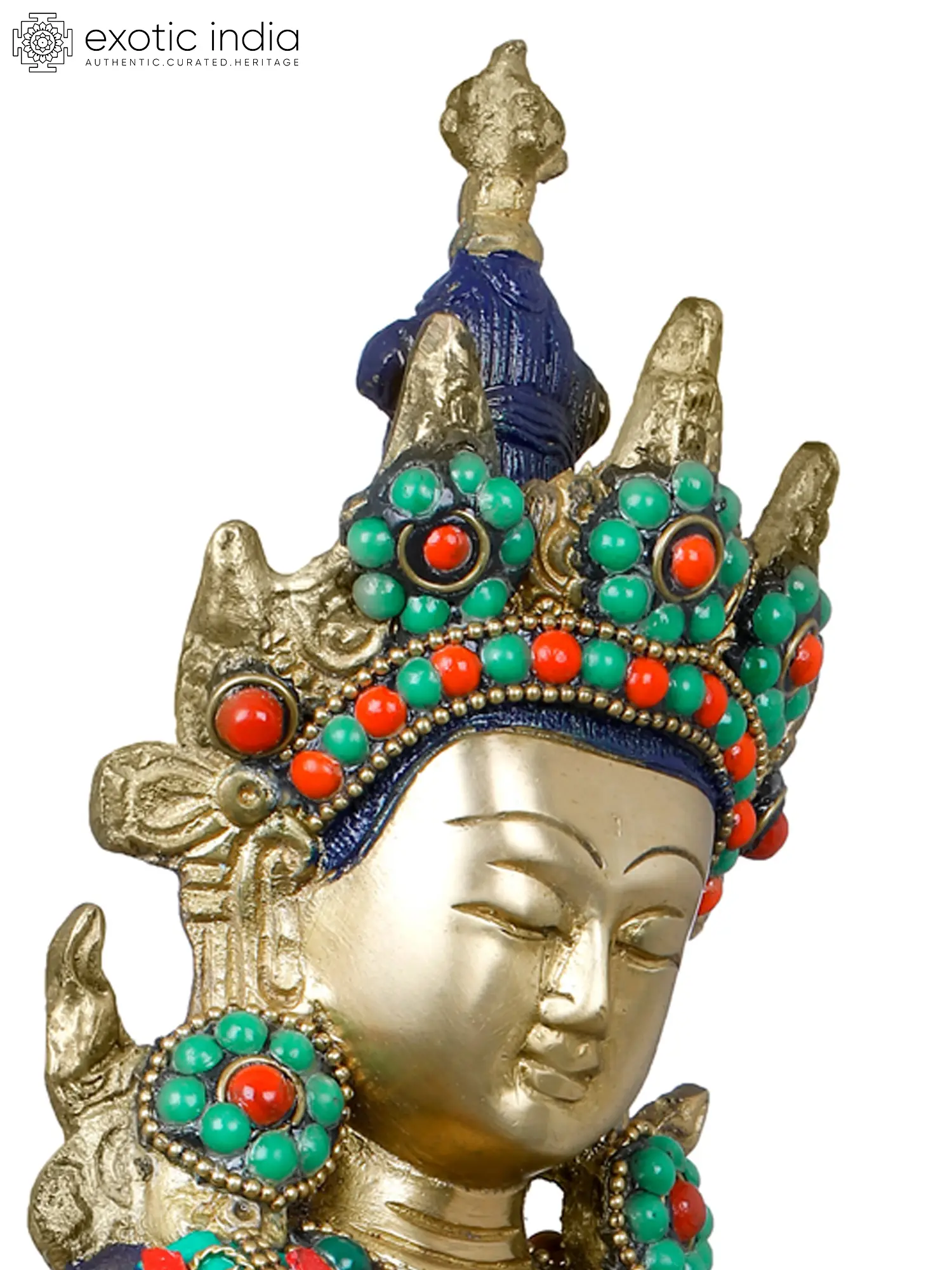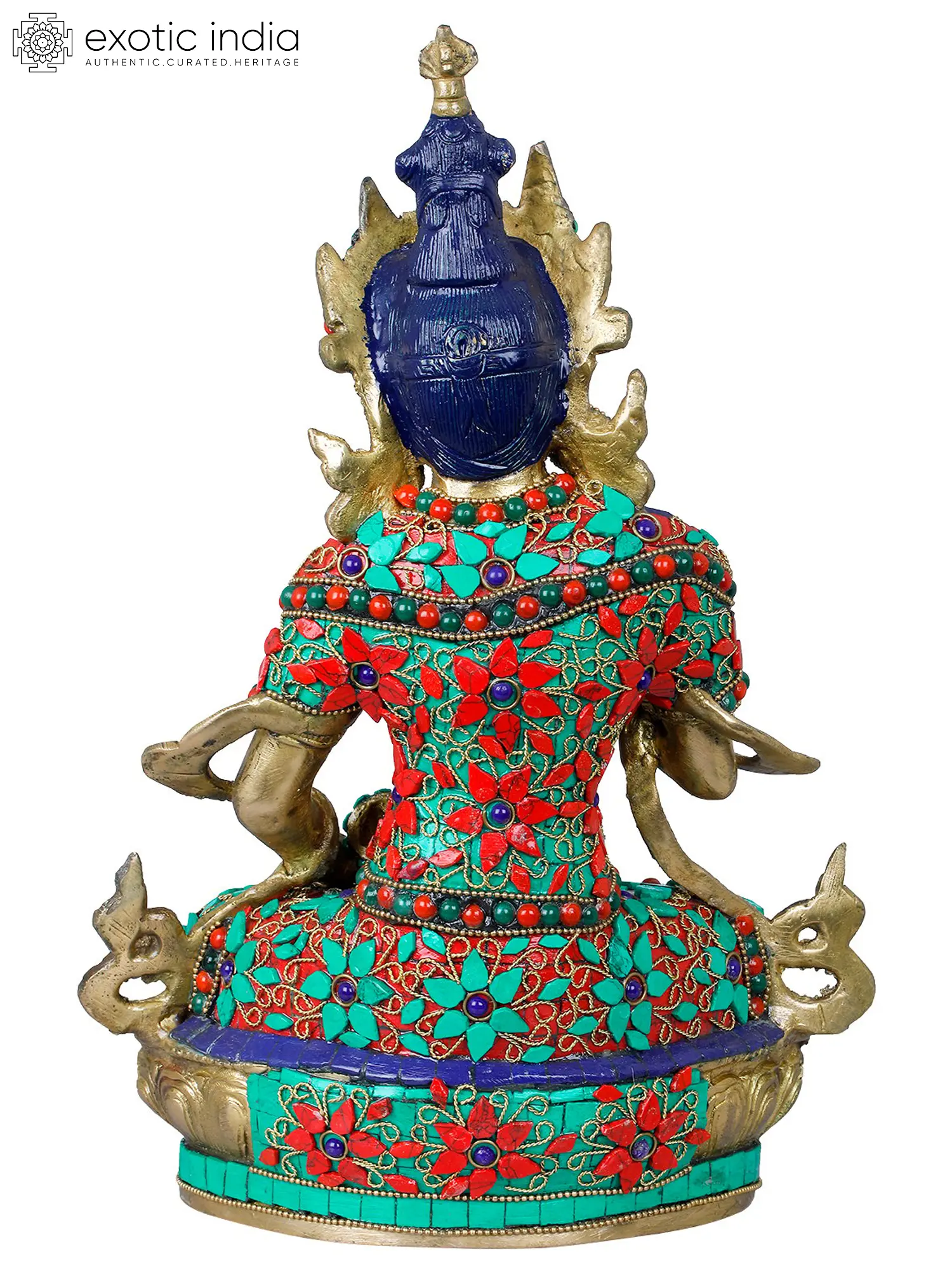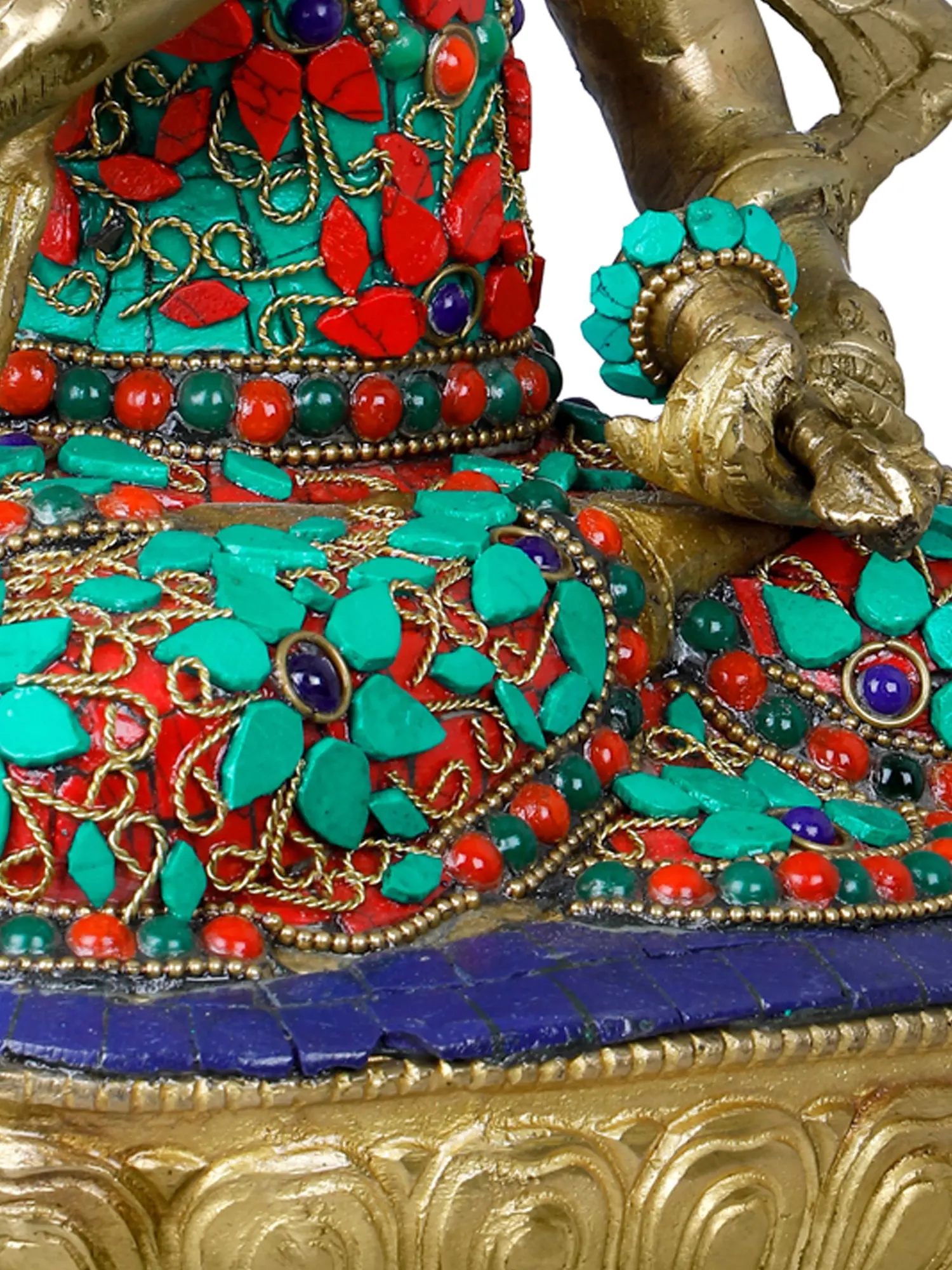 This exquisite statue is a testament to the rich artistic heritage of India, meticulously handcrafted by skilled artisans. The radiant brass forms the base for an elaborate inlay of vibrant turquoise and red stones, interspersed with intricate gold wirework. These precious embellishments not only add a breathtaking visual appeal but also hold symbolic significance. Turquoise, often associated with the sky and the ocean, represents wisdom, healing, and good fortune. The red stones, symbolizing passion, vitality, and spiritual energy, complement the serene countenance of Vajrasattva. The detailed adornments, including the ornate crown, necklaces, and bracelets, further enhance the divine aura of the deity, reflecting the opulence and spiritual grandeur of Tibetan Buddhist art.