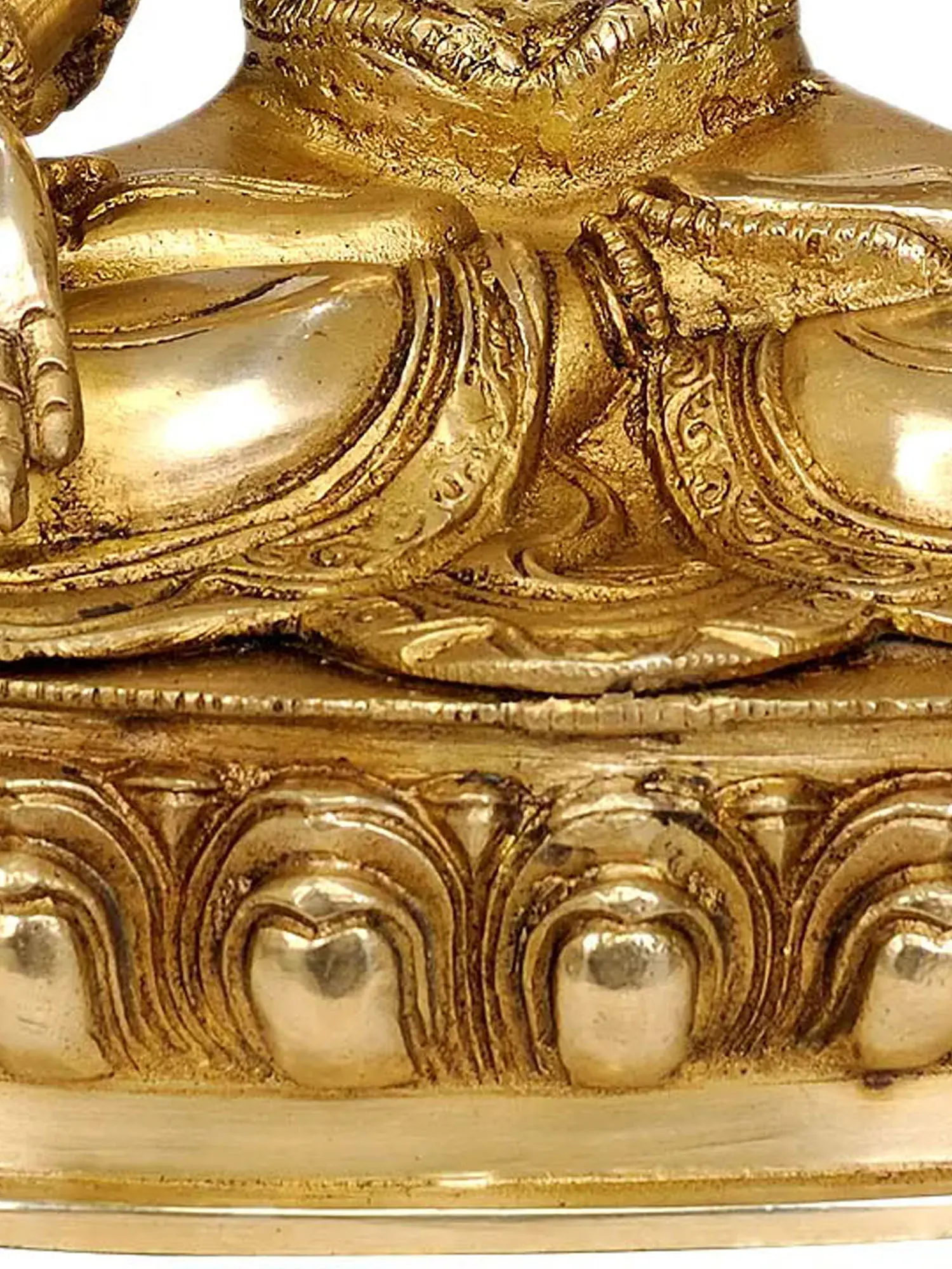 This exquisite brass statue depicts White Tara, a revered female bodhisattva in Tibetan Buddhism, renowned for her compassion, healing abilities, and association with longevity. Crafted with exceptional skill in India, this artwork stands as a testament to the rich traditions of Buddhist iconography and devotional artistry. The serene countenance of White Tara, with her half-open eyes radiating wisdom and kindness, invites contemplation and a sense of inner peace. Her posture, seated in a meditative pose upon a lotus throne, signifies purity and spiritual awakening. The delicate detailing on her crown and ornaments speaks volumes about the meticulous craftsmanship. White Tara is often depicted with seven eyes – three on her forehead and one each on her palms and soles – symbolizing her ability to see all sentient beings and their suffering, and to reach out to them with her compassionate aid. While not explicitly visible in this particular rendition, the spiritual essence of this multifaceted gaze is conveyed through her serene expression and the auspicious gestures of her hands.
