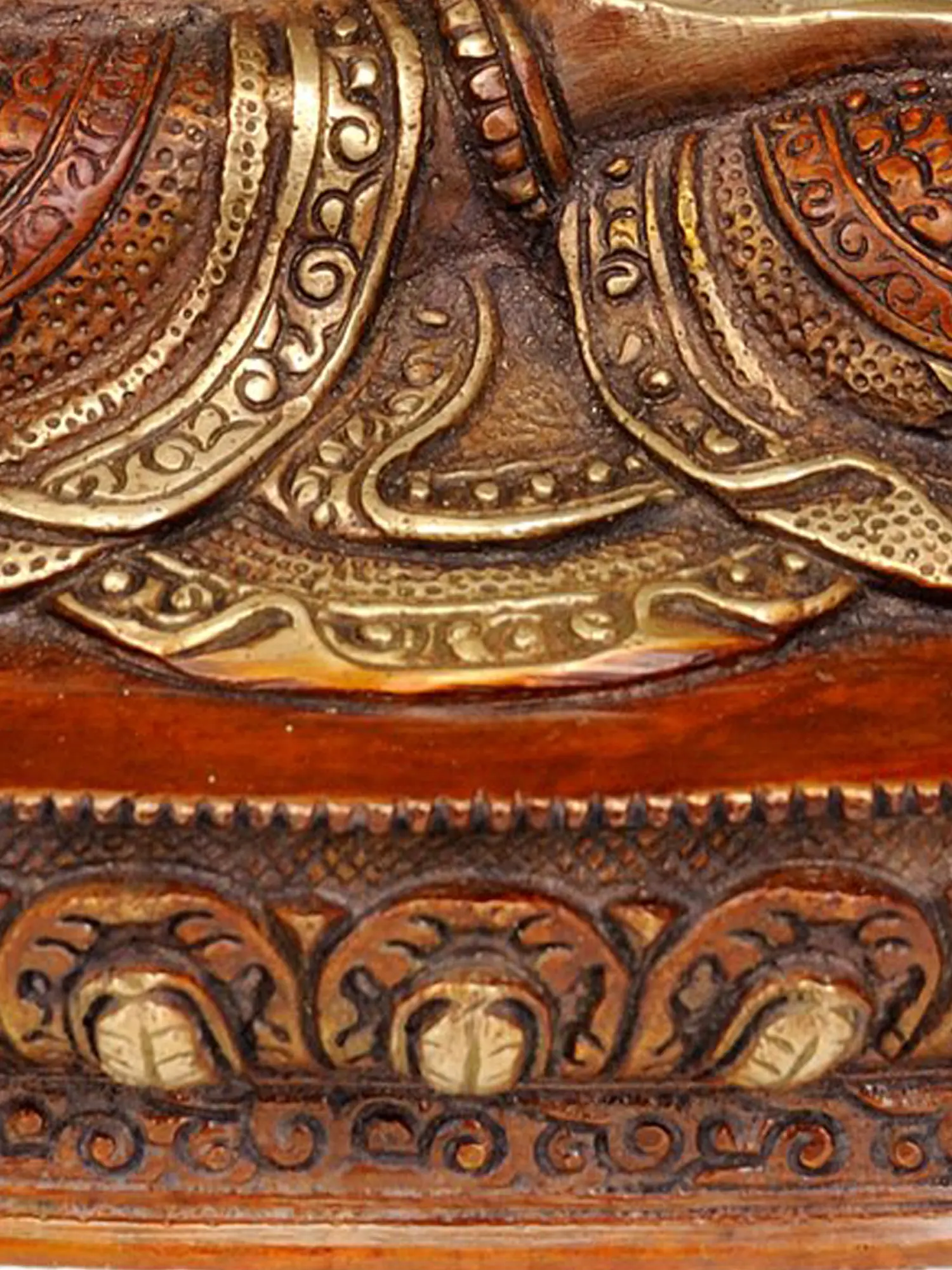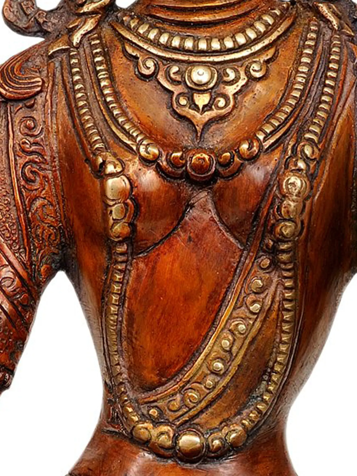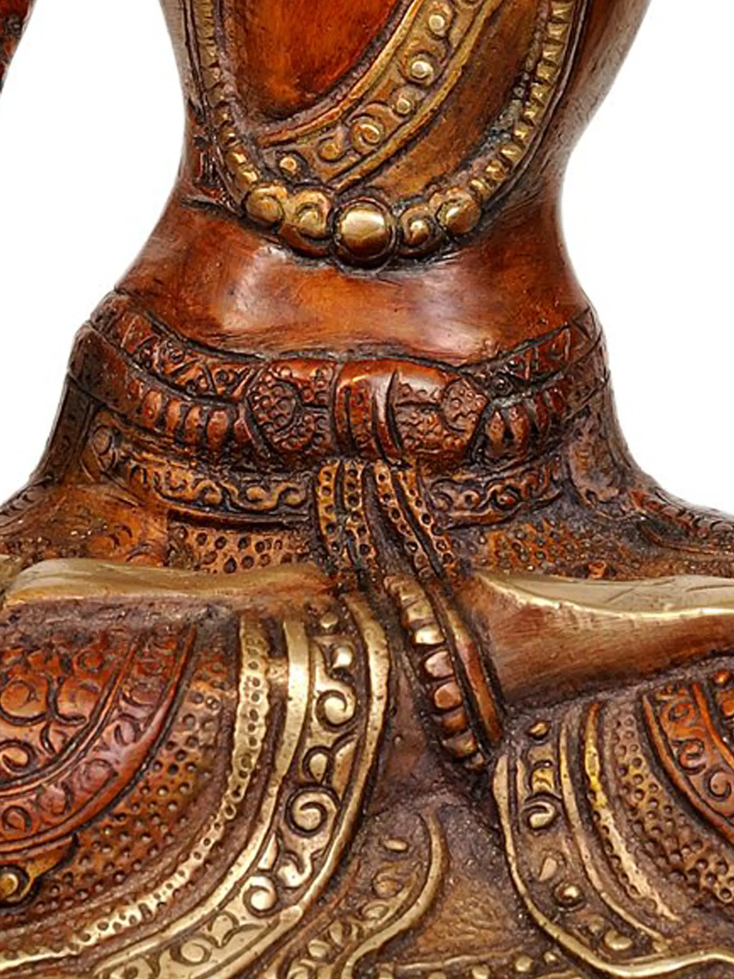 Crafted from high-quality brass, this statue possesses a rich patina that deepens with age, adding to its timeless appeal. The warm, metallic sheen of the brass is masterfully contrasted with darker tones that accentuate the carved details, bringing the goddess to life. She is seated in the traditional lotus posture (padmasana), a symbol of purity and spiritual elevation. Her right hand is extended in the gesture of granting boons (varada mudra), signifying her willingness to bestow blessings and fulfill wishes, while her left hand is held at her heart in the gesture of teaching (vitarka mudra), offering guidance and wisdom. Adorning her, one can observe exquisite necklaces, bracelets, and anklets, each element meticulously rendered to represent her divine status.