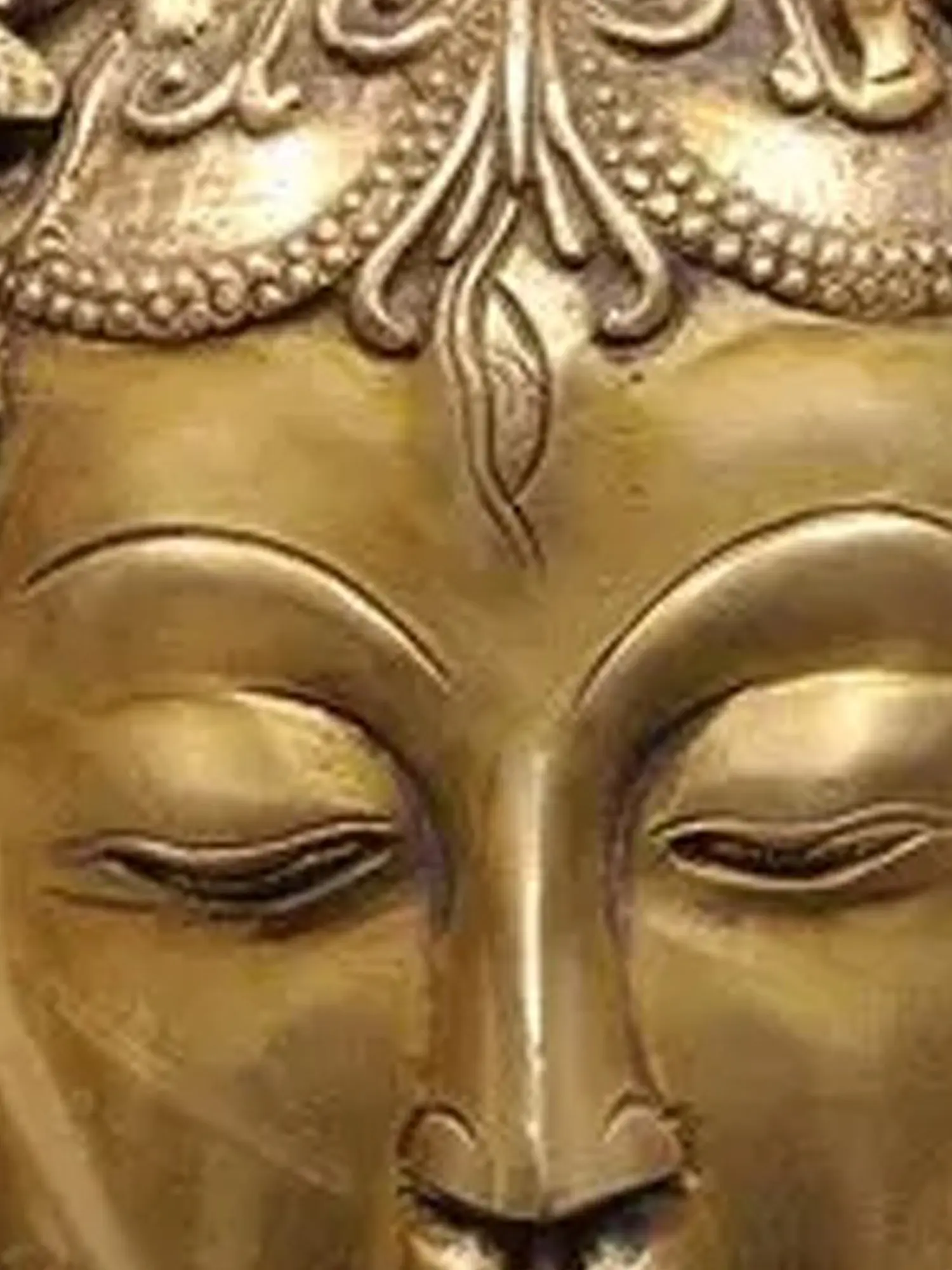 This Tibetan Buddhist wall-hanging mask is a tribute to the most benevolent deity, Goddess Tara. She is the feminine counterpart of Avalokiteshvara, the bodhisattva or the "buddha-to-be." According to popular legend, she was created from Avalokiteshvara's tear, which fell to the earth and formed a lake. A lotus bloomed from its waters, revealing the goddess as it opened. This wall-hanging mask represents the Goddess completely engrossed in meditation. Her eyelids are closed, yet she is attentive and ready to assist devotees who seek her sanctuary.