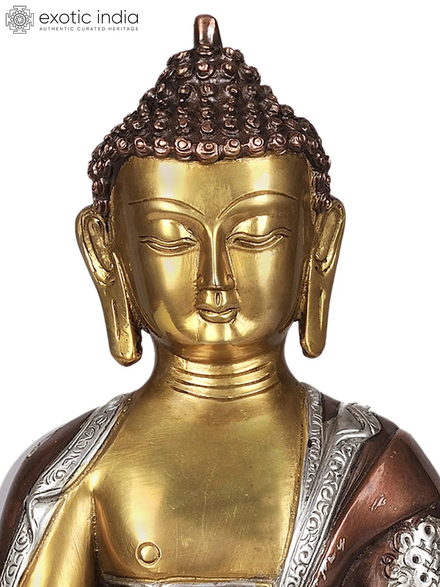 12" Triple Hued Buddha in Earth-Witness Gesture (Robes Decorated with Auspicious Symbols) In Brass