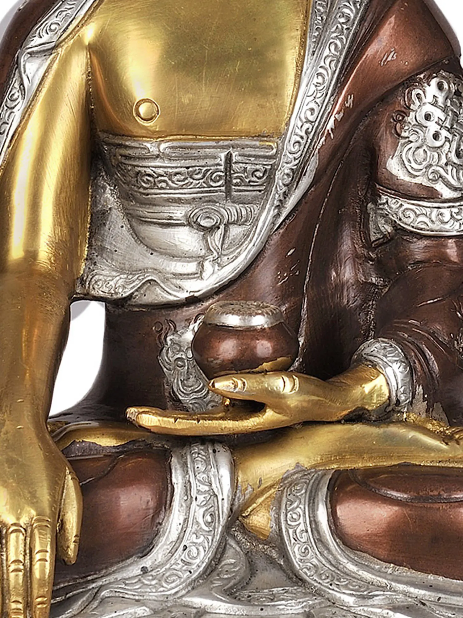 Crafted from brass, this statue is a testament to the skill and artistry of its creators. The intricate details, from the folds of the robes to the delicate features of the face, demonstrate the dedication poured into its creation. The robes themselves are adorned with auspicious symbols, each carrying its own unique meaning and significance within Buddhist iconography. These carefully rendered motifs add depth and complexity to the piece, making it a rich tapestry of symbolism. The contrast between the warm gold hue of the body, the deep brown of the robes and lotus pedestal, and the silver accents creates a visually stunning piece that is both elegant and captivating. The lotus pedestal upon which the Buddha sits symbolizes purity, love, and rebirth. Just as the lotus rises from muddy waters to bloom in pristine beauty, so too can individuals rise above suffering to achieve enlightenment. This representation of the Buddha serves as a powerful reminder of the potential for transformation and the inherent goodness within all beings. The triple hued finish further elevates the statue's aesthetic appeal, lending depth and dimension to the form. The meticulous craftsmanship ensures that this piece will be a treasured addition to any space, serving as a reminder of the Buddha's teachings and the path to inner peace. The weight and feel of the brass add a sense of permanence and solidity, grounding the statue and lending it an aura of timeless wisdom. Whether used as a focal point for meditation, a decorative element in a home or office, or a cherished gift for a loved one, this Buddha statue will inspire contemplation and bring a sense of tranquility to any environment.