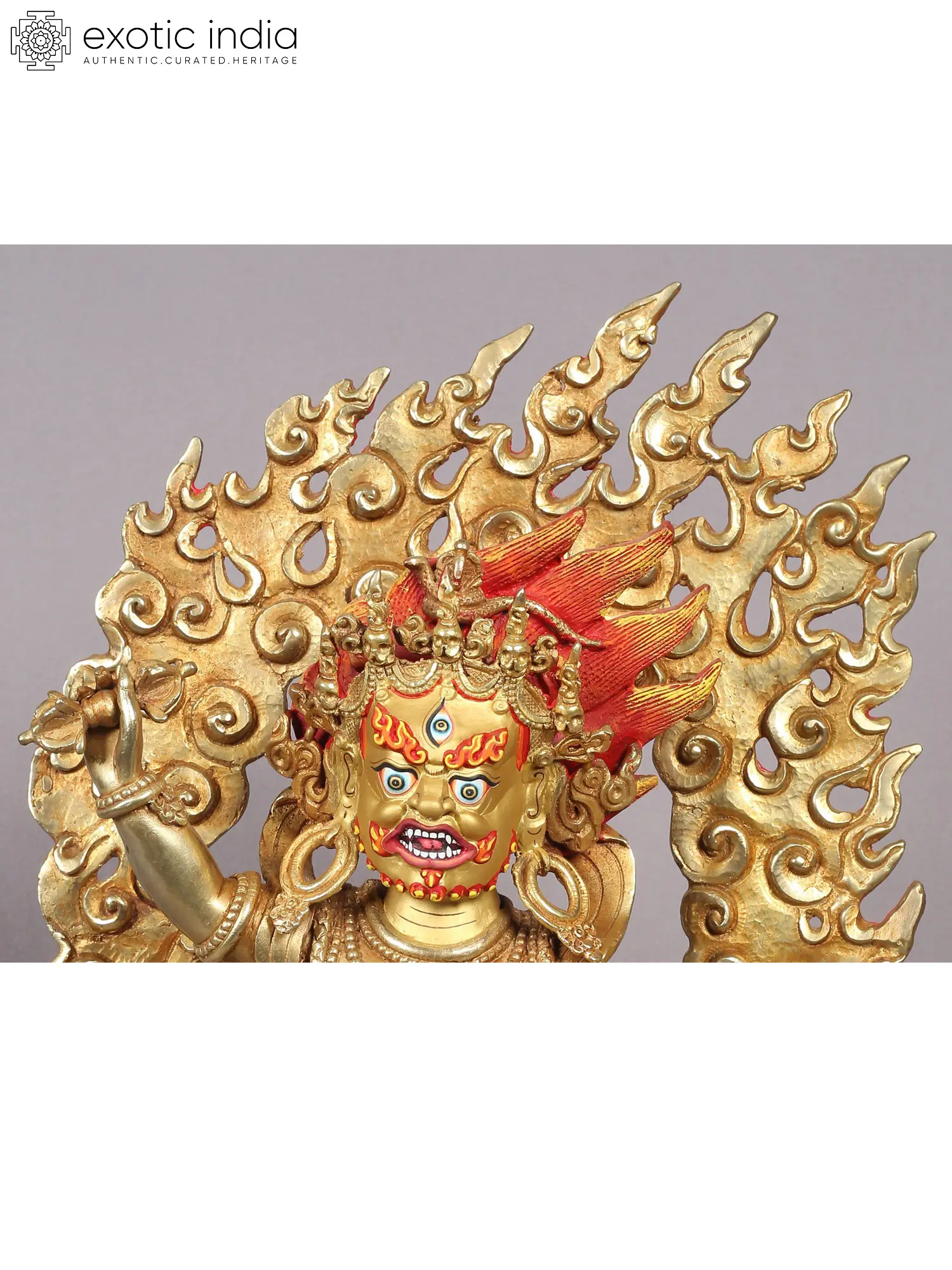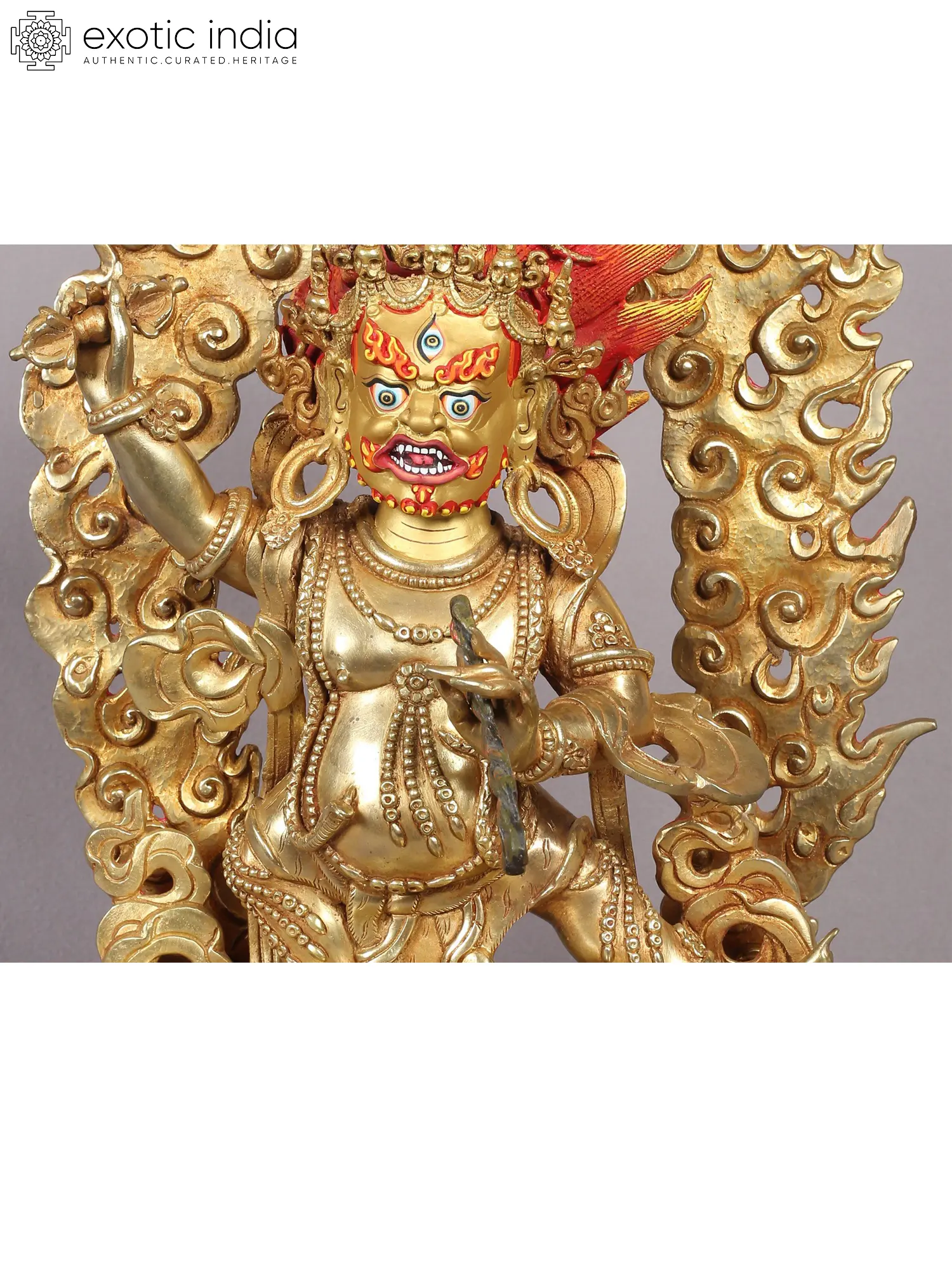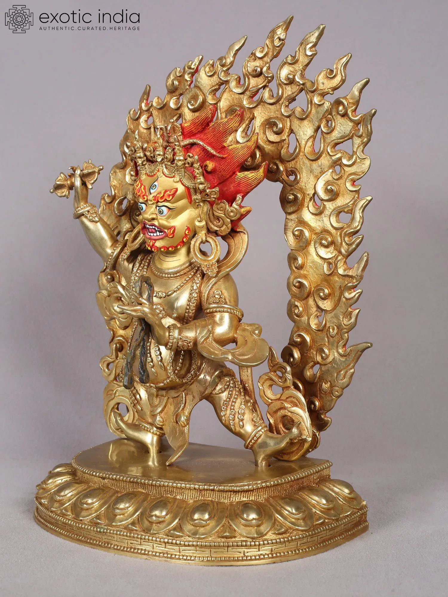This magnificent 12-inch statue from Nepal captures the awe-inspiring essence of Vajrapani, one of the primary Bodhisattvas in Mahayana Buddhism. Crafted from high-quality copper and adorned with exquisite gold plating, this deity idol is a testament to the rich artistic traditions of the region and the profound spiritual symbolism it represents. Vajrapani, whose name translates to "Vajra in Hand," is the embodiment of the power of all Buddhas. He is often depicted in a wrathful, yet compassionate, form, symbolizing his fierce protection against ignorance, delusion, and the obstacles that hinder spiritual progress. In Buddhist mythology, Vajrapani is seen as the successor to the Vedic deity Indra, having absorbed his thunderbolt (vajra) and his role as a protector. He is also considered the wrathful manifestation of Avalokiteshvara, the Bodhisattva of Compassion, demonstrating that even the most fierce energy can be harnessed for the ultimate benefit of sentient beings.