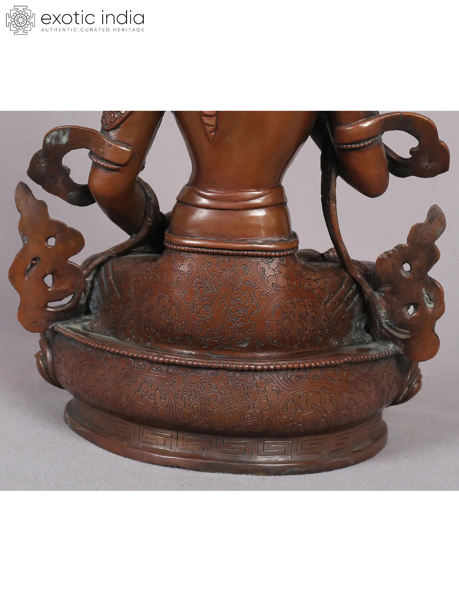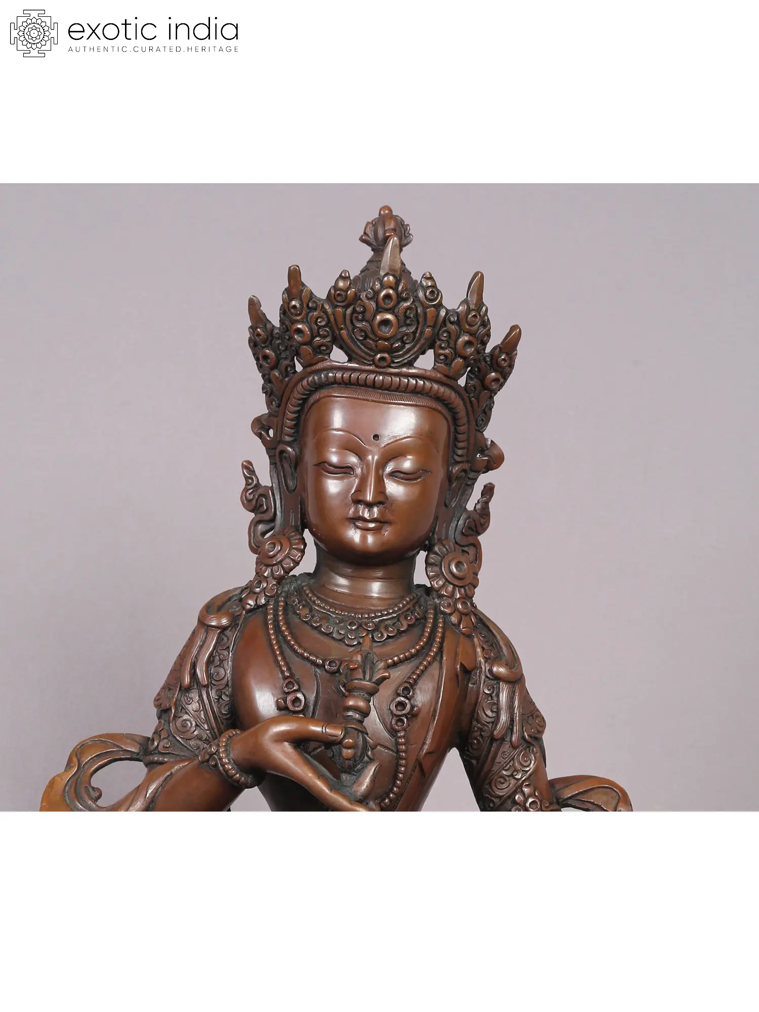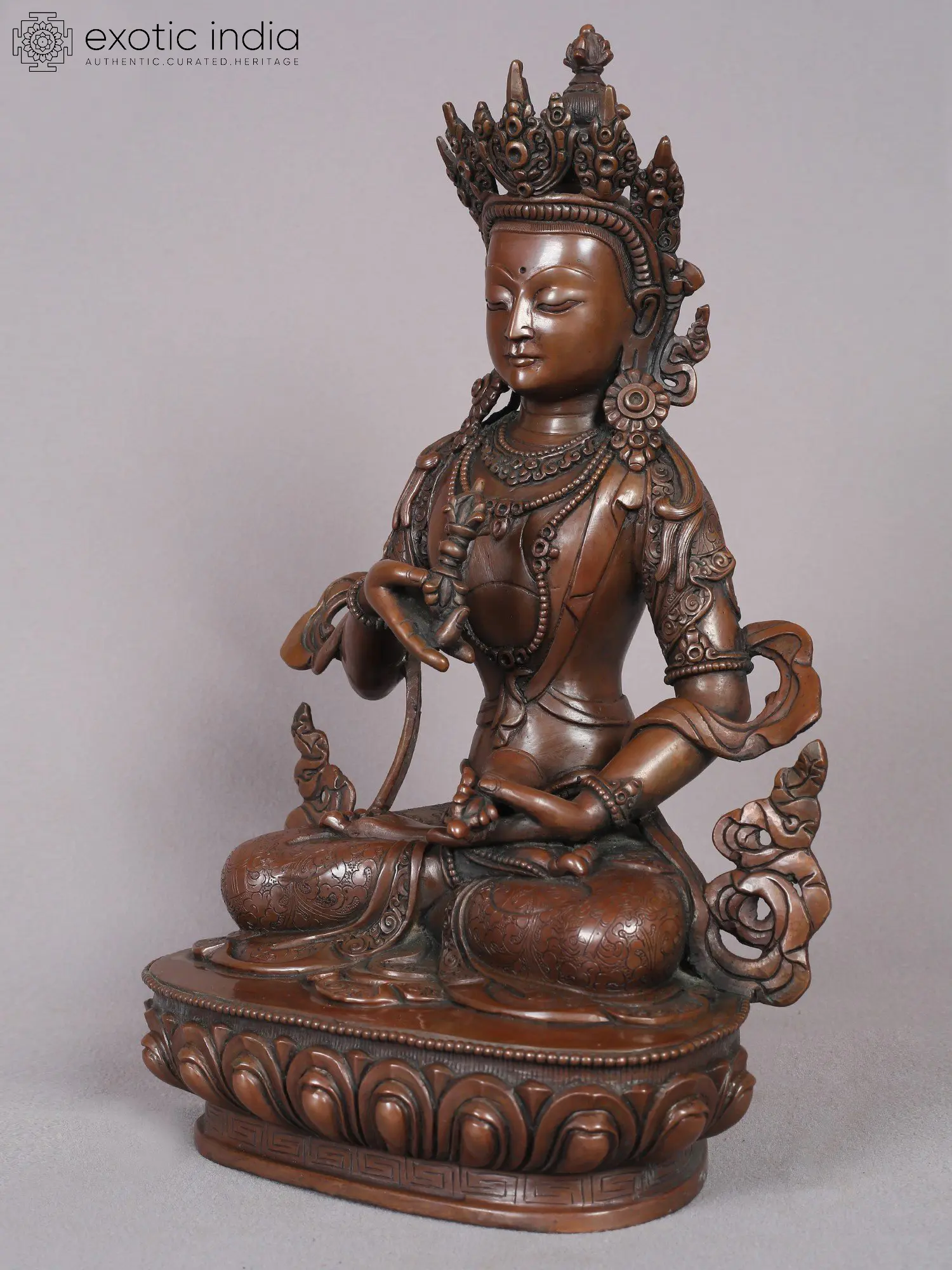 This copper masterpiece bears profound significance, every detail intricately crafted, from the regal crown's exquisite frills to the omnipresent Vajra. Vajrasattva's aura exudes purity, surrounded by celestial beings mirroring the inherent sanctity within all. Delicately sculpted hands cradle a bell and a vajra, epitomizing supreme wisdom and compassion—the dual virtues essential for traversing the path of Dhamma in Buddhism. Poised gracefully upon a lotus throne, his serene expression echoes the cosmic truth's profound stillness. Vajrasattva's divine energy paves the way to supreme wisdom, illuminating the path towards realizing your faultless true nature.