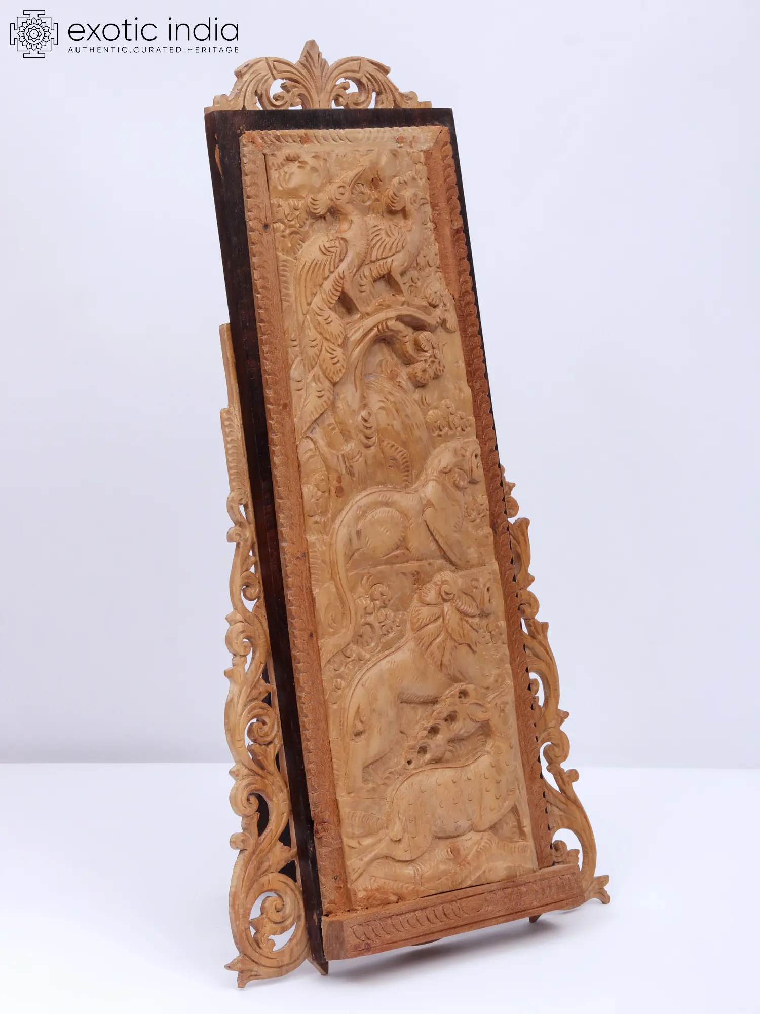 This sandalwood wood carving is more than just a beautiful decorative item. It is an heirloom piece that conveys a narrative of India's cultural tapestry, echoing the rich mythological tales and beliefs that have shaped its identity. It seamlessly blends into various settings, adding sophistication and a touch of authentic Indian artistry to your home. Whether displayed on a mantelpiece, a side table, or as part of a larger collection, this 12 x 6.5-inch framed piece is sure to become a cherished focal point, sparking conversations and adding a unique character to your living space. It is an invitation to delve into the mesmerizing world of Indian art and culture. Let this masterpiece become a treasured heirloom, connecting you with the artistry and heritage of India.