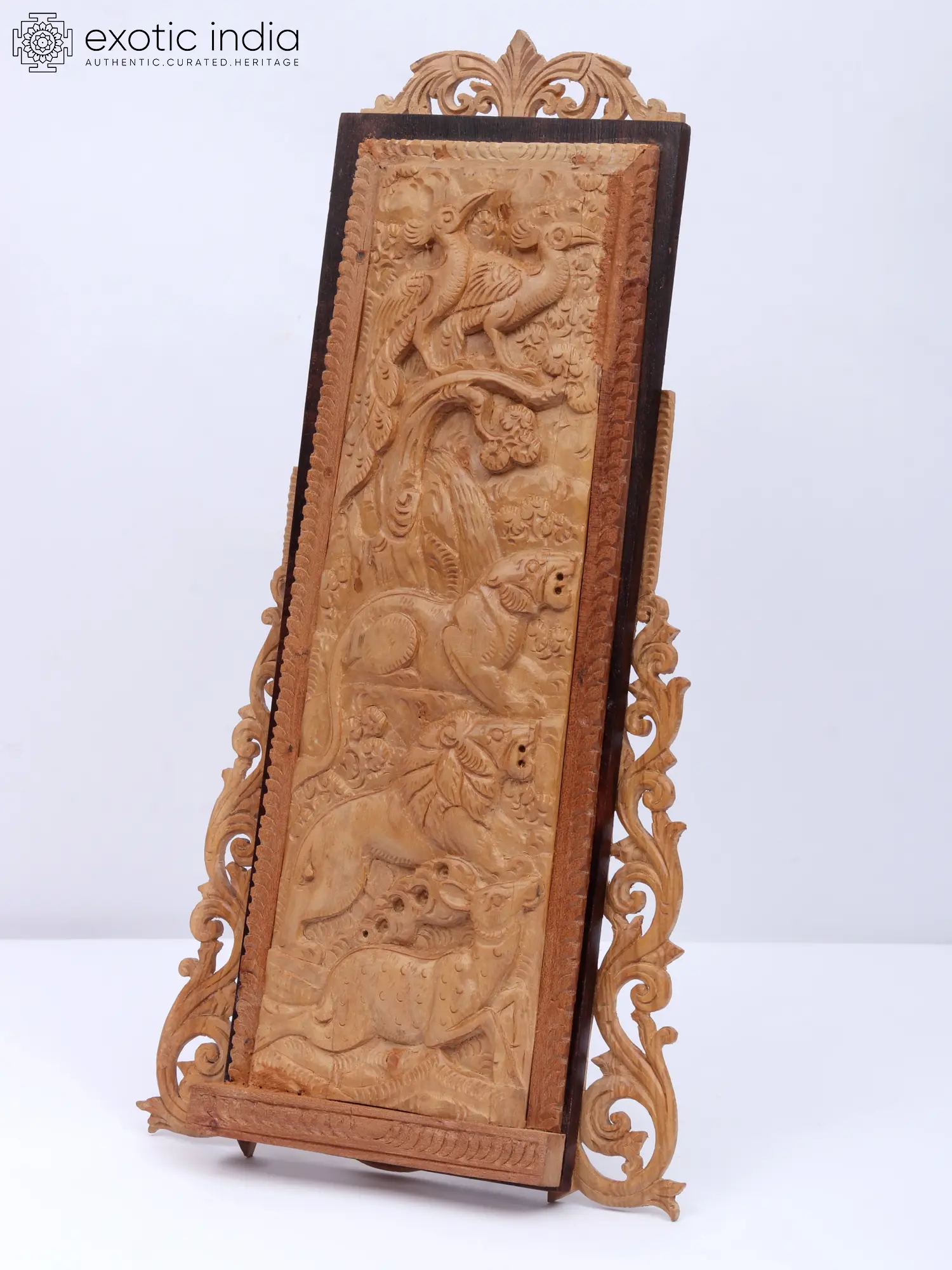 This exquisite 12-inch sandalwood wood carving frame transports you to the heart of India's vibrant wildlife. Meticulously handcrafted, this piece showcases a captivating tableau of animals gracefully integrated into a lush landscape. The intricate detail of each creature, from the elegant birds perched amidst foliage to the majestic deer and other animals depicted, speaks volumes of the artisan's skill and dedication. The warm, rich tones of the sandalwood beautifully complement the natural textures, lending an aura of timeless elegance to the artwork. More than just a decorative piece, it's a window into the soul of India, where nature and artistry intertwine in a captivating dance.
