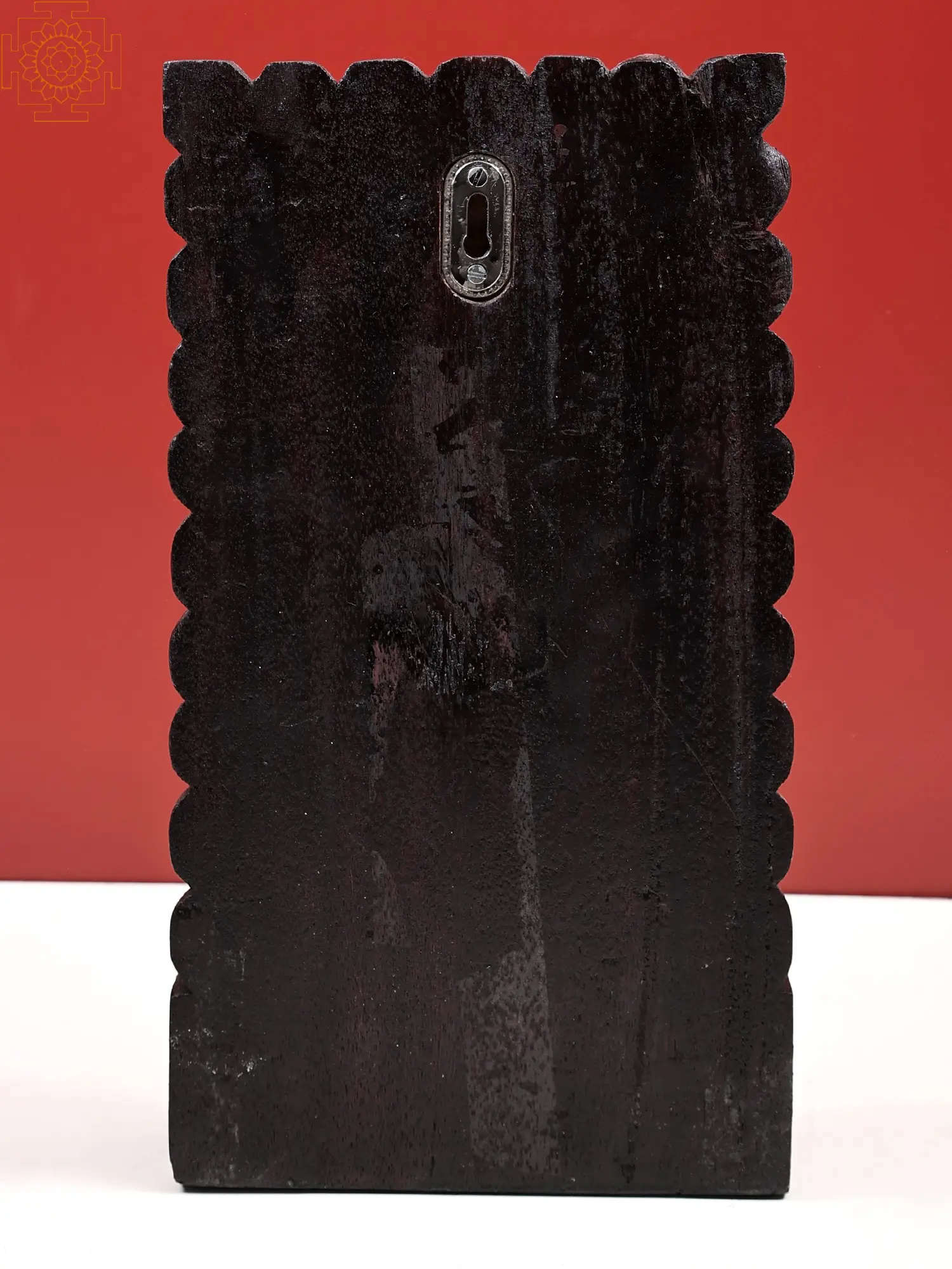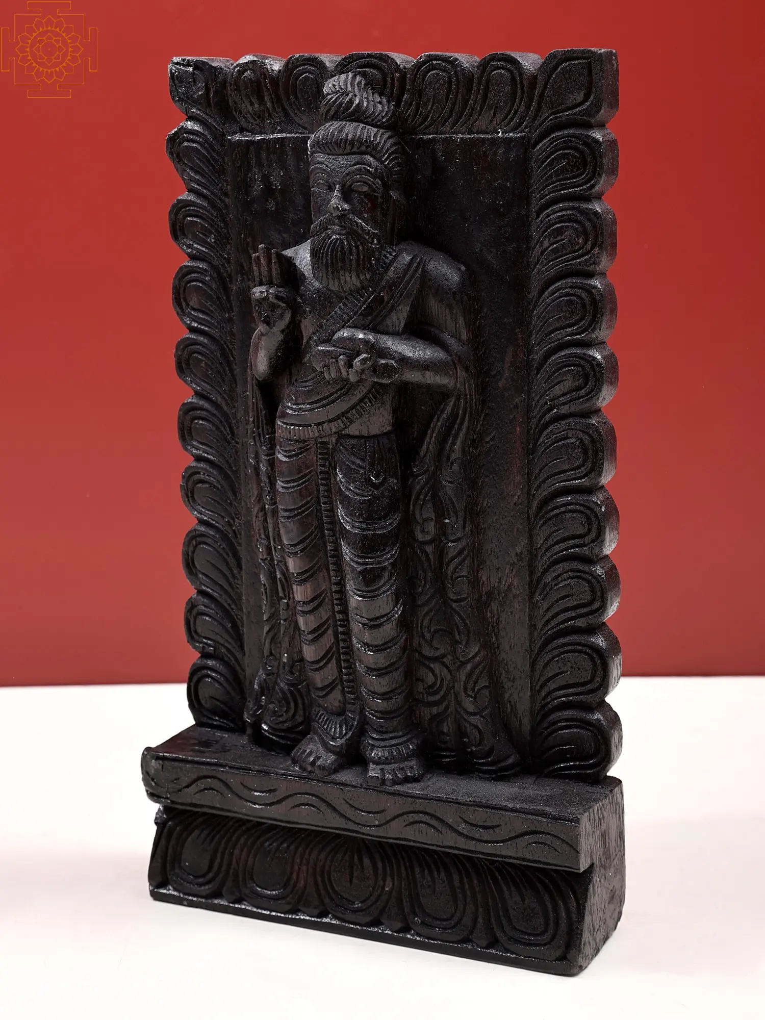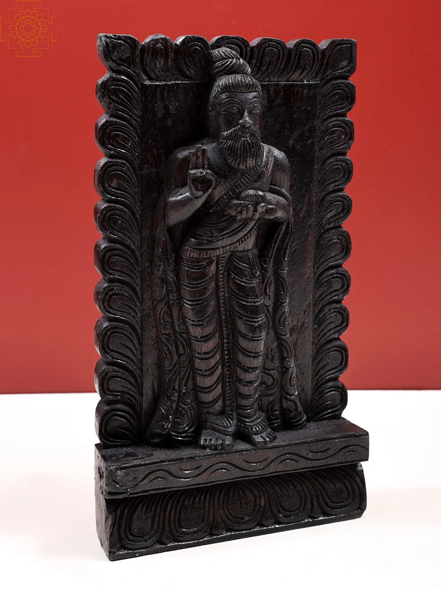 This Wooden Ancient Saint Thiruvalluvar Wall Hanging is inspired by the statue of the saint that has been established in Kanyakumari. Thiruvalluvar, the saint and well-known Tamil poet wrote the Thirukkural couplets. In this wooden wall hanging Lord Thiruvalluvar is seen standing in an almost tribhanga. The three fingers on the right hand of the statue, pointing skyward, represent the three combined cantos of the Kural text: Aram, Porul, and Inbam (virtue, wealth, and love, respectively). The wooden plank is beautifully carved and shows the tranquil face of Lord Tiruvalluvar. The lotus petal frame enhances the look of the wall hanging. This wooden piece is a very well-crafted art that carries spiritual significance.