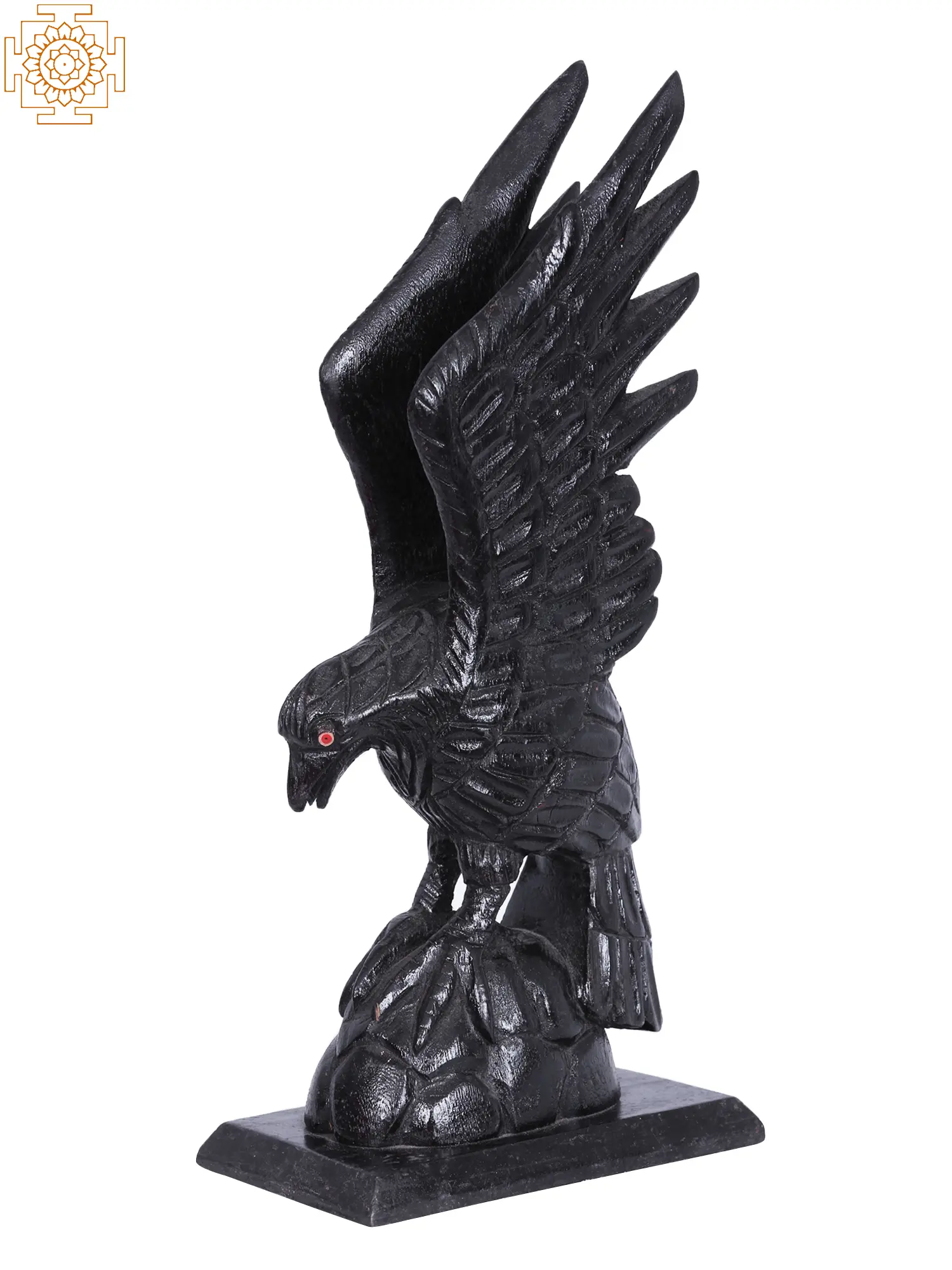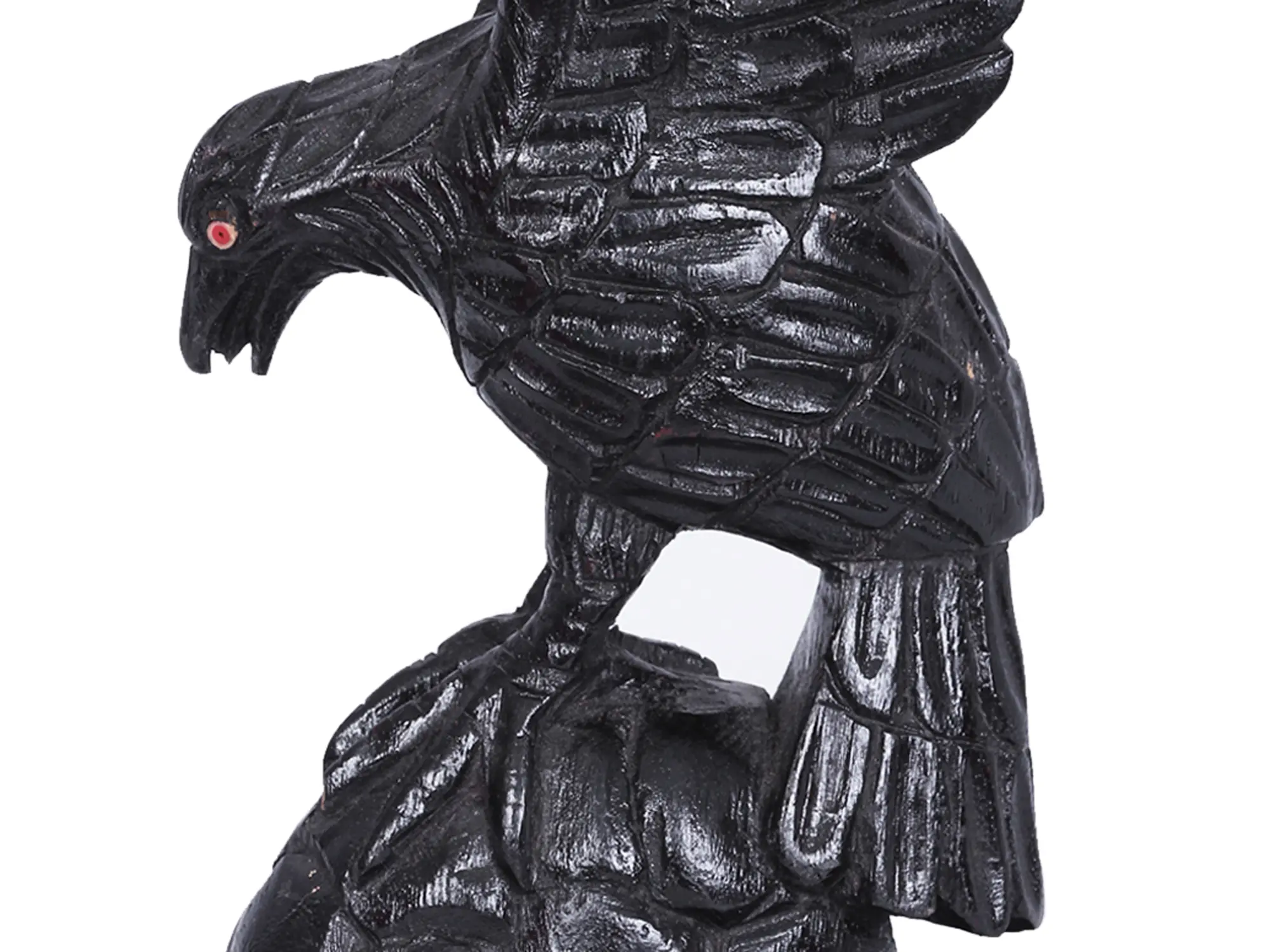 This exquisitely carved wooden eagle stands as a powerful emblem of strength, freedom, and keen foresight. Crafted from a solid piece of wood, its dark, rich finish enhances the intricate detailing, bringing to life every feather and contour of this magnificent avian predator. The posture is one of watchful vigilance, with wings outstretched, poised as if to take flight or defend its territory. The intense red of its eyes, carved with remarkable precision, conveys an unwavering focus and a sharp intelligence that has long been associated with the eagle.