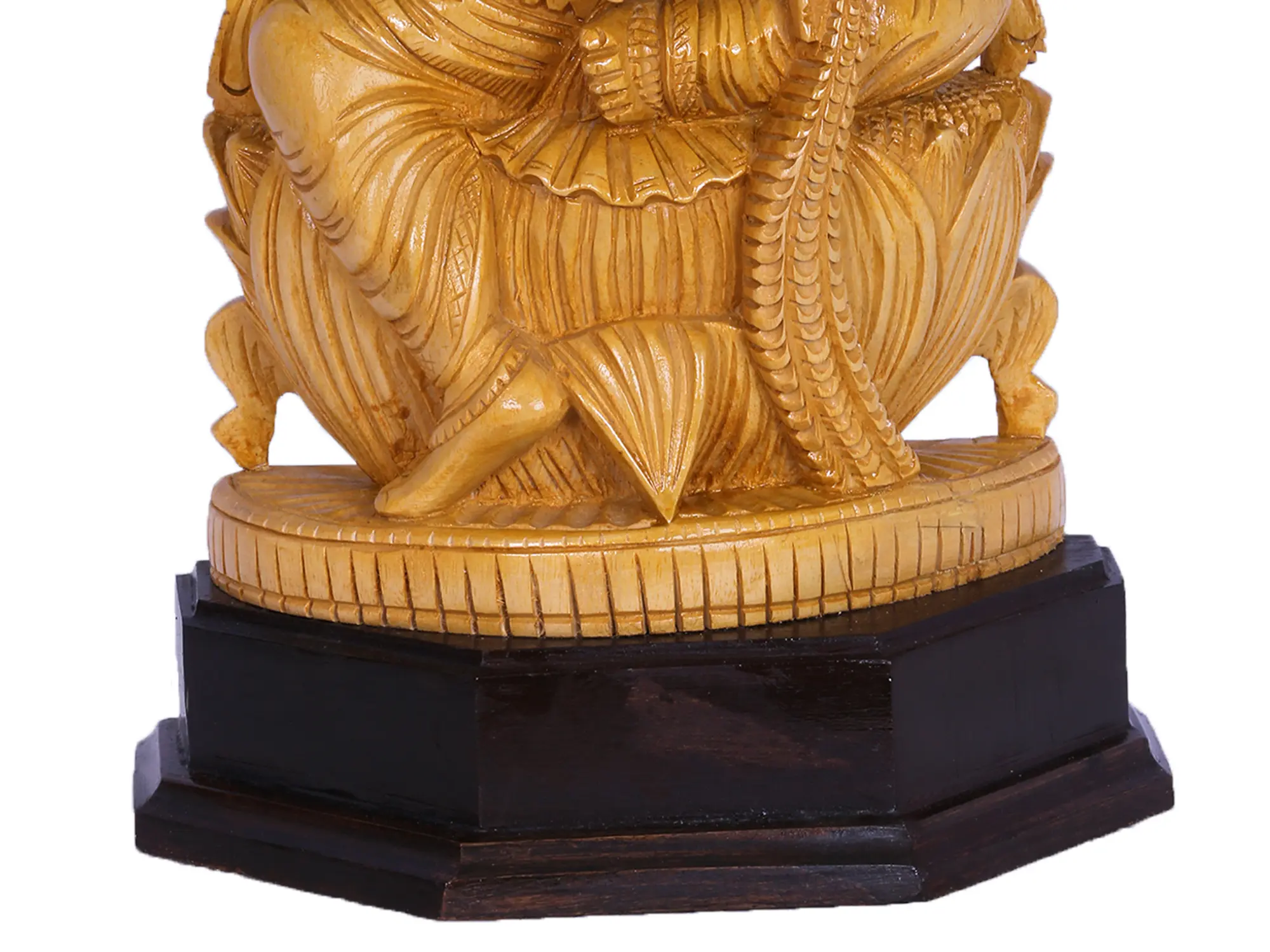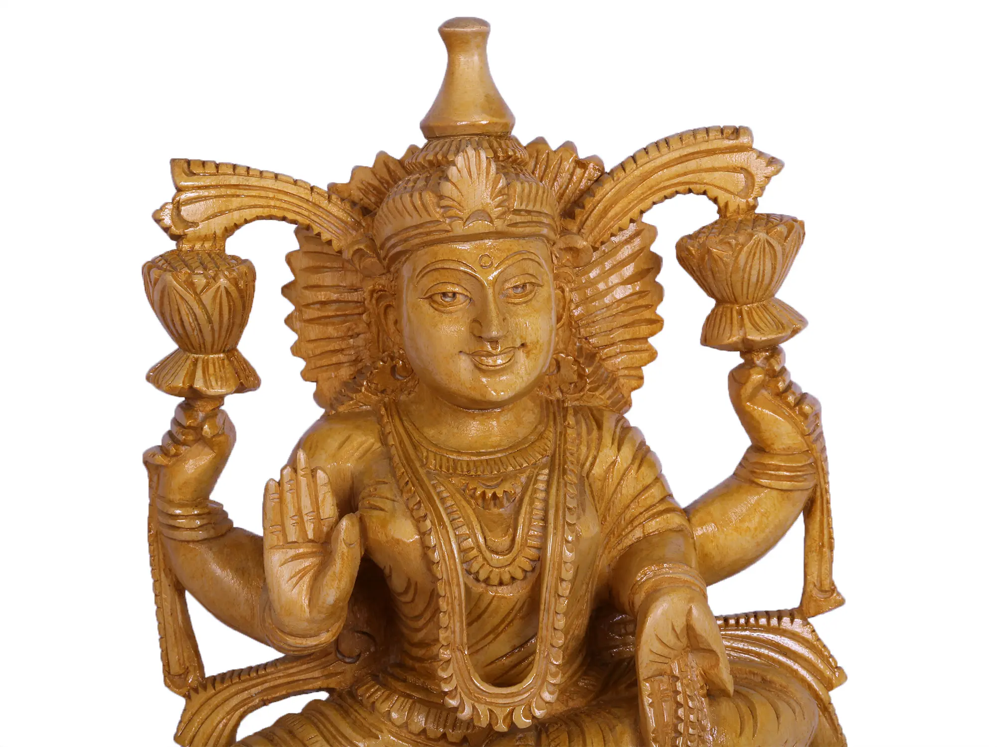 This 12-inch wooden sculpture is more than just a decorative item; it is a sacred object designed to be placed in a place of reverence, such as your puja room, meditation space, or any area where you seek to invite positive energy and abundance. Its compact size makes it versatile for various settings, while its commanding presence ensures it will be a focal point of spiritual contemplation and aesthetic appreciation. The natural wood provides a grounding energy, connecting the divine representation to the earth. By bringing this embodiment of Lakshmi into your space, you invite her auspicious blessings, fostering an environment of prosperity, peace, and fulfillment. It makes an ideal gift for housewarmings, weddings, festivals, or for anyone embarking on new ventures, seeking financial growth, or desiring a deeper spiritual connection.