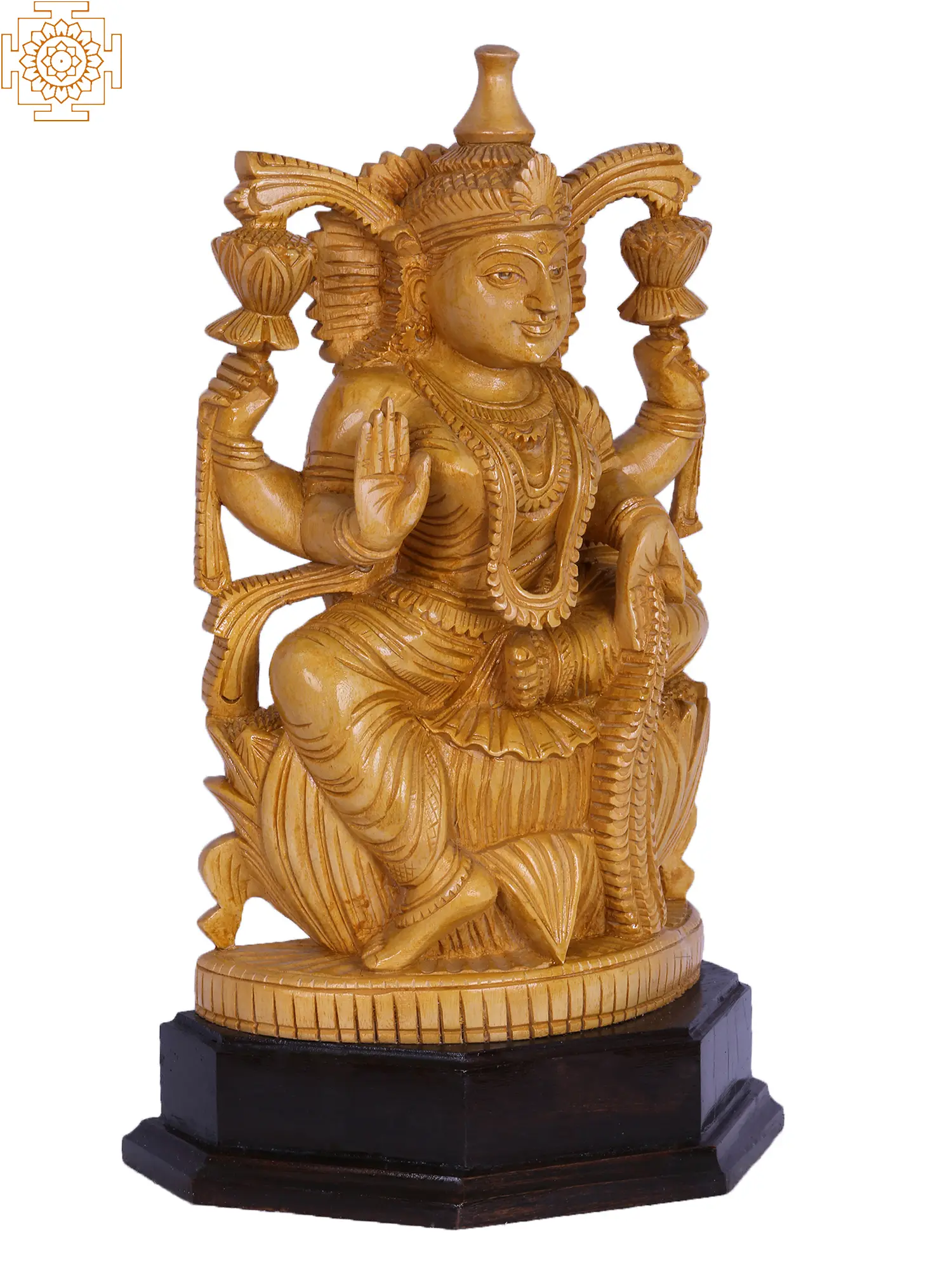 This sculpture is a testament to the skill of the artisan. The goddess is depicted with four arms, each holding symbolic objects that further enhance her divine attributes. In one hand, she may be shown bestowing blessings, while another might hold a lotus flower, representing beauty and spiritual growth. Often, she is seen holding a pot of gold coins, signifying material wealth, or a string of pearls, symbolizing good fortune and purity. The intricate carving of her adornments, the flowing robes, and the delicate details of the lotus throne all speak to a deep reverence for the divine form and a mastery of the craft. The rich texture of the wood is brought to life through careful shaping and finishing, creating a piece that is both visually striking and spiritually resonant. The inclusion of a Sri Yantra, a sacred geometric diagram representing the cosmos and the divine feminine energy, subtly incorporated within the design, further amplifies the spiritual potency of the piece. ––––––––––