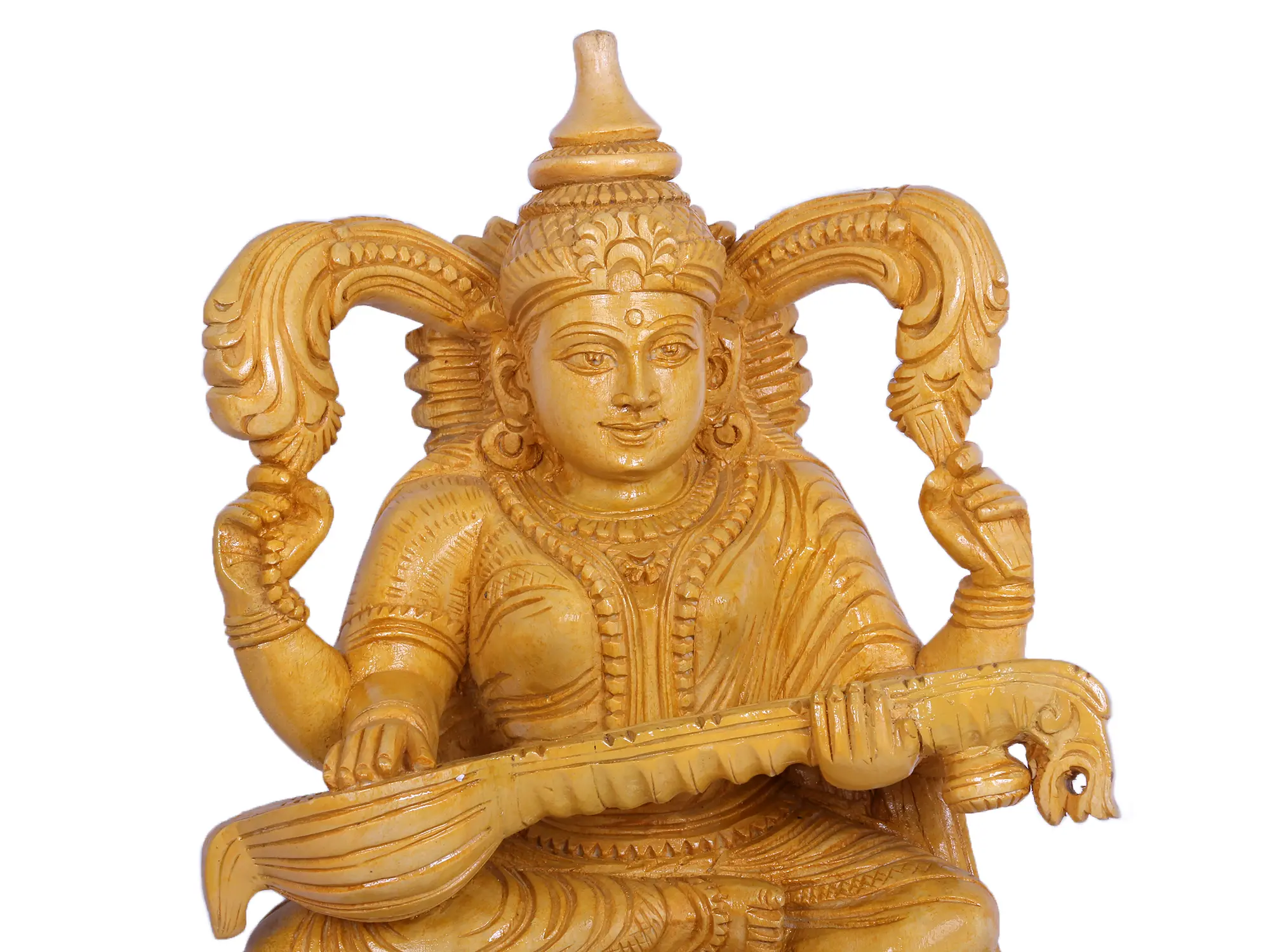 The intricate detailing of this wooden statue speaks volumes about the dedication and precision of its creation. From the delicate folds of her attire to the serene expression on her face and the finely crafted Veena, every element is rendered with remarkable accuracy. The warm, natural tone of the wood enhances the divine aura of the goddess, while the smooth finish invites touch and contemplation. This sculpture is not merely an object of religious devotion; it is a work of art that celebrates the aesthetic traditions and craftsmanship passed down through generations. Its presence is believed to bring peace, prosperity, and a heightened sense of inspiration to its surroundings, making it an ideal gift for students, artists, musicians, and anyone seeking to foster knowledge and creativity.