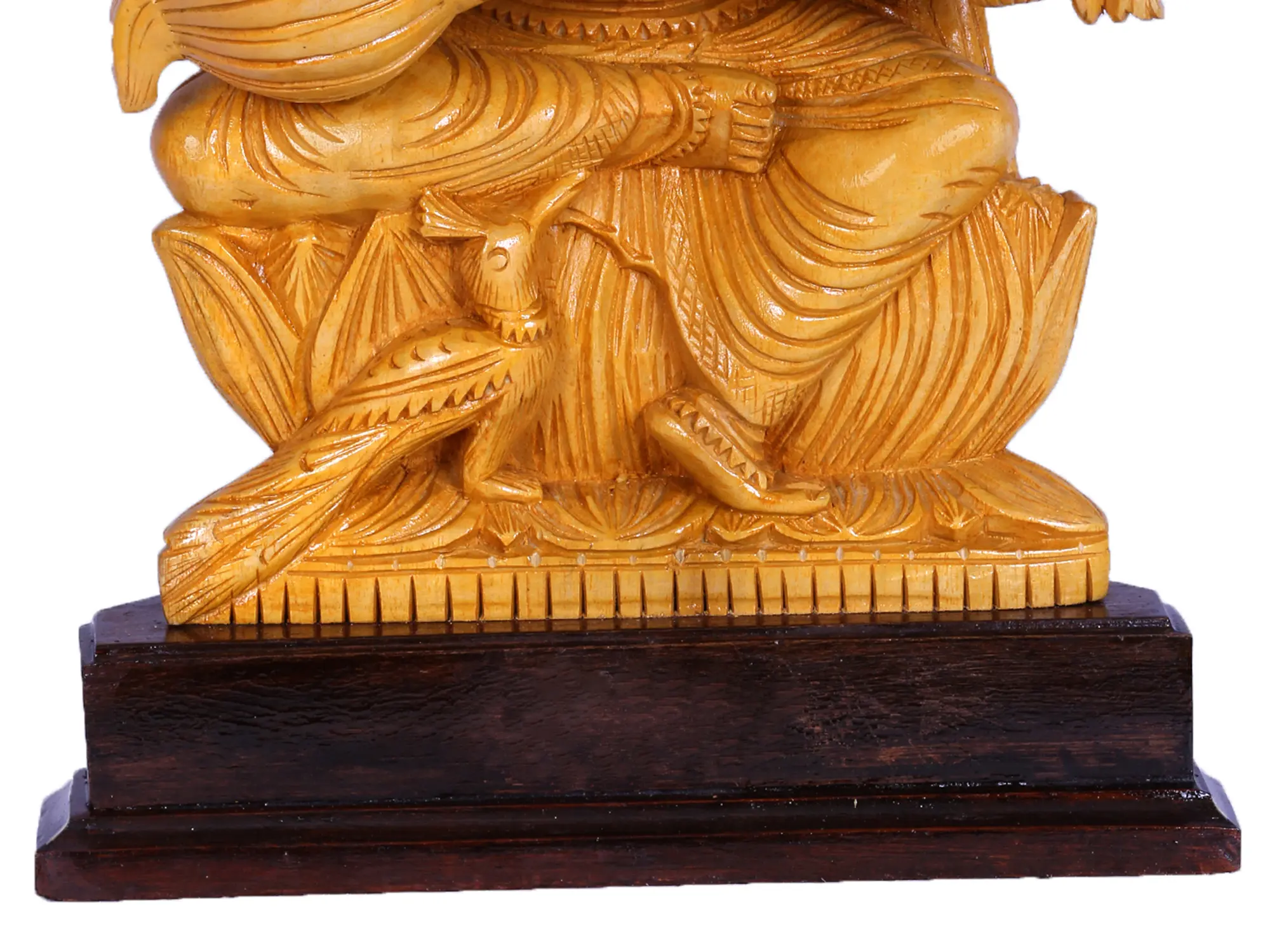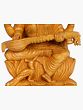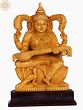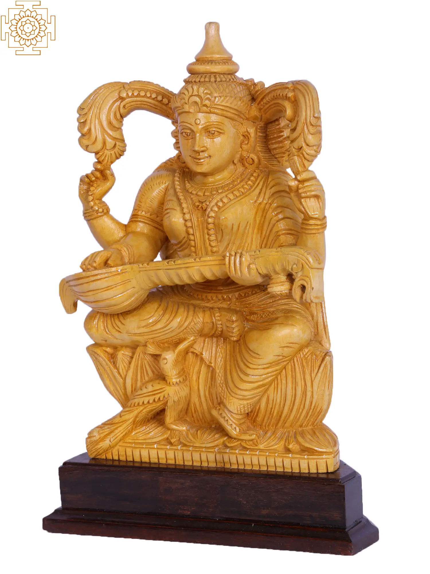 This exquisite wooden sculpture captures the divine essence of Goddess Saraswati, the Hindu deity of knowledge, music, arts, wisdom, and learning. Carved from a single piece of wood, this representation is a testament to the artisan's skill and devotion, bringing to life the benevolent presence of the goddess. Saraswati is often depicted as serene and graceful, seated on a lotus, playing her Veena. This sculpture embodies that tranquil yet powerful imagery, making it a captivating centerpiece for any space dedicated to learning, creativity, or spiritual contemplation.
