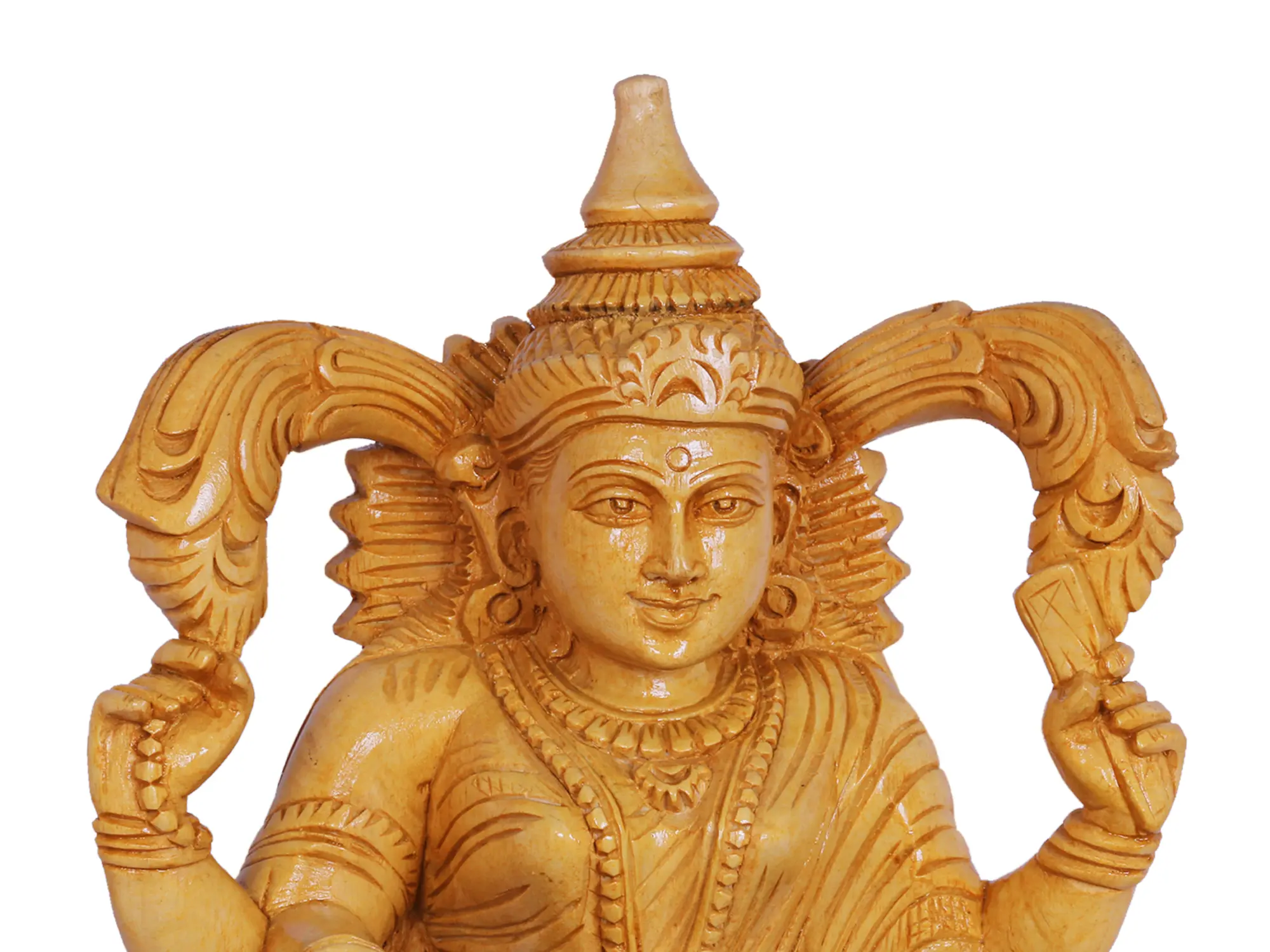As the eternal companion of Lord Brahma, she is the cosmic wellspring of creativity, her celestial presence guiding the universe’s creation. Draped in purity, her saree symbolizes untainted wisdom, a beacon in the cosmic expanse. Saraswati cradles a Veena, her melodic touch echoing through the cosmos, affirming her as the Goddess of Music. In her hands, a rosary and sacred book illuminate the path to enlightenment. Her simplicity transcends worldly desires, emphasizing spiritual pursuits. At her feet, the Swan glides, symbolizing pure consciousness, untouched by false ego.