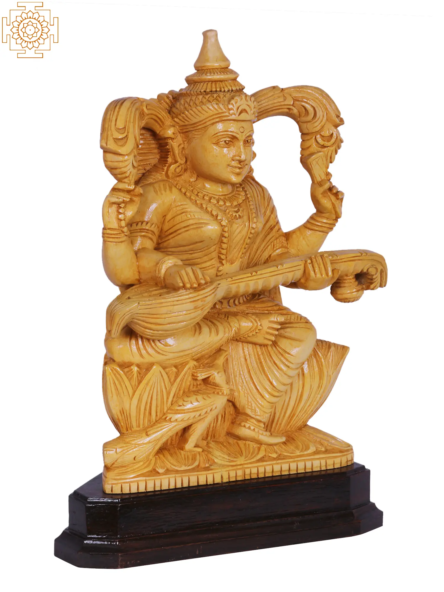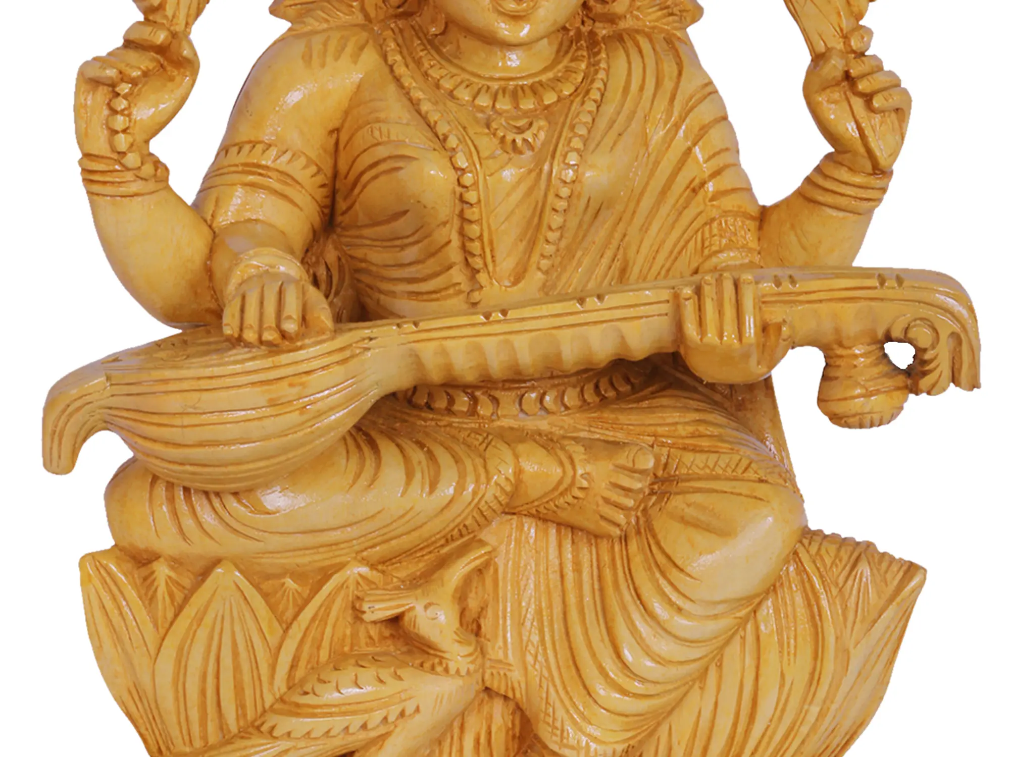 Goddess Saraswati, adorned in a beautiful dress, sits serenely on a lotus in Lalitasana, the embodiment of divine wisdom and knowledge.