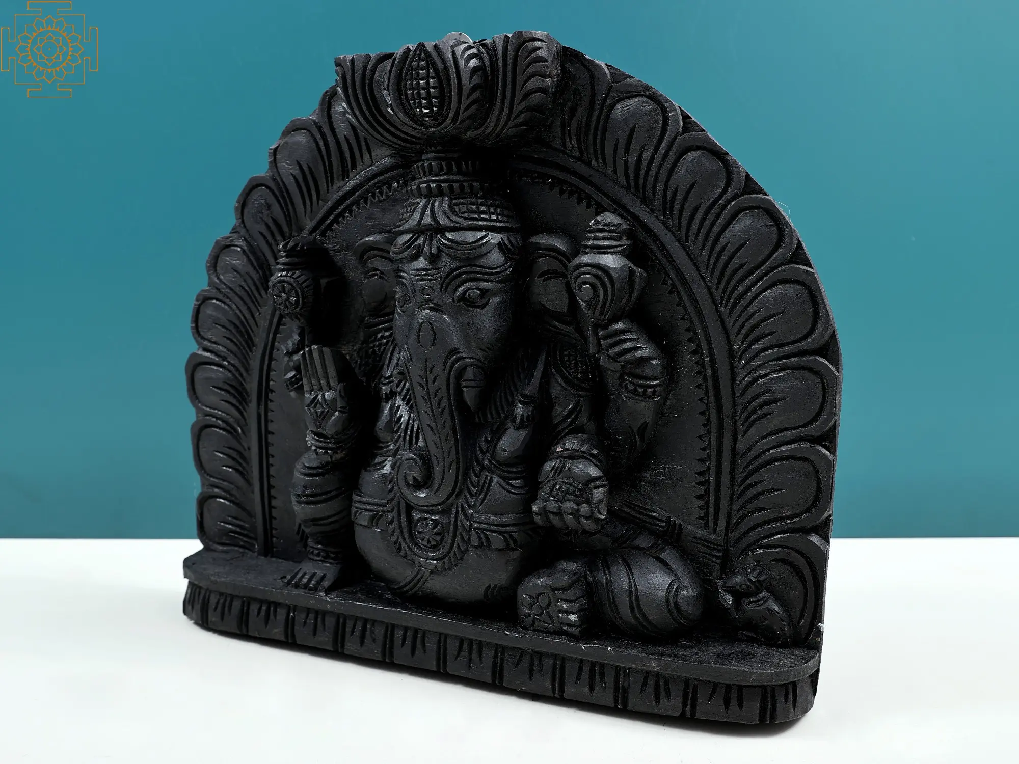 Each detail of this sculpture speaks to the skill of the artisan. The intricate carvings, from the ornate headdress to the flowing garments and the gentle curve of his trunk, showcase a deep understanding of Ganesha's iconography. The surrounding archway, intricately carved with floral motifs and radiating patterns, adds a sense of grandeur and frames the deity beautifully. This piece is not merely decorative; it is a testament to devotional artistry, crafted to inspire reverence and tranquility. Lord Ganesha's form itself is rich with symbolism. His elephant head represents wisdom, intellect, and strength. His large ears signify his ability to listen intently, while his small mouth suggests a temperance in speech. The large belly symbolizes his ability to digest all experiences, good and bad, with equanimity. This wooden rendition beautifully captures these symbolic attributes, inviting devotees to connect with the divine in a tangible way.