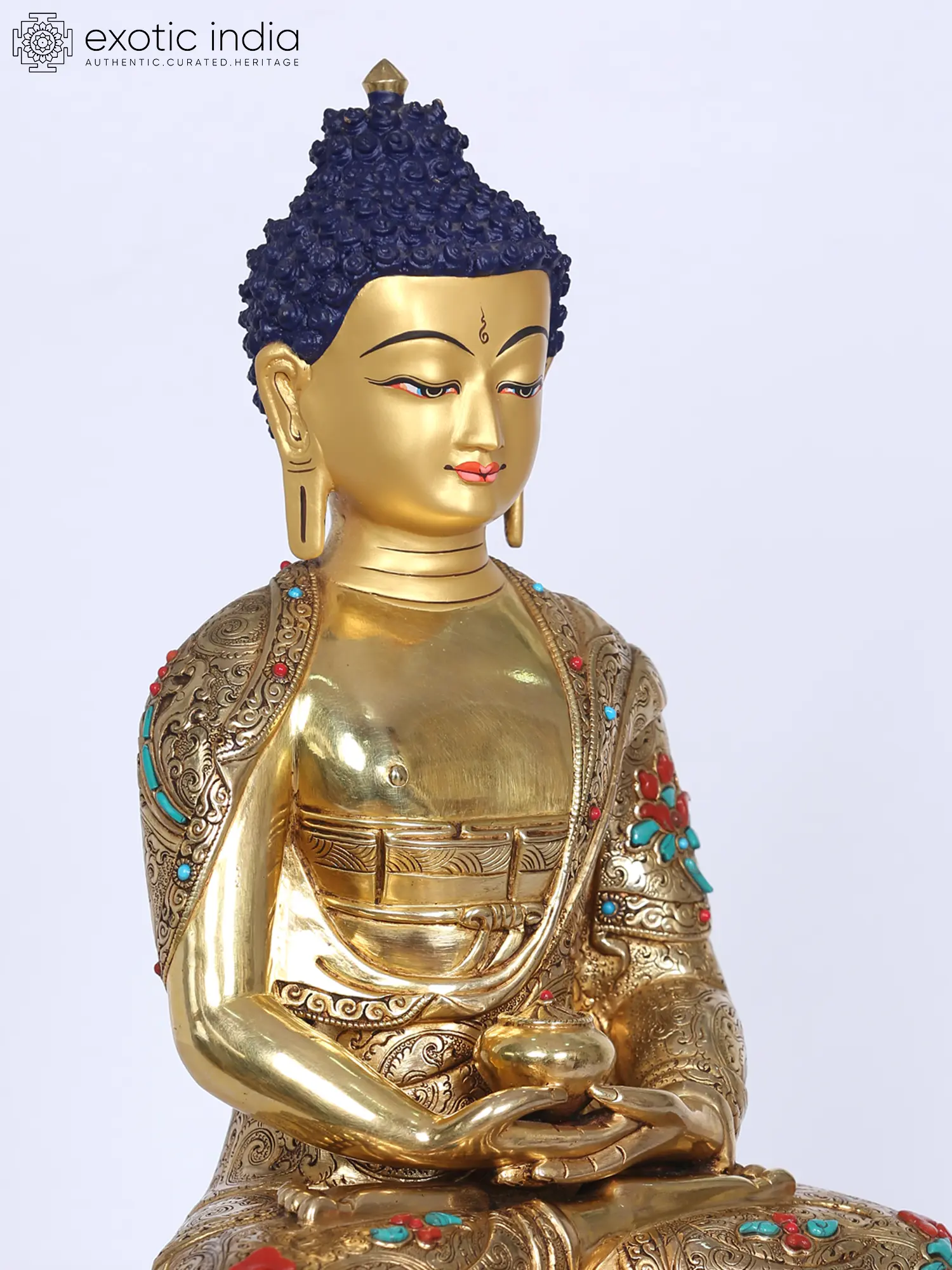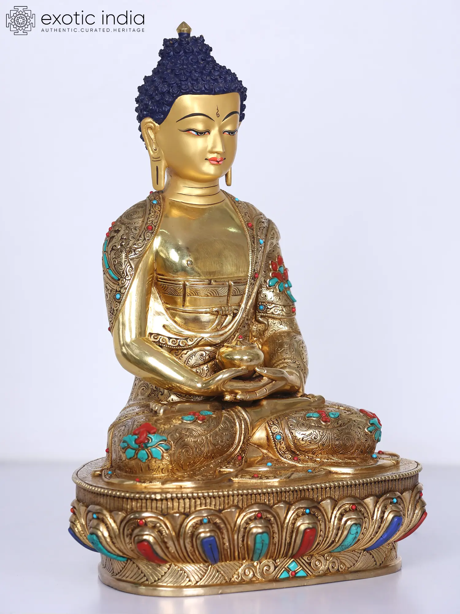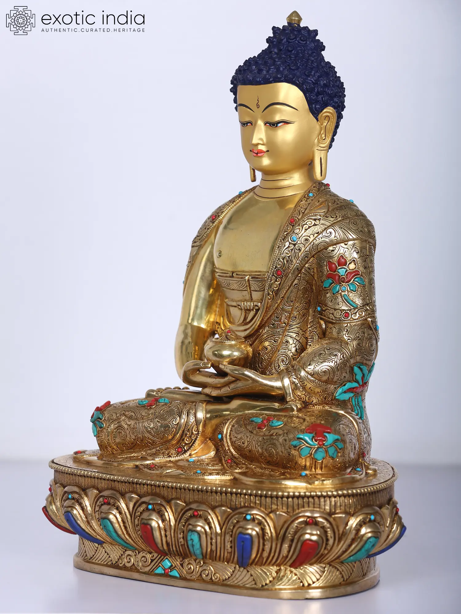 This Amitabha Buddha Copper Statue Gilded with Gold from Nepal is an enchanting pathway to the realm of transcendence. Delicately sourced from the artistic ateliers of Nepal, the statue showcases one of the most magnificent views of the tranquil form of Amitabha Buddha. Here Lord Buddha sits in a deep meditative pose with his eyes half closed as if intoxicated with all the knowledge that he gains while meditating. His beautifully painted curls complimented his golden face. He looks the most beautiful on earth. He sits in the Vajrasana pose with his hands in the Dhyani mudra. A bowl of elixir is placed above his hands.