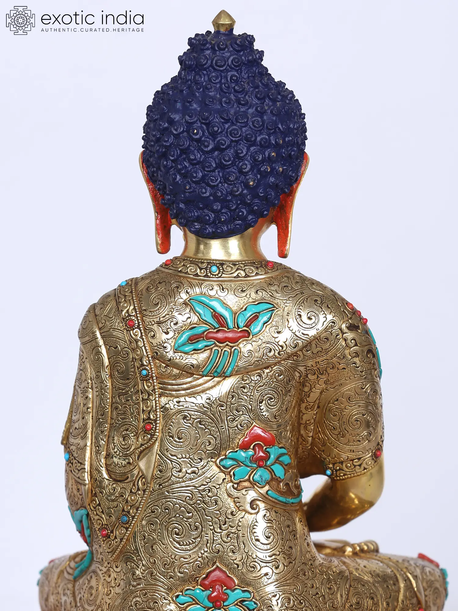 The body of Buddha is covered with a magnificently carved robe that is also beautified with inlay work. This sacred relic beckons admirers into a celestial narrative, where copper seamlessly melds with the lustrous embrace of gold leaf, bringing to life the benevolent Amitabha Buddha. Crafted with unparalleled precision, every contour tells a story of enlightenment and spiritual awakening. As if hailing from the heavens, this Nepalese treasure transcends mere artistry, inviting patrons to behold a tangible manifestation of divinity, a Copper Symphony of Nirvana that resonates through the corridors of time.