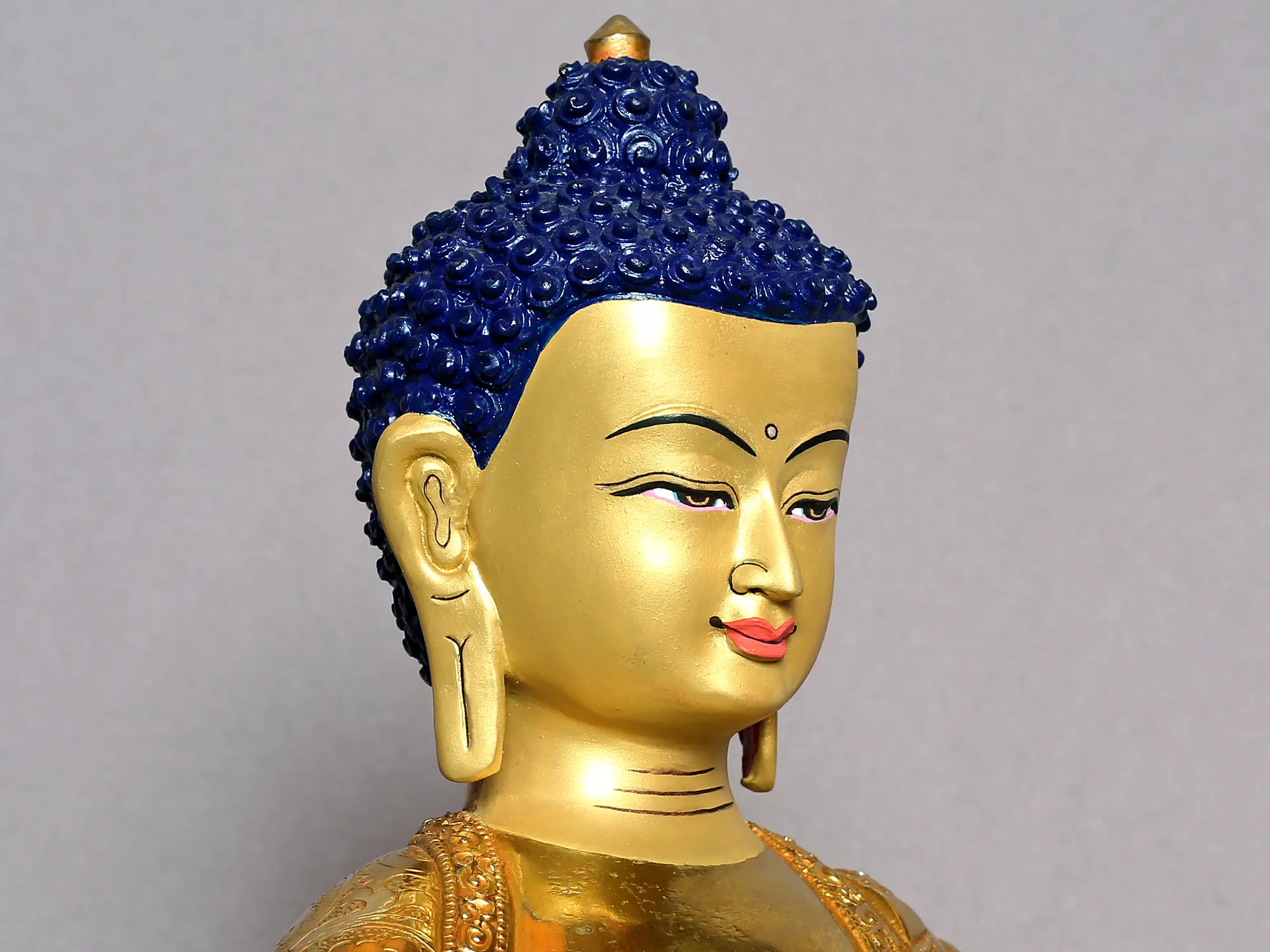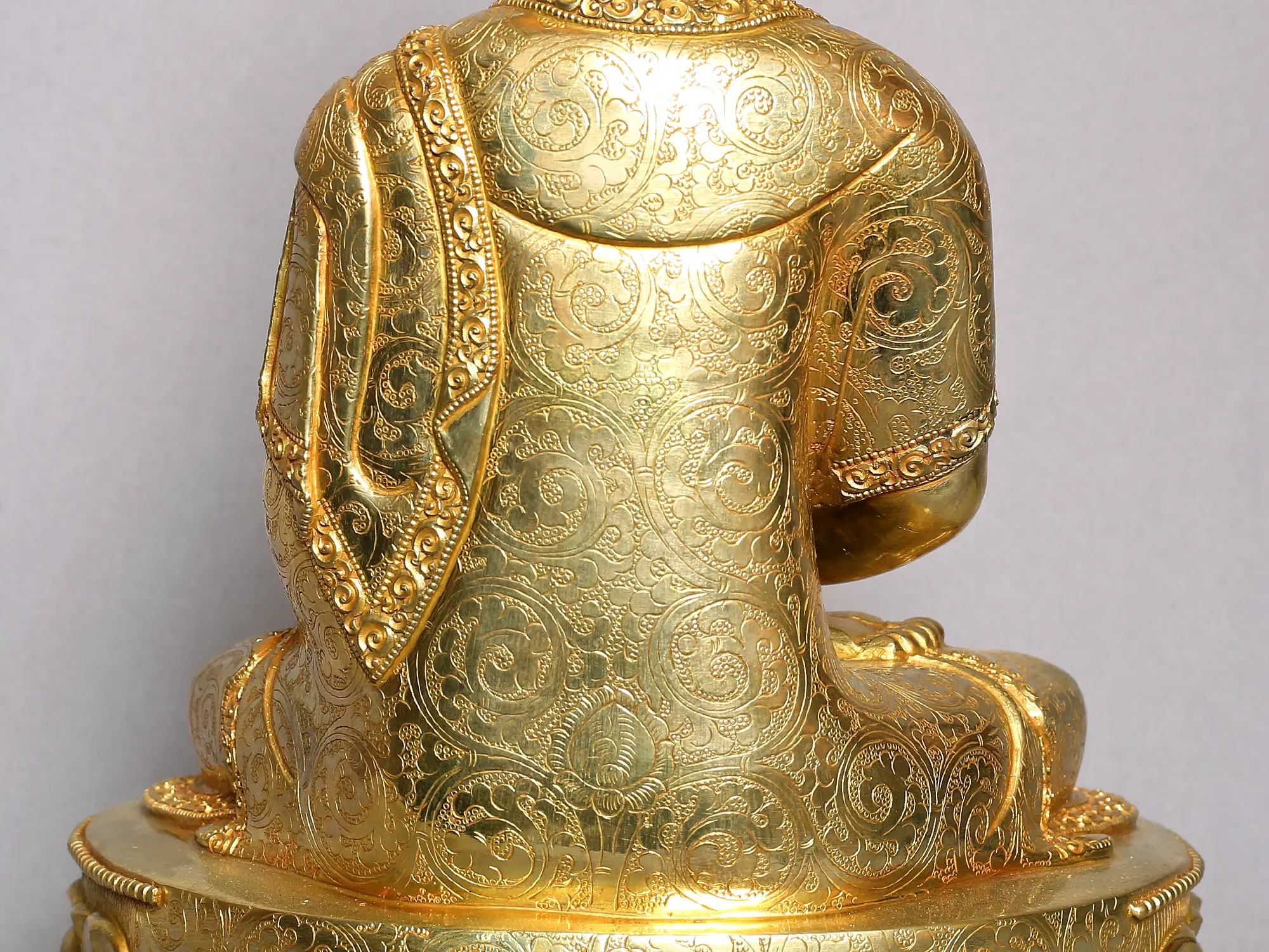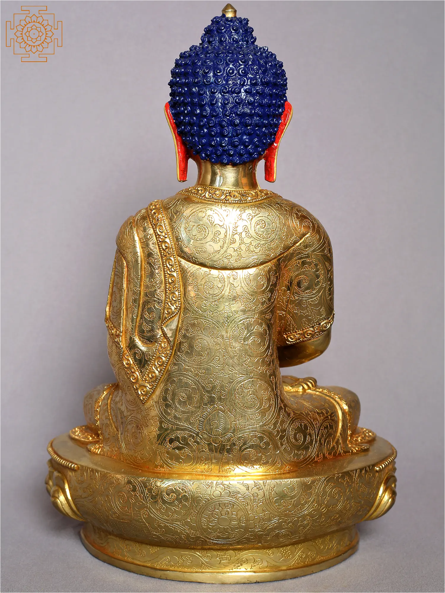 “Namo Amitabha Buddha”- I bow down to the supremely radiant one or Amitabha, is a popular chant in Pure Land Buddhism, devoted to the powers of Amitabha. Merely by chanting the name of Amitabha, without any elaborate rituals, one can gain his divine light, making Amitabha Buddha a widely worshipped deity in Buddhism. This glistening gilded copper statue from Nepal depicts the glorious Amitabha Buddha, seated on a lotus throne, adorned with a beautifully patterned robe. His hands are in his lap, in the gesture of meditation or Dhyana mudra, on which the alms bowl is placed. With symmetrically curling hair, defined eyes and inwardly smiling lips, Amitabha fills the statue with his celestial light, making this a blissful representation for his devotees.