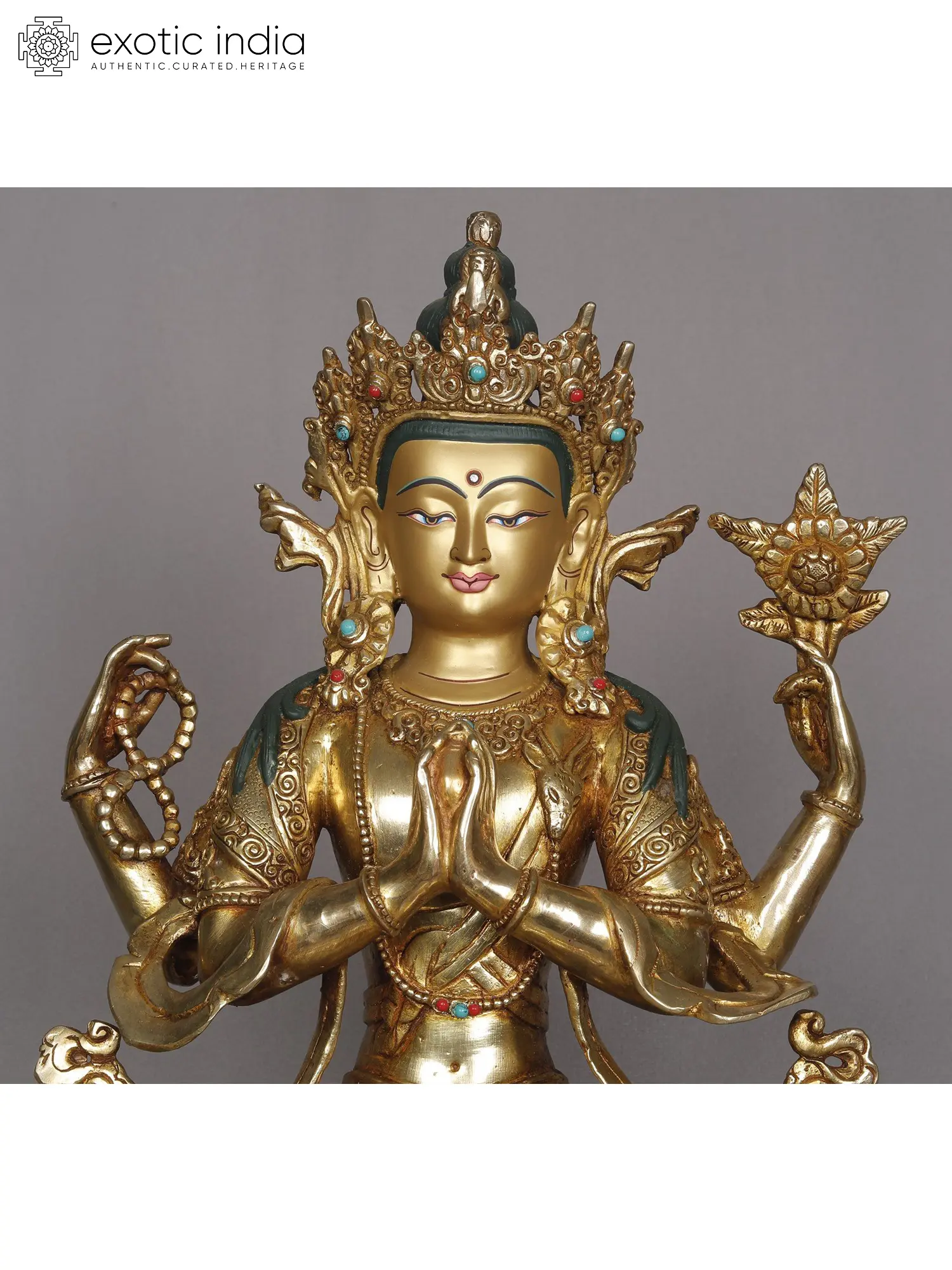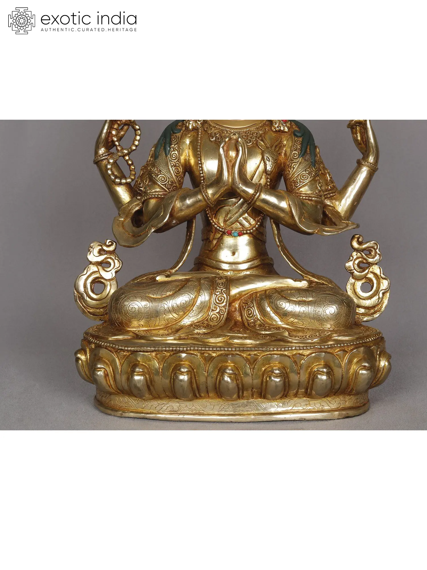 The embodiment of longevity, Aparmita (also known as Amitayus) represents Buddha Amitabha in his aspect as the Bestower of Long Life. This celestial figure could be seen as a transcendent Buddha or a fully realized Bodhisattva, having achieved Buddhahood over countless lifetimes as a Bodhisattva. In the gesture of meditation, his palms rest face up in his lap, cradling the ambrosia treasure vase, his unique symbol. His right hand, placed above, signifies enlightenment, while the left hand, positioned below, represents the world of appearances. This posture signifies mastery over appearance through enlightenment, reflecting the unity of samsara and nirvana in his enlightened state of mind.