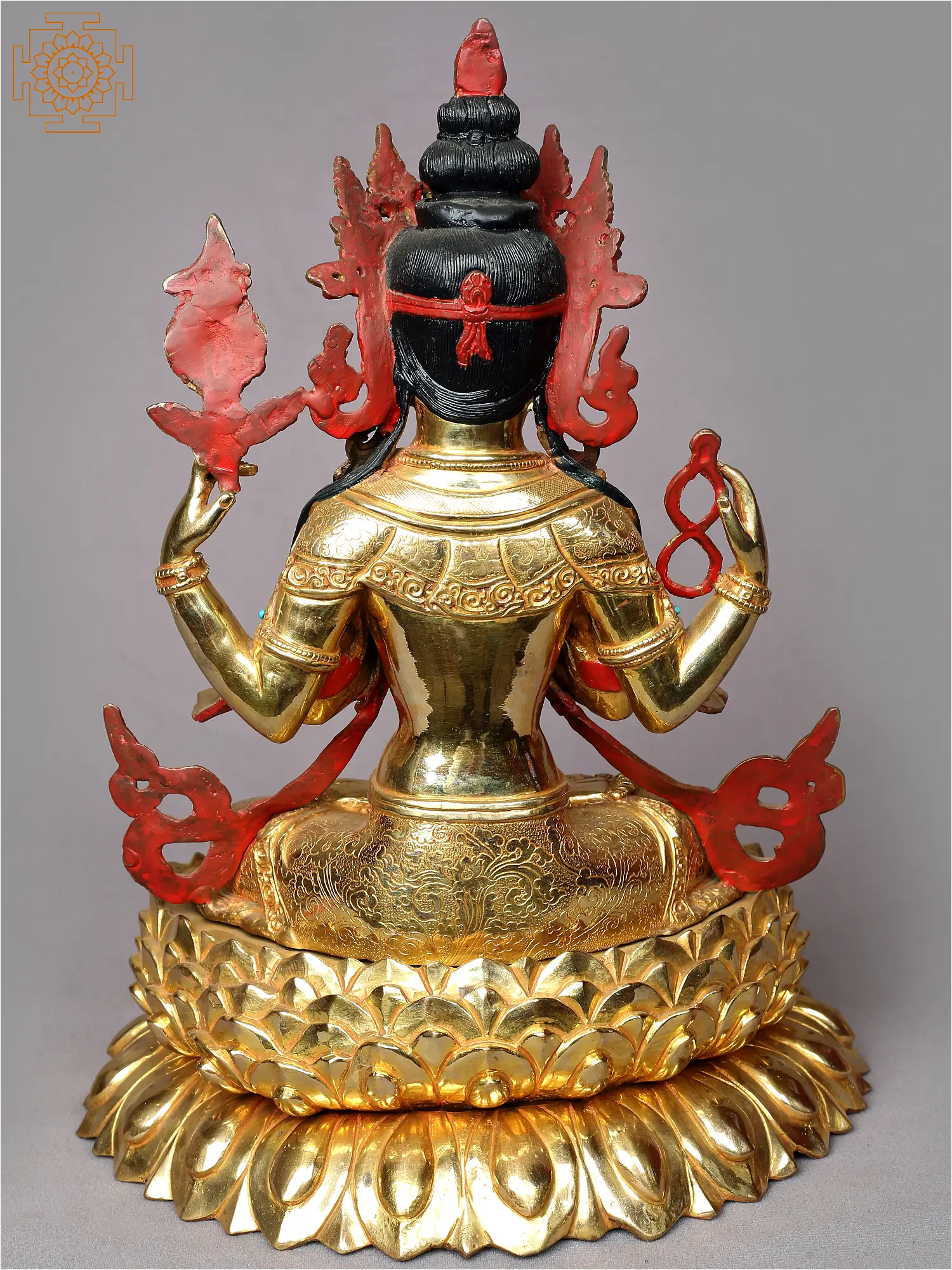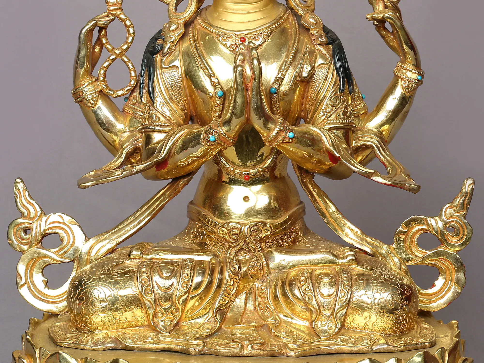 With a tranquil glow coming forth from his body and a golden radiance on his face, Bodhisattva Chenrezig's gilded copper statue from Nepal creates a wonderful atmosphere with his presence. In Tibetan Buddhism, Chenrezig (Tibetan) or Avalokiteshvara is the most well-known Bodhisattva, worshipped for his protection and kindness. He is also referred to as "Shadakshari" in his four-armed form, a reference to his six-syllable mantra (Shad, Akshar).