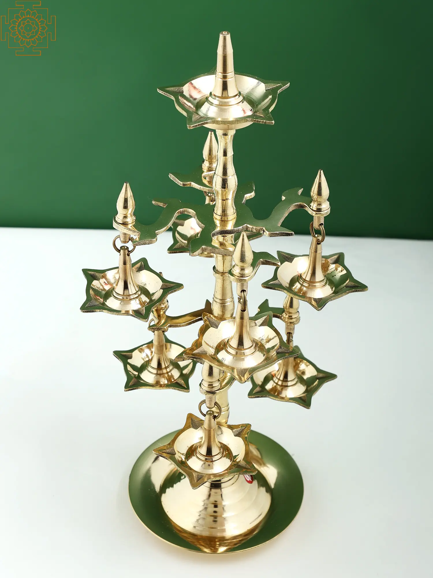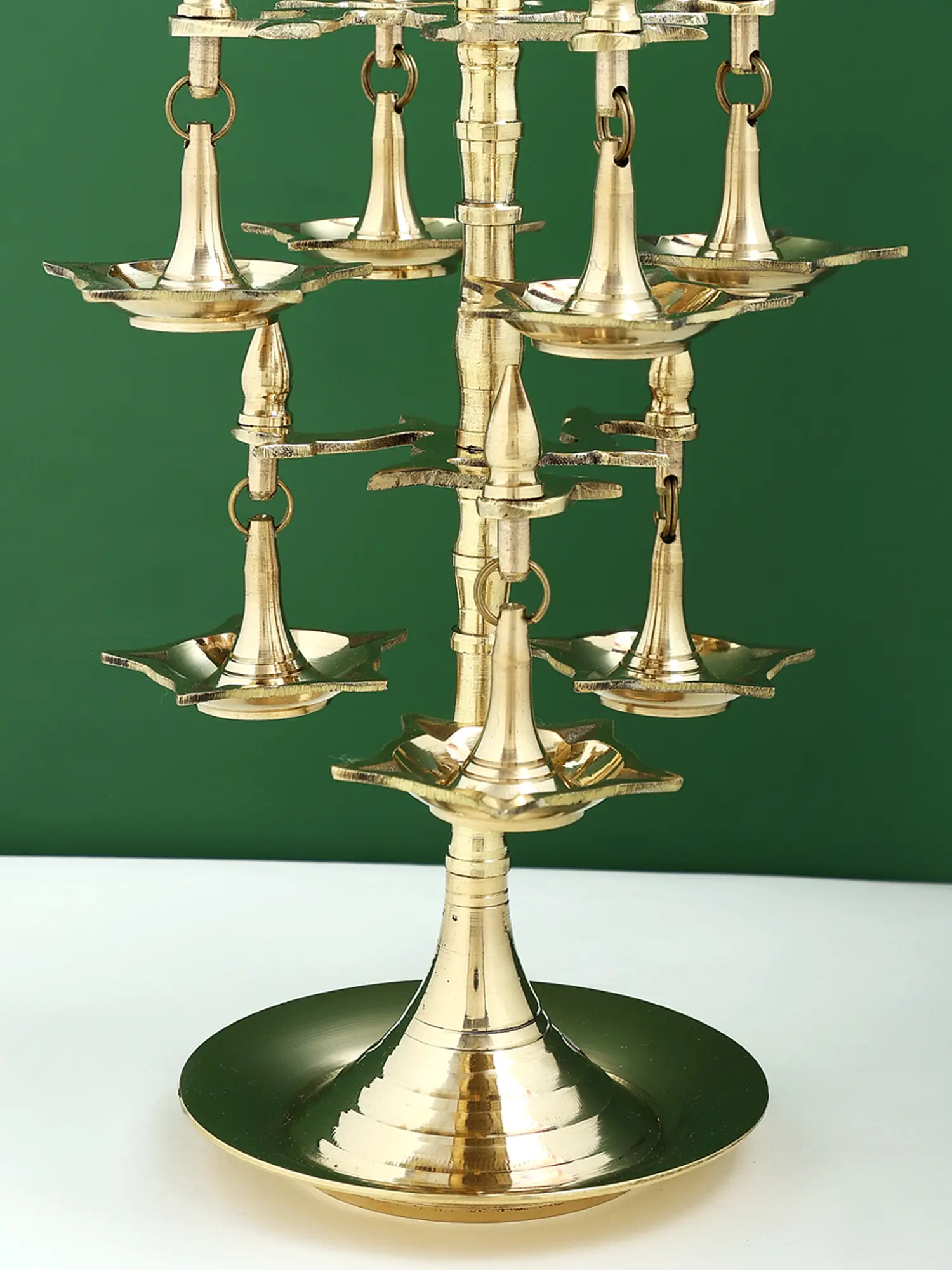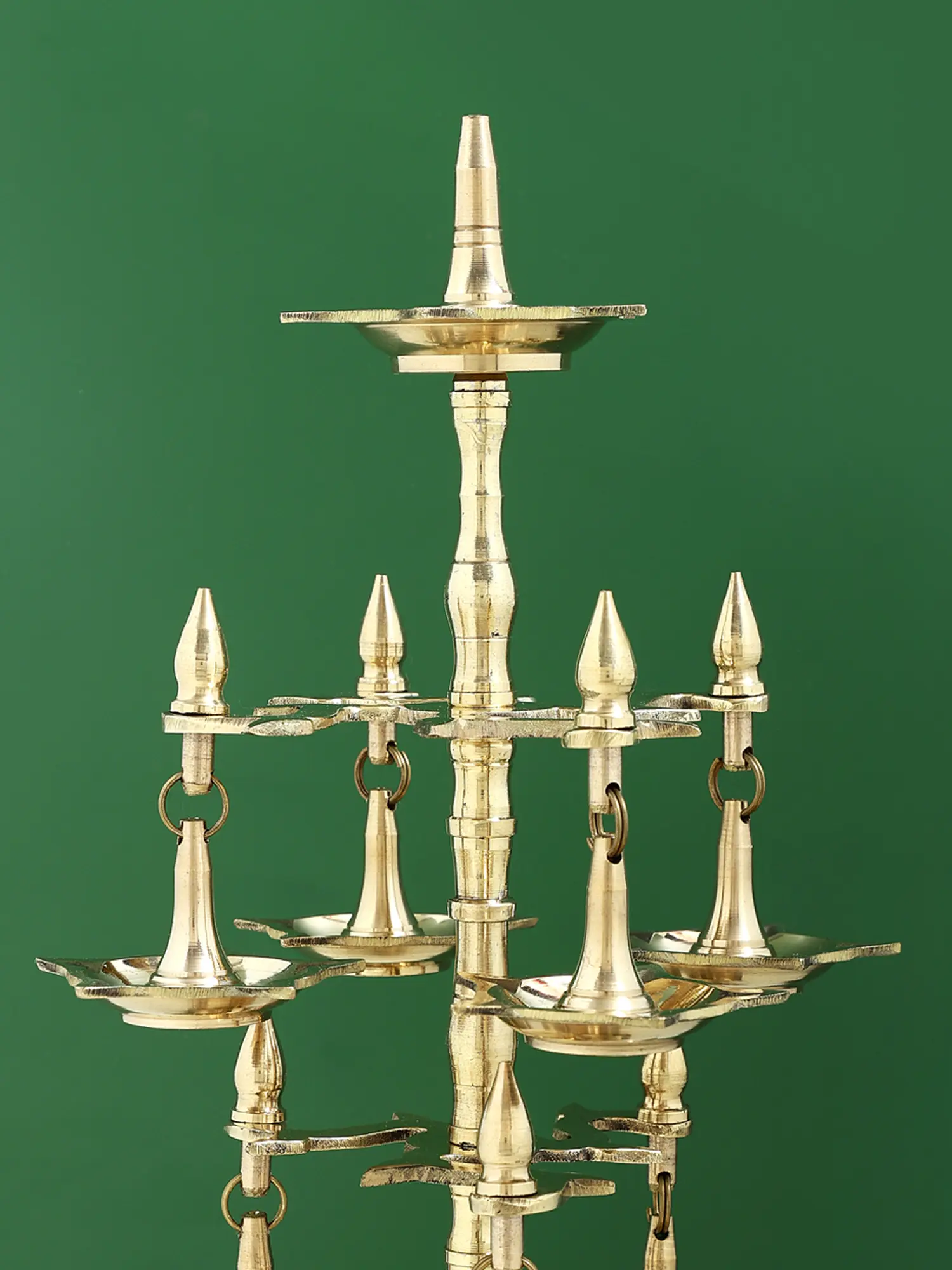 This Ashtothira Deepam is a one-of-a-kind and historically significant ceremonial item. It can be disassembled and reassembled, making cleaning and reassembling the light simple. It is composed of metal and has stacked as well as hanging lamps. The Ashtothira is depicted by 108 dangling geometric figures grouped in tiers. The celestial number 108 is represented by the 108 Mukhya Shivaganas and the 108 edges of Lord Vishnu's holy discus, the Sudarshan Chakra. There is also a sturdy disc-shaped base that supports the lamp's weight. The sparkling lights are stunning; the entire lamp gives the sensation that the entire world is being drawn into the temple.