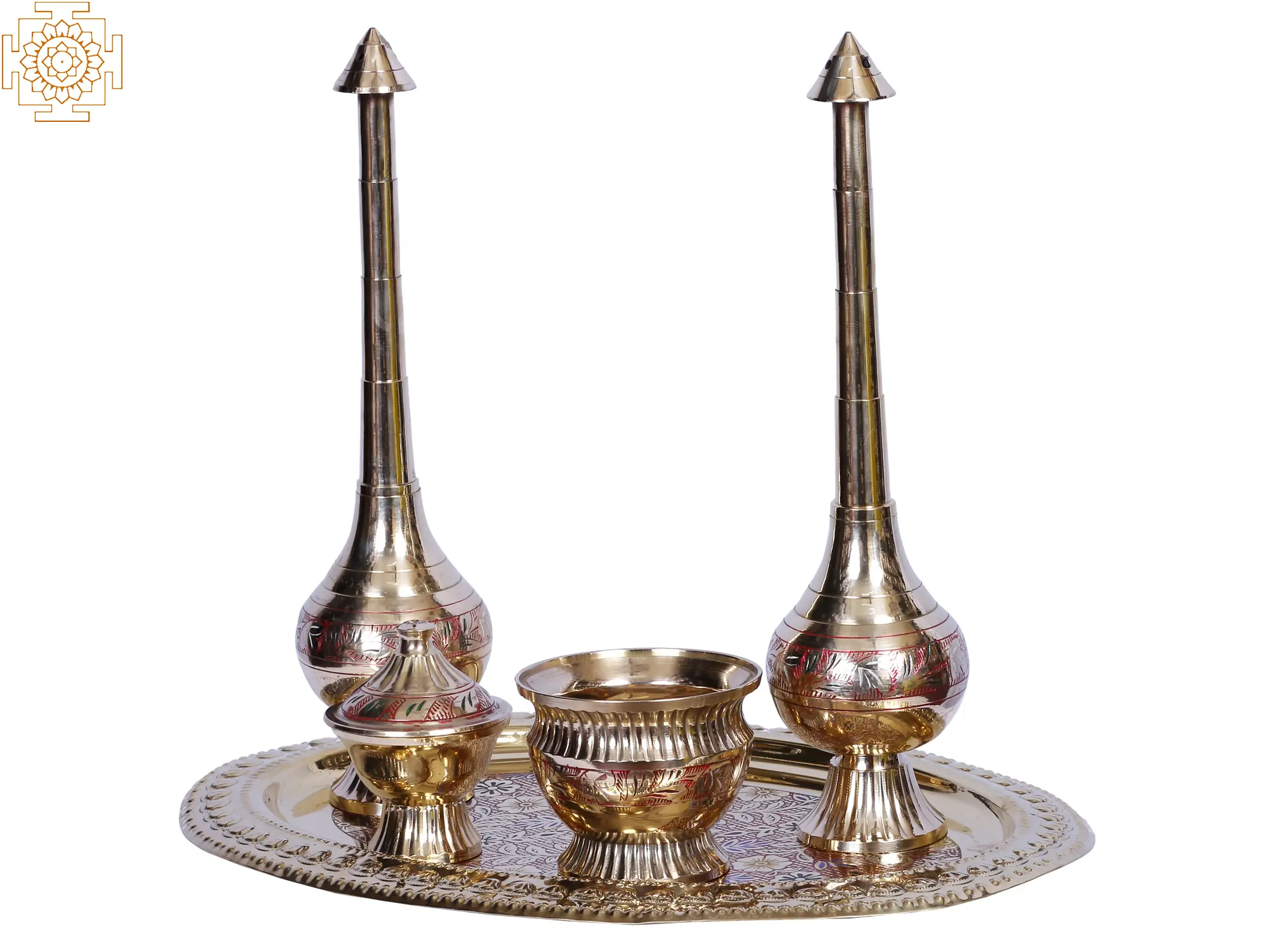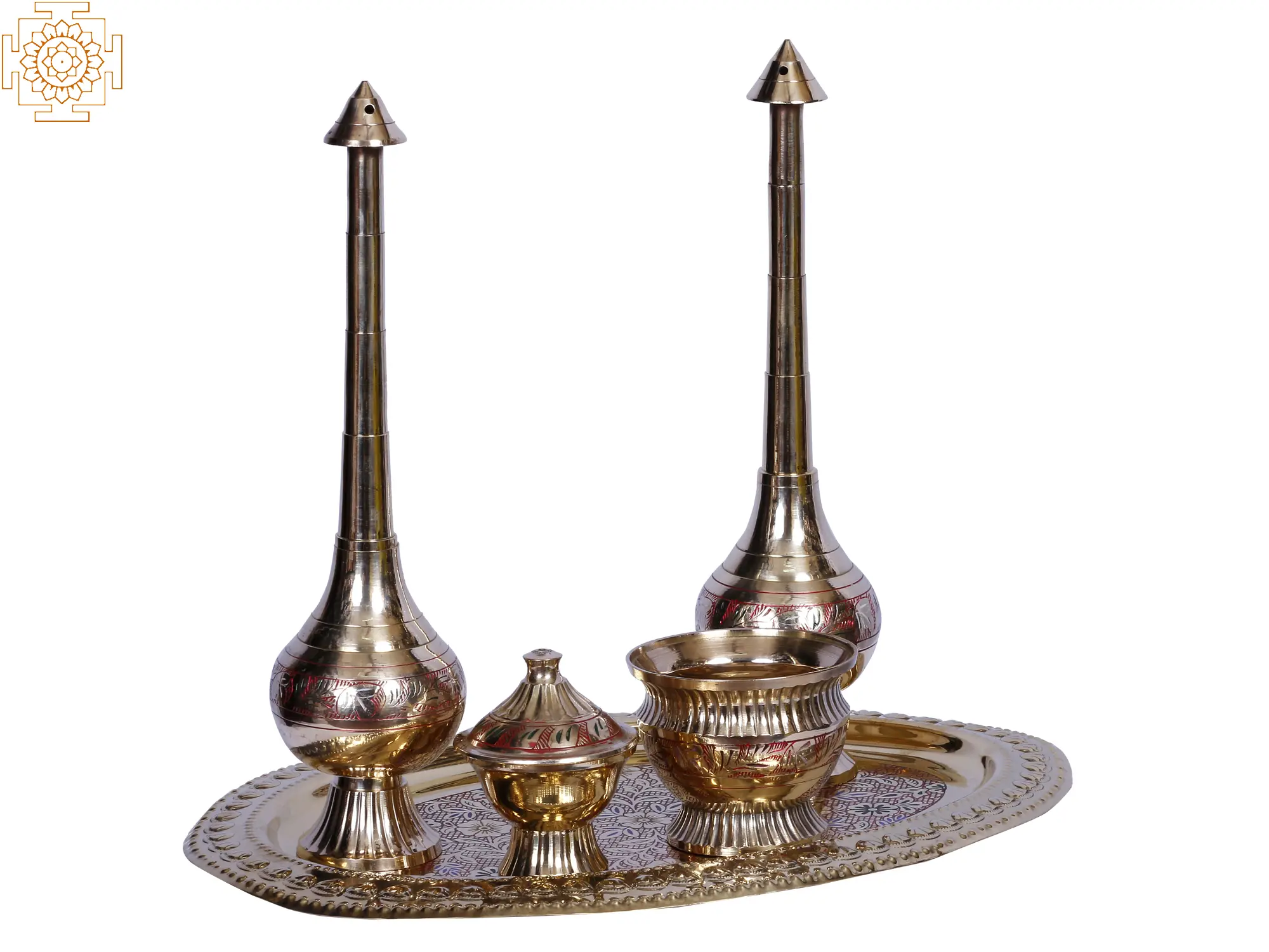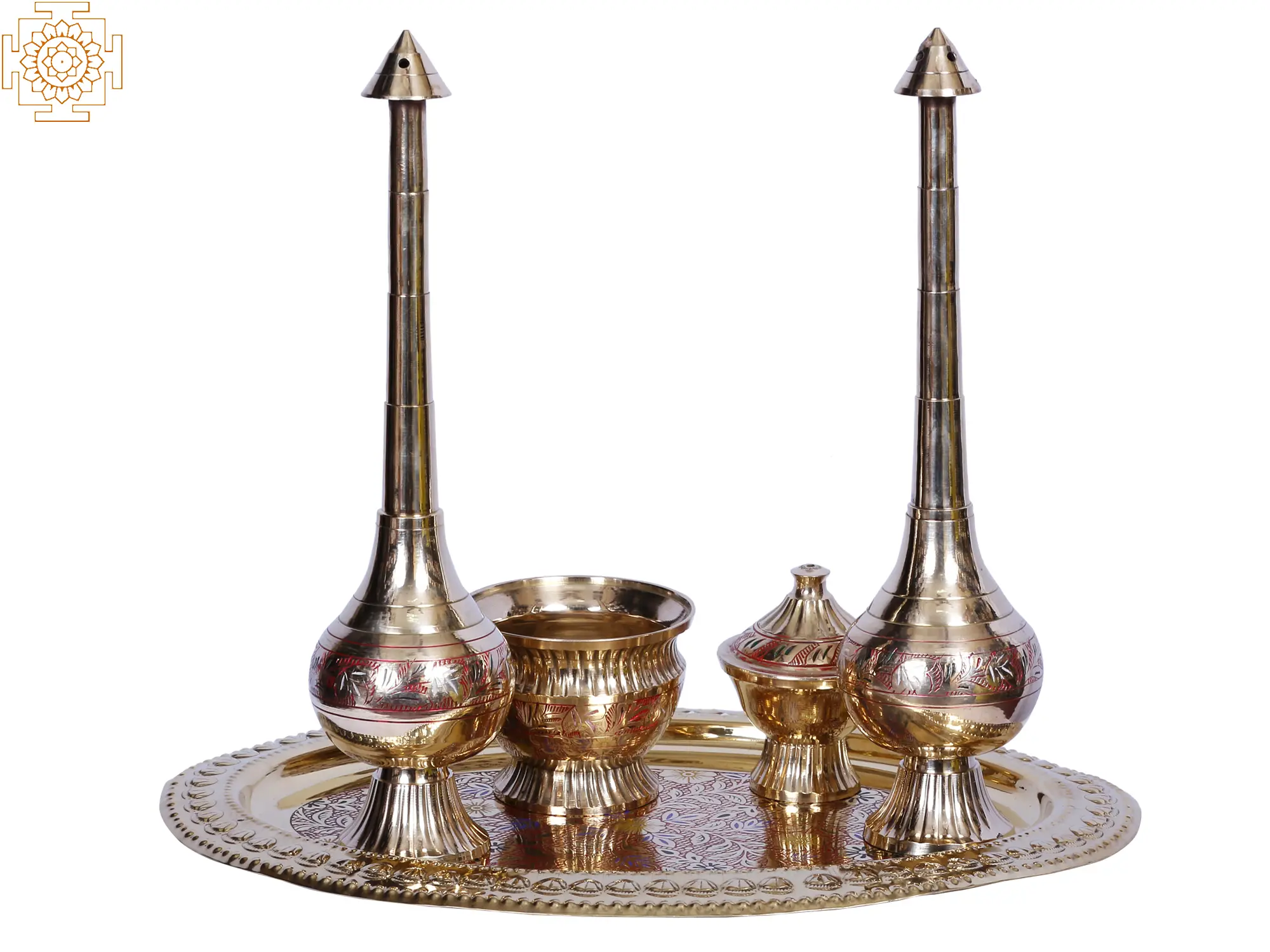 This brass Panner set includes two Rosewater sprinklers with small openings on the elevated neck attached to a small container at the bottom, also known as Gulab Dani, a Kumkum Patra, and a Ganga Jal Lota. The practice of sprinkling rosewater is centuries old and is done to offer guests a cooling and pleasant sensation. Mango leaves are sprinkled on the Ganga Jal to cleanse their bodies of any malevolent energy. They are then blessed with Kumkum on their forehead and permitted to enter the sacred sanctuary where a marriage or other auspicious ritual is taking place. This Panner set is used to greet visitors at wedding ceremonies. This set of ceremonial artifacts preserves an age-old custom of introducing a holy atmosphere.