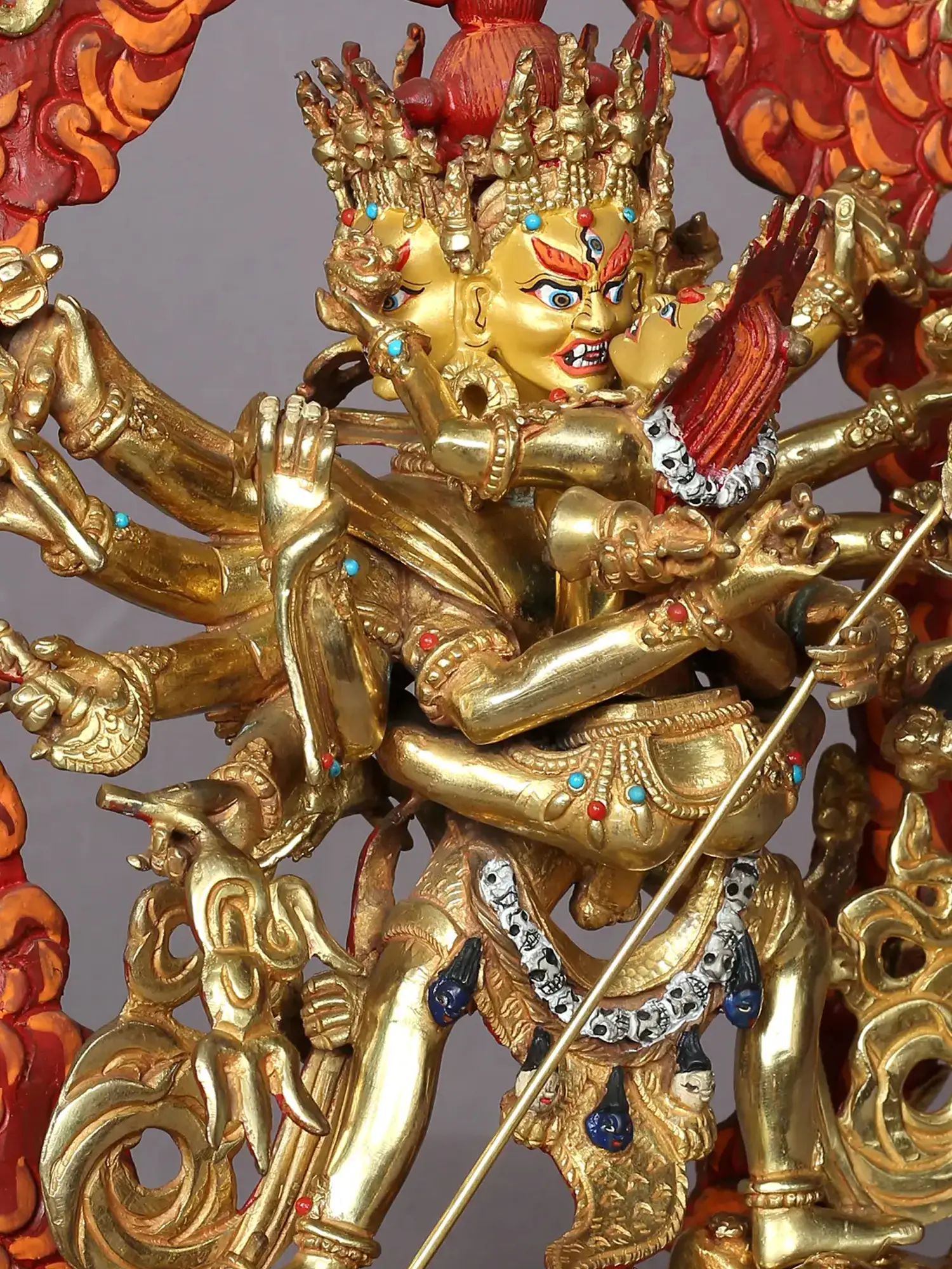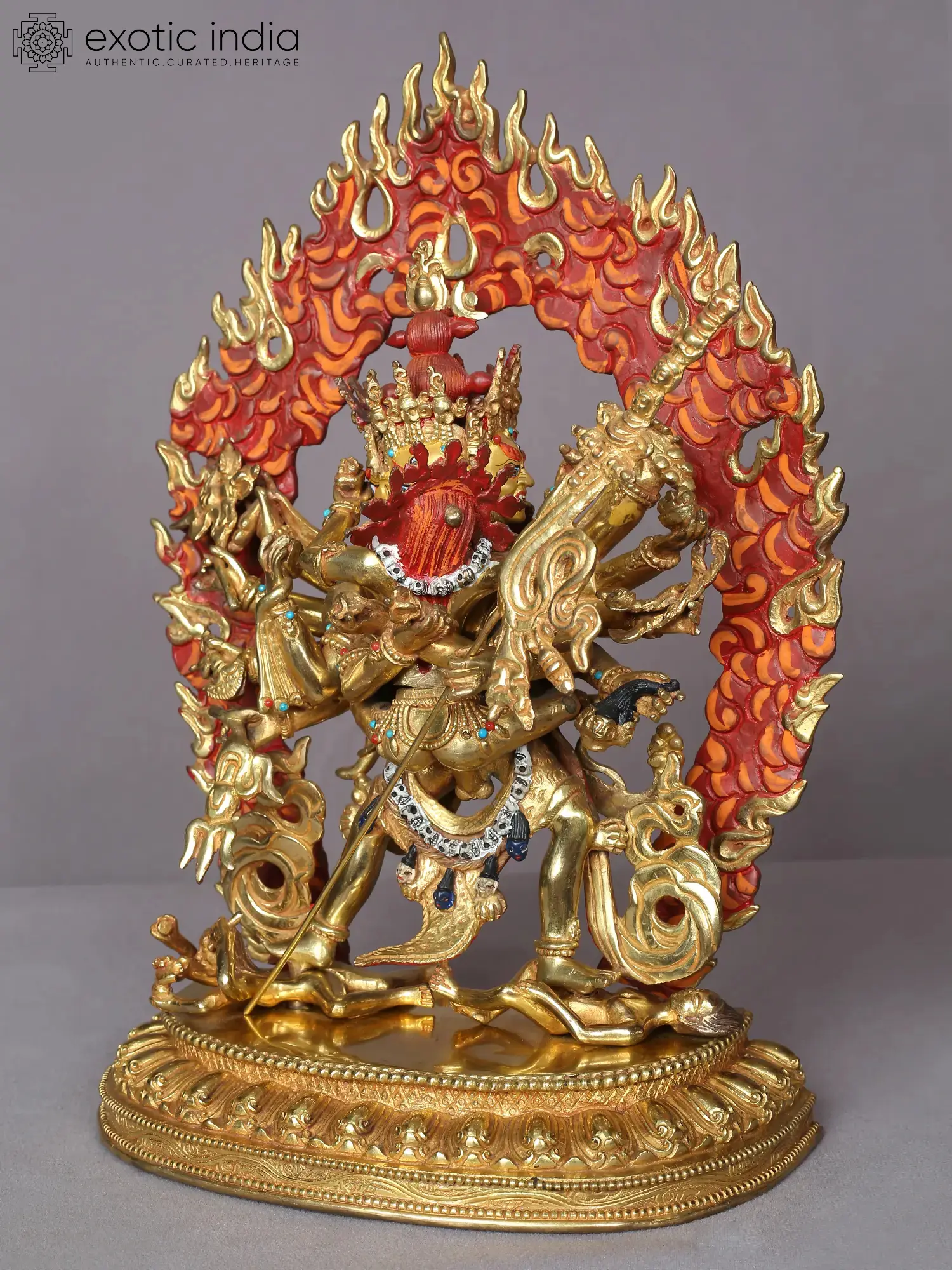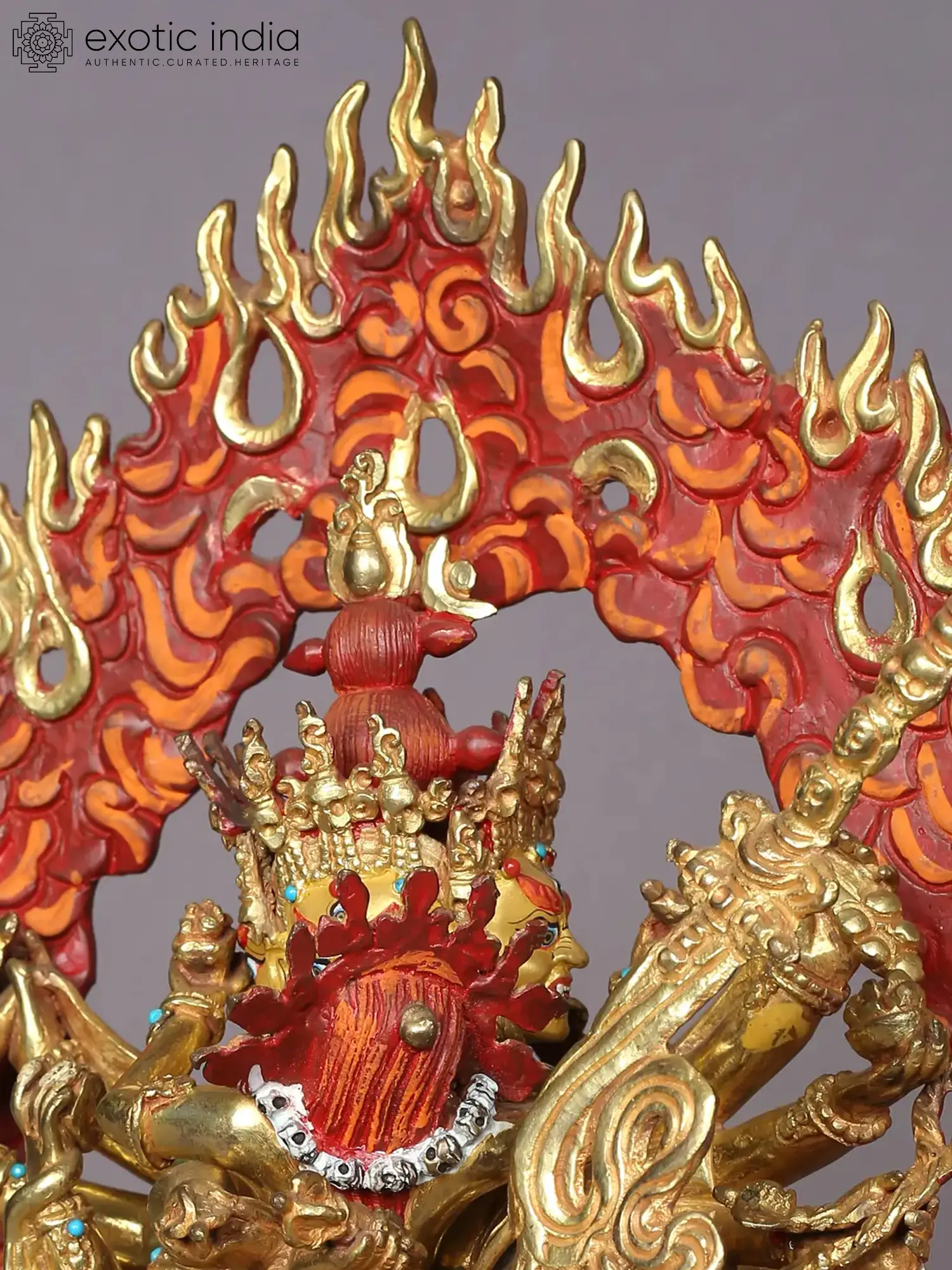 In Vajrayana Buddhism, Chakrasamvara or Khorlo Dompa (Tibetan) is a Tantric manifestation of the Enlightened One's power that is evoked once a disciple has gained oneness with the divine wisdom of Tathagata. The powerful Yab-Yum (father-mother) element of Chakrasamvara is depicted in this gilded copper statue from Nepal along with his Shakti-Vajrayogini. He is placed on a lotus pedestal and exudes an awe-inspiring force which is highlighted by the enflamed aureole that surrounds him.