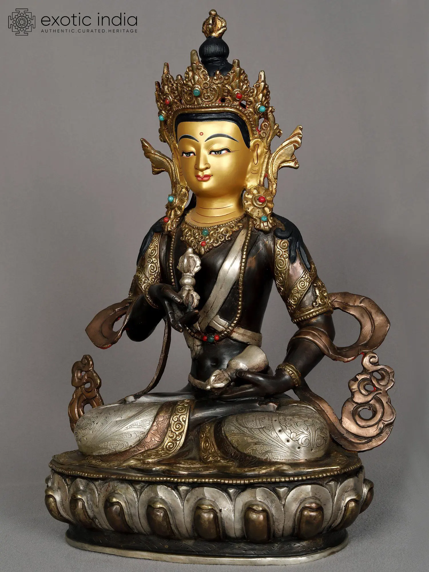 Radiant in pristine copper-gold, Vajrasattva belongs to the Aksobhya Vajra family, a lineage that also houses Vajrapani. Typically portrayed as a serene youth, he dons resplendent silks and jewels reminiscent of an opulent prince.