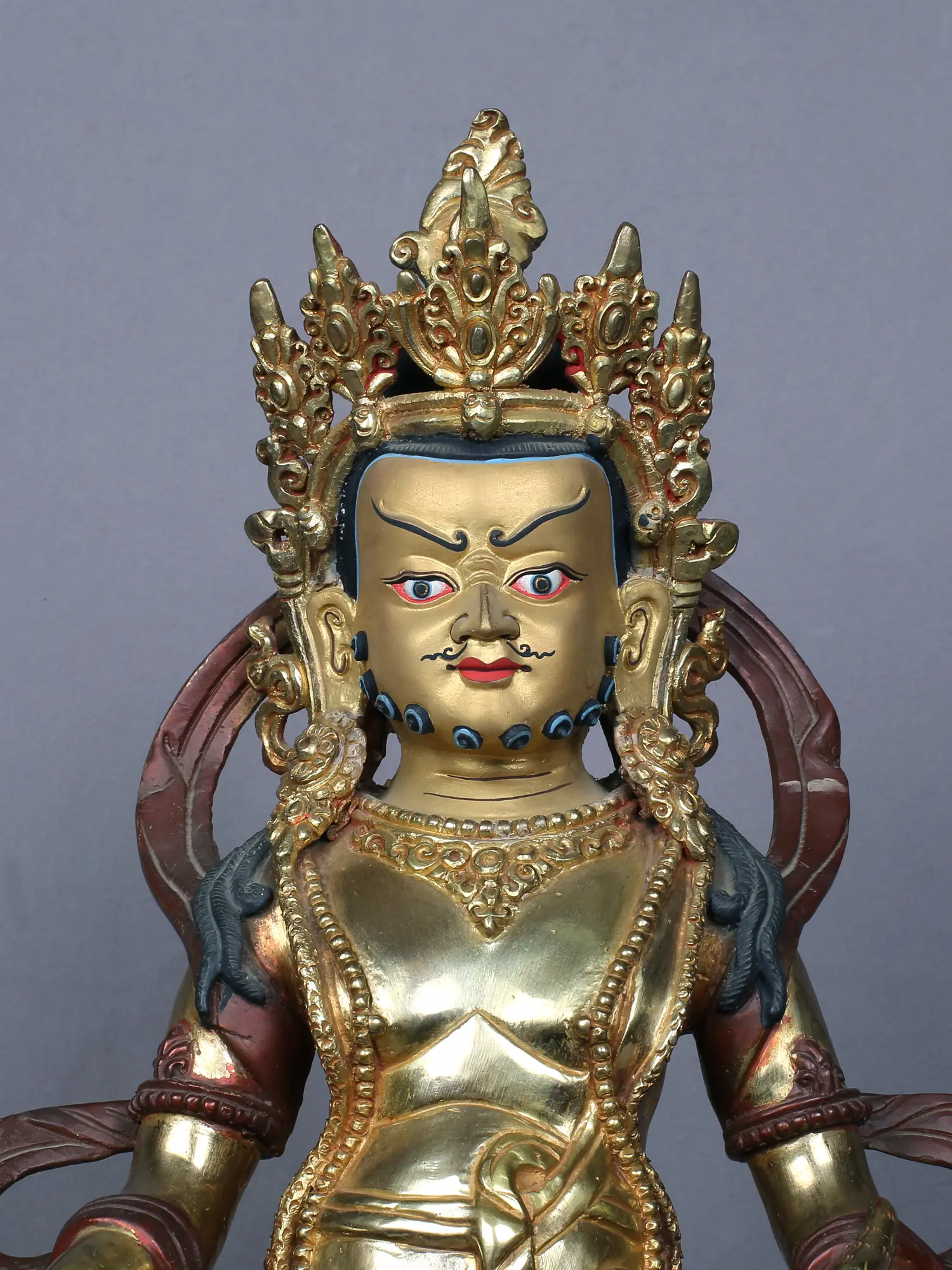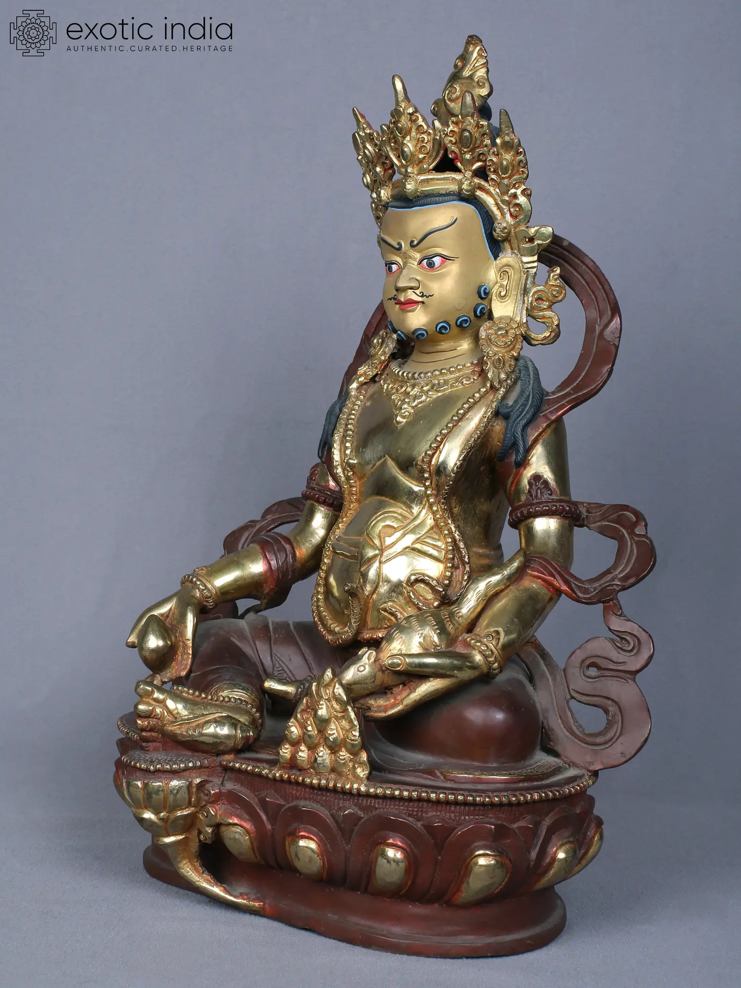 Kubera or Jambhala in Buddhist tradition is a warrior king and protector of the North, who bestows worldly treasures on his devotees. His protective and fierce gaze guards the people of the Himalayan region from disasters of daily and spiritual life. This beautiful copper statue from Nepal presents Lord of North, Kubera in his characteristic form, sitting on a lotus throne in the royal Maharajalalisana, extending one leg forward, placed on a smaller lotus. He wears an ornate crown with floral and conch motifs, earrings, beaded necklaces, waistcloth, and a dhoti highlighted by the rustic hue of brown and gold outlines.