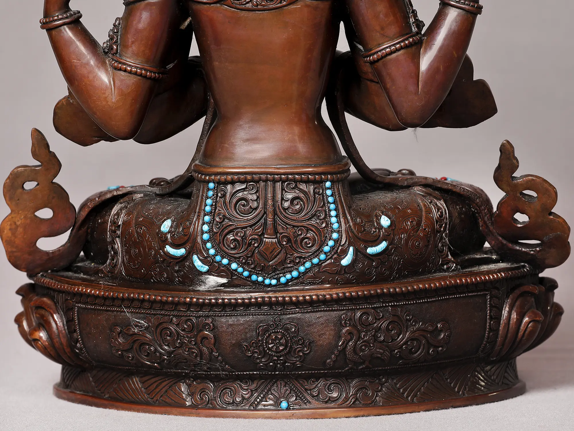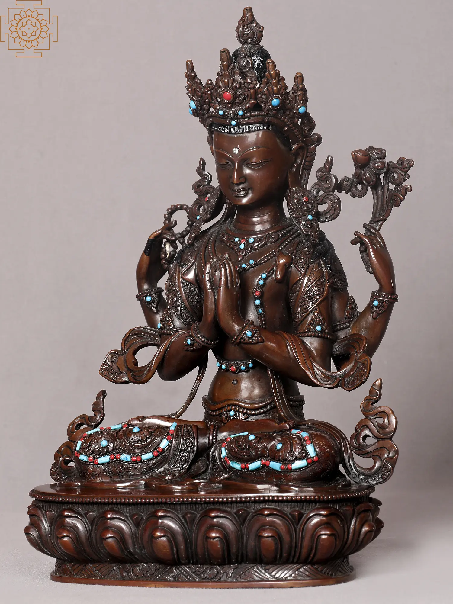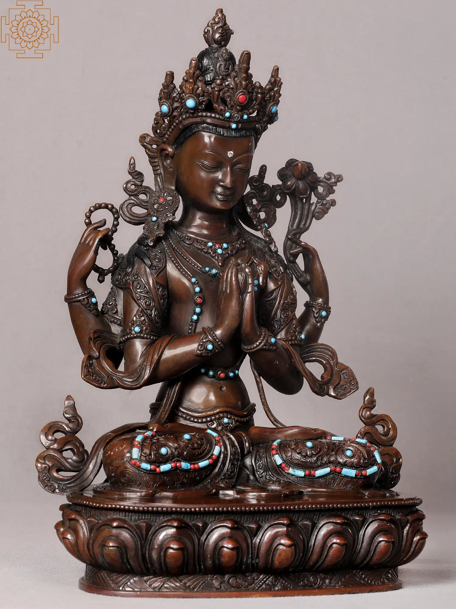 Step into the heavenly presence of Tibetan Buddhist kindness personified, Chenrezig. Bodhisattva Chenrezig is seen with a thousand arms, each of which is compassionately extended and has an eye in the palm, keeping watch over the suffering of all sentient beings. Chenrezig exudes tranquil compassion and is kind, majestic, and adoring. She wears regalia appropriate for a bodhisattva.