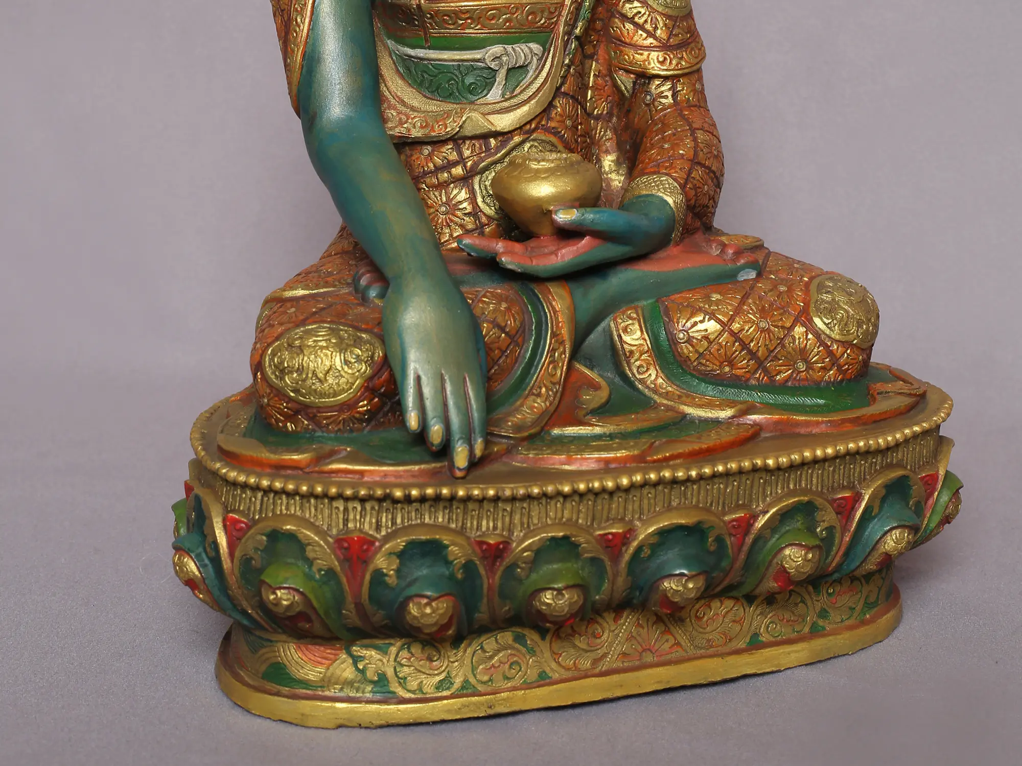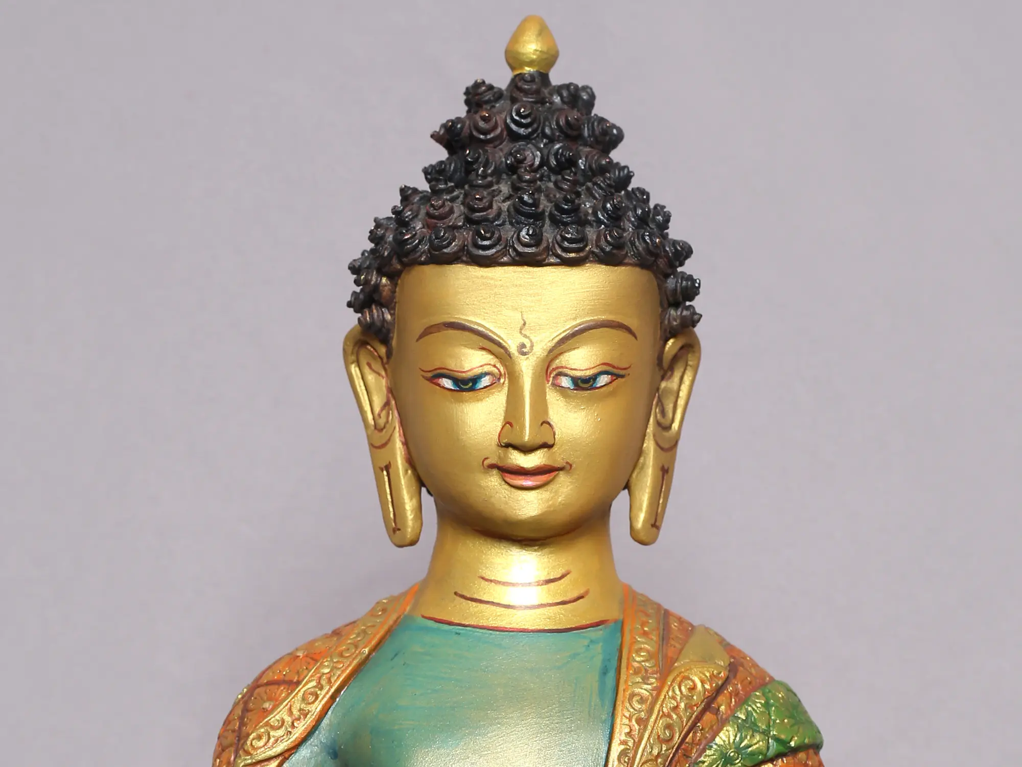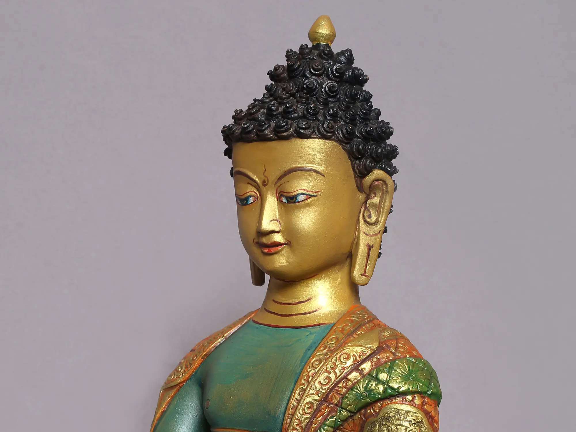 The Shakyamuni Buddha is a profound symbol of enlightenment, compassion, and serenity. Crafted with meticulous attention to detail, these statues depict the Sakhyamuni Buddha in Bhumisparsha (Earth touch), symbolizing the Buddha's enlightenment under the bodhi tree. The serene countenance, closed eyes, and gentle smile represent the tranquility attained through enlightenment. The elongated earlobes symbolize wisdom and the ability to hear the suffering of the world. The Ushnisha, a protuberance on the head, signifies spiritual awakening.
