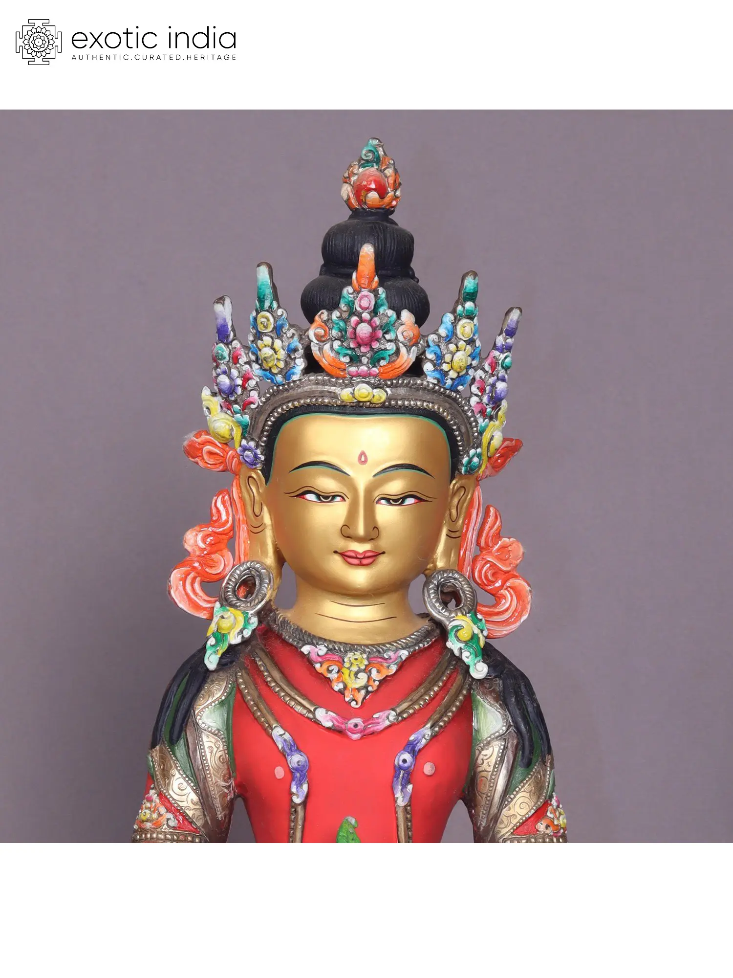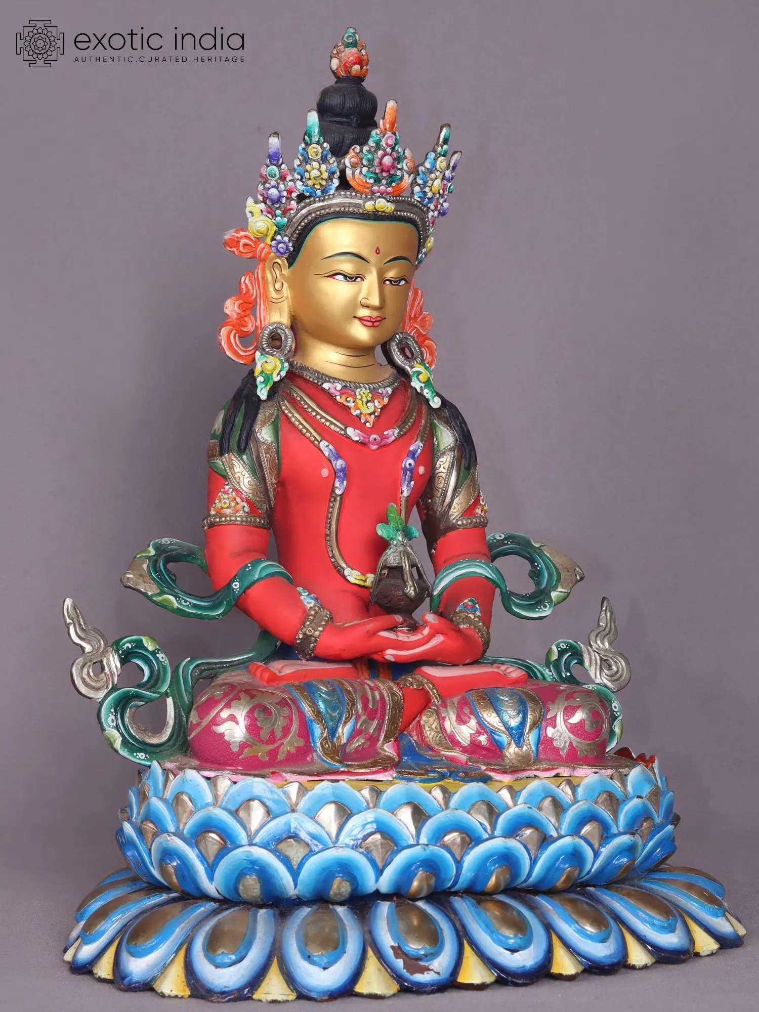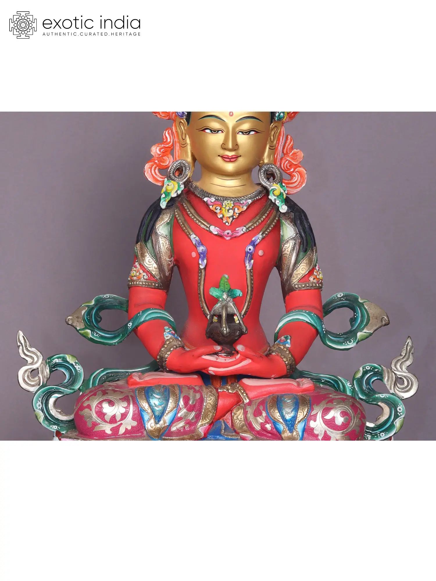 The Aparmita statue showcases the enlightened figure seated in a serene padmasana, the full lotus posture, with the right leg atop the left. In the cradle of his lap, he holds a vessel known as the "amrita," symbolizing the essence of immortality. Within the realm of Tibetan Buddhism, the concept of longevity holds deep significance, and Aparmita plays a pivotal role in rituals dedicated to extending one's life.