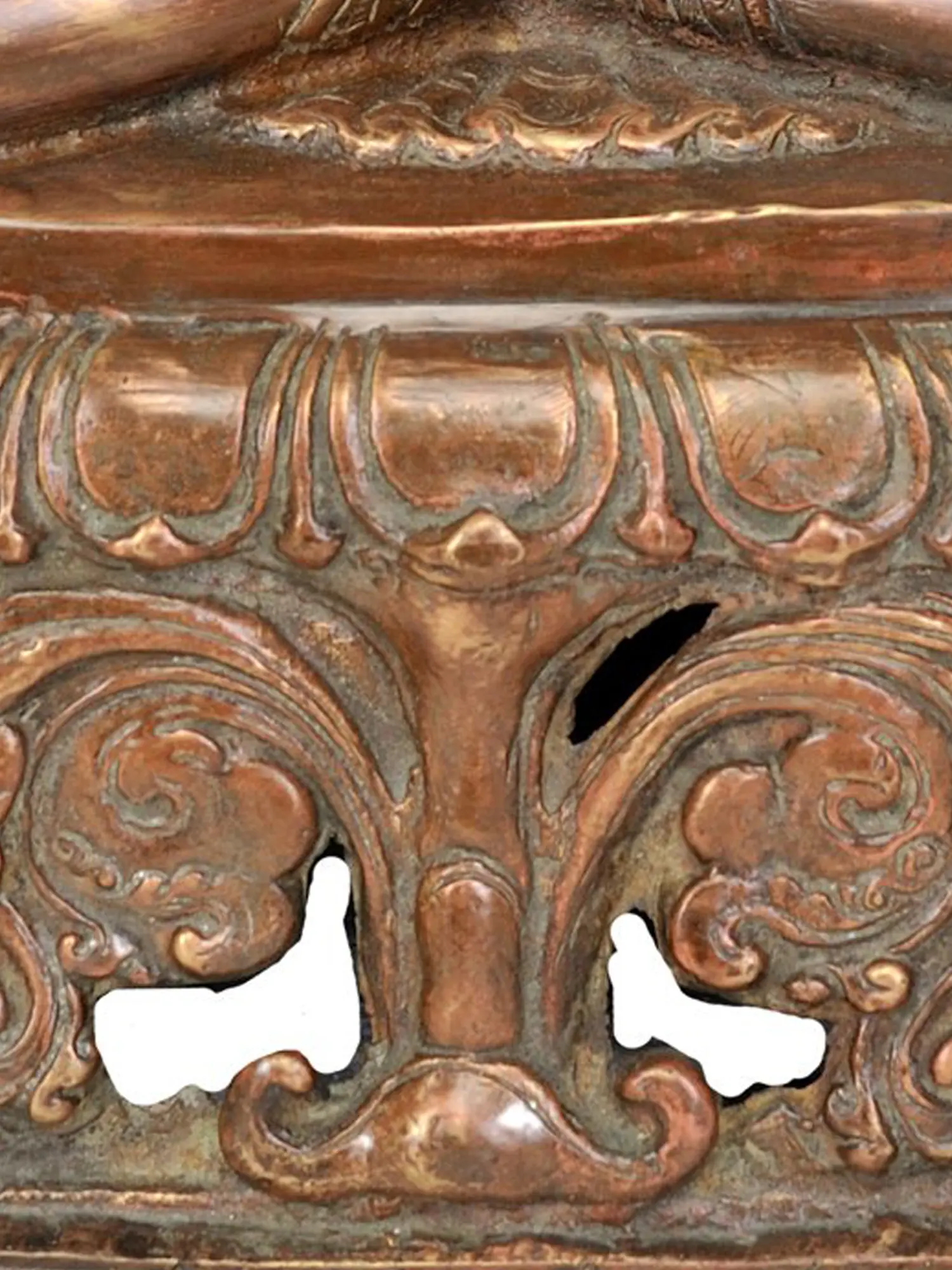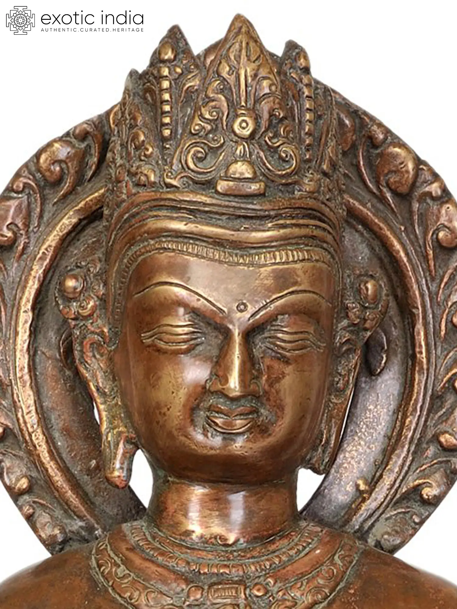 Hand-crafted by skilled artisans in India, this brass statue is a testament to centuries-old metalworking techniques. The patina of the brass lends a timeless quality to the sculpture, hinting at the ancient lineages of craftsmanship that have preserved these artistic forms. The base of the sculpture is a masterpiece in itself, featuring intricate carvings of swirling floral motifs and mythological figures. These decorative elements often carry symbolic meaning in Buddhist art, representing the flourishing of Dharma and the protective forces that guard the spiritual path. The detailed rendering of the figures on the base adds a narrative depth, inviting contemplation on the various facets of the Buddhist cosmology. This piece is not merely a decorative object but a sacred representation, designed to inspire devotion and facilitate meditation. Its presence can transform a space into a sanctuary of peace and spiritual reflection, bringing the ancient wisdom and serene presence of the Buddha into the modern world.