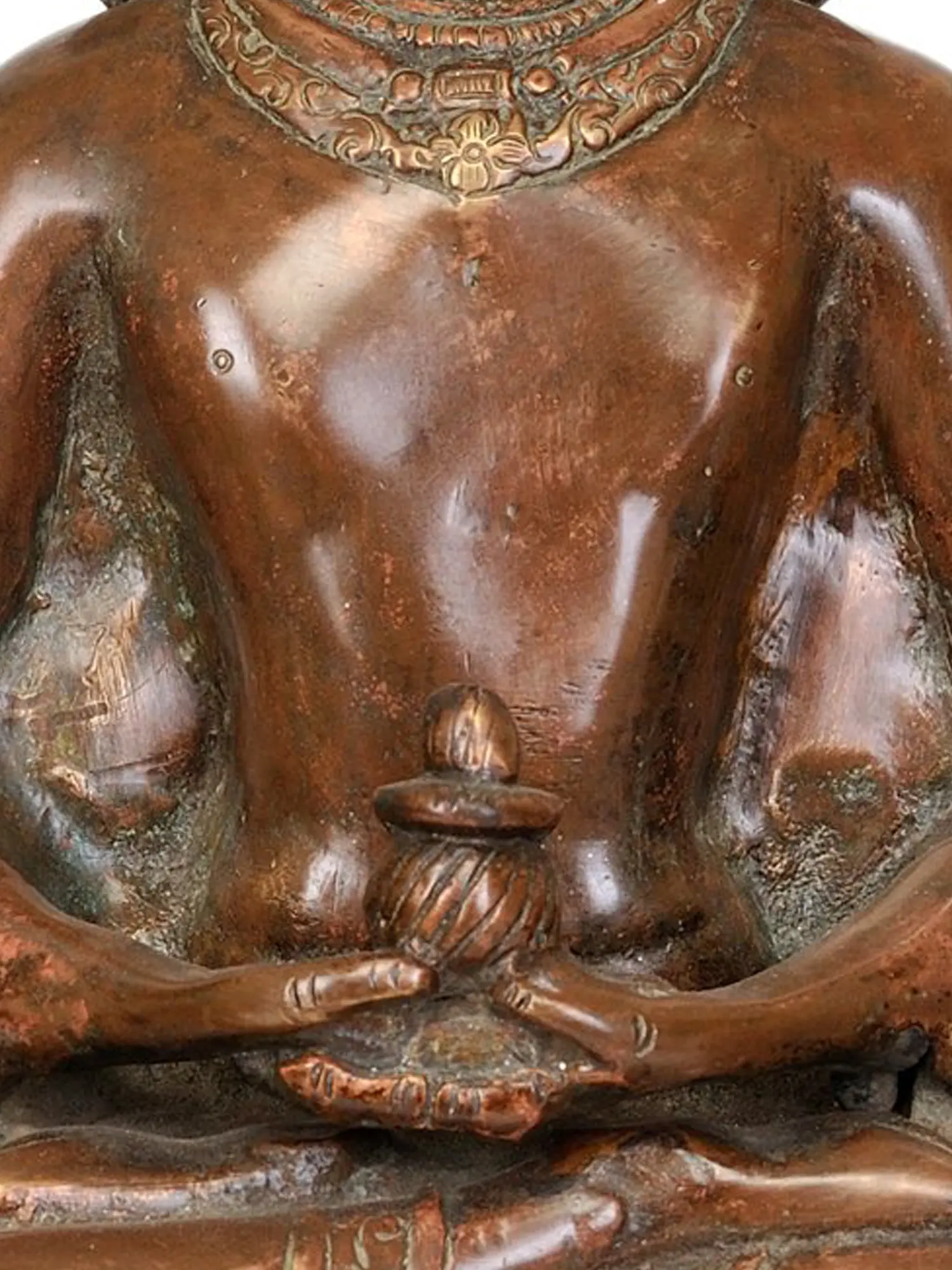 This exquisite brass sculpture captures the profound serenity and regal bearing of the Buddha, rendered in a style that speaks to the rich artistic traditions of India, specifically with a strong resonance to Tibetan Buddhist iconography. The Buddha is depicted in the classic lotus posture, a symbol of purity and spiritual elevation, as he sits in deep meditation. His hands are held in the *dhyana mudra*, the gesture of concentration and meditation, cradling an alms bowl, signifying his renunciation of worldly possessions and his path of asceticism.